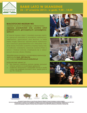 BABIE LATO W SKANSENIE 23 – 27 września 2013 r. w godz. 9.00 – 14.00 BIAŁOSTOCKIE MUZEUM WSI Oddział Muzeum Podlaskiego w Białymstoku zaprasza przedszkolaki oraz uczniów szkół podstawowych, gimnazjalnych i ponadgimnazjalnych W trakcie imprezy dzieci i młodzież poznają niektóre z ginących zawodów tj. kowalstwo, sokolnictwo, wikliniarstwo, garncarstwo oraz tkactwo, a także będą mogły zobaczyć typowe prace wykonywane w dawnym gospodarstwie m.in. młócenie i mielenie zboża. Ponadto uczestnicy imprezy będą mieli możliwość zwiedzenia czasowej wystawy Ptaki w sztuce i tradycji ludowej, znajdującej się w zabytkowym dworze z Bobry Wielkiej. Wszystkie grupy prosimy o wcześniejszą rezerwację telefoniczną kom. 509 336 816 lub mailową [email protected] DODATKOWE ATRAKCJE dla chętnych rozpalone zostanie ognisko (prowiant własny)- prosimy o wcześniejsze zgłoszenia możliwość skorzystania z przejażdżki konnej w siodle 5 zł/os. lub przejazdu bryczką 3 zł/os. (zapisy pod nr tel. 791-10-50-69)