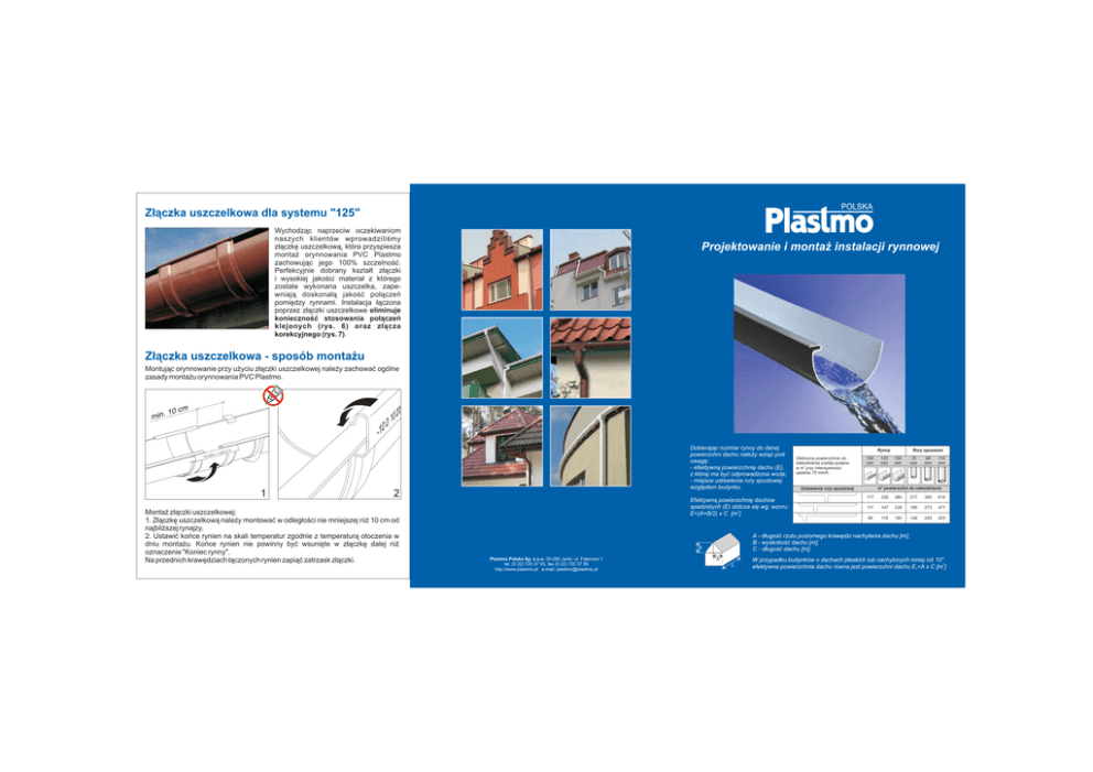 Z³¹czka uszczelkowa dla systemu "125" Wychodz¹c naprzeciw oczekiwaniom naszych klientów wprowadziliœmy z³¹czkê uszczelkow¹, która przyspiesza monta¿ orynnowania PVC Plastmo zachowuj¹c jego 100% szczelnoœæ. Perfekcyjnie dobrany kszta³t z³¹czki i wysokiej jakoœci materia³ z którego zosta³a wykonana uszczelka, zapewniaj¹ doskona³¹ jakoœæ po³¹czeñ pomiêdzy rynnami. Instalacja ³¹czona poprzez z³¹czki uszczelkowe eliminuje koniecznoœæ stosowania po³¹czeñ klejonych (rys. 6) oraz z³¹cza korekcyjnego (rys. 7). Projektowanie i monta¿ instalacji rynnowej Z³¹czka uszczelkowa - sposób monta¿u KL EJ Montuj¹c orynnowanie przy u¿yciu z³¹czki uszczelkowej nale¿y zachowaæ ogólne zasady monta¿u orynnowania PVC Plastmo. 1 Dobieraj¹c rozmiar rynny do danej powierzchni dachu nale¿y wzi¹æ pod uwagê: - efektywn¹ powierzchniê dachu (E), z której ma byæ odprowadzona woda; - miejsce ustawienia rury spustowej wzglêdem budynku. 2 Monta¿ z³¹czki uszczelkowej: 1. Z³¹czkê uszczelkow¹ nale¿y montowaæ w odleg³oœci nie mniejszej ni¿ 10 cm od najbli¿szej rynajzy. 2. Ustawiæ koñce rynien na skali temperatur zgodnie z temperatur¹ otoczenia w dniu monta¿u. Koñce rynien nie powinny byæ wsuniête w z³¹czkê dalej ni¿ oznaczenie "Koniec rynny". Na przednich krawêdziach ³¹czonych rynien zapi¹æ zatrzask z³¹czki. Efektywn¹ powierzchniê dachów spadzistych (E) oblicza siê wg. wzoru: 2 E=(A+B/2) x C [m ] 100 mm 125 mm Rury spustowe 150 mm 75 mm 90 mm 110 mm m2 powierzchni do odwodnienia Ustawienia rury spustowej 177 235 380 217 355 614 111 147 238 166 273 471 89 118 190 149 245 423 A - d³ugoœæ rzutu poziomego krawêdzi nachylenia dachu [m]; B - wyskokoœæ dachu [m]; C - d³ugoœæ dachu [m]; B Plastmo Polska Sp. z o.o. 05-090 Janki, ul. Falencka 1 tel. (0 22) 720 37 93, fax (0 22) 720 37 95 http://www.plastmo.pl e-mail: [email protected] Rynny Obliczone powierzchnie do odwodnienia zosta³y podane 2 w m przy intensywnoœci opadów 75 mm/h. A C W przypadku budynków o dachach p³askich lub nachylonych mniej ni¿ 10° 2 efektywna powierzchnia dachu równa jest powierzchni dachu E1=A x C [m ] 1 2 cm 2.1 2.2 2 cm L . 60 max max. 60 cm 3 4 cm 1/3 L u adk k sp Monta¿ rynajz: ku spad nek Kieru Wyznaczyæ miejsce spustu i zamontowaæ sztucer. Szczegó³owa instrukcja monta¿u do³¹czona jest do ka¿dego sztucera. 6 .1 min £¹czenie rynien: Na z³¹czkê ³¹cz¹c¹ rynny na³o¿yæ paski kleju o szerokoœci ok. 0,5 cm ka¿dy. 11 8 2 cm 7 Monta¿ rynien: Podgrzaæ koñce obydwu rynien montowanych w sztucerze i wykonaæ "kapinosy". Zamontowaæ rynny w sztucerze i rynajzach. Na skali temperatur wewn¹trz sztucera ustawiæ koñce rynien zgodnie z temperatur¹ otoczenia w dniu monta¿u. Nie u¿ywaæ kleju. STOPER 10 9 2 cm 0 cm Ze wzglêdu na naturaln¹ pracê rynien z³¹czkê nale¿y montowaæ min. 10 cm od rynajzy. Miejsce styku ³¹czonych rynien wype³niæ klejem. 12 Z³¹cze korekcyjne stosowaæ w przypadku gdy: - odleg³oœæ pomiêdzy sztucerami jest wiêksza ni¿ 15 m, - odleg³oœæ pomiêdzy naro¿nikami jest wiêksza ni¿ 6 m i nie wystêpuje pomiêdzy nimi sztucer, Szczegó³owa instrukcja monta¿u do³¹czona jest do ka¿dego z³¹cza korekcyjnego. Na skali temperatur wewn¹trz z³¹cza ustawiæ koñce rynien z przyklejonymi do nich deklami. Nie u¿ywaæ kleju do monta¿u obudowy z³¹cza. 13 Monta¿ naro¿nika: Na³o¿yæ na naro¿nik paski kleju o szerokoœci ok. 0,5 cm ka¿dy i za³o¿yæ na rynnê. Miejsce wewn¹trz styku rynien z naro¿nikiem wype³niæ klejem. Wkleiæ stopery. Klej na³o¿yæ na drugie ramie naro¿nika i zamontowaæ w nim rynnê. 16 15 EJ 5 Monta¿ sztucera: Rynajzy uniwersalne nale¿y montowaæ do konstrukcji dachu w odstêpach max. co 60 cm. Za pomoc¹ sznurka wyznaczyæ spadek w kierunku spustu (min. 2 cm na 10 mb rynny). KL Prawid³owo zamontowane rynny Plastmo. Rynajzy plastikowe montuje siê do deski czo³owej max. co 60 cm. Za pomoc¹ sznurka wyznaczyæ spadek w kierunku spustu (min. 2 cm na 10 mb rynny). KL EJ ne Kieru 14 KL EJ STOPER min . 2,5 cm Monta¿ kolan: Monta¿ dekla: Na dekiel na³o¿yæ pasek kleju o szerokoœci ok. 0,5 cm. Miejsce styku rynna-dekiel wype³niæ klejem. min. 2cm Zachowaæ odleg³oœæ min. 2,5 cm od deski bocznej dachu. Wkleiæ stoper. Kolano górne przykleiæ do sztucera. Kolano dolne nale¿y ³¹czyæ z górnym bez u¿ycia kleju zawsze poprzez odpowiedniej d³ugoœci odcinek rury spustowej. Monta¿ rury spustowej: Rurê spustow¹ nale¿y montowaæ za pomoc¹ uniwersalnych obejm kompensuj¹cych rozszerzalnoœæ termiczn¹. Szczegó³owa instrukcja monta¿u obejm znajduje siê na ka¿dym opakowaniu. Nie u¿ywaæ kleju. £¹czenie rur spustowych: Rury spustowe ³¹czone s¹ za pomoc¹ mufy. Zachowaæ min. 2 cm luzu. Nie u¿ywaæ kleju. Zakoñczenie rury spustowej: System rynnowy mo¿na zakoñczyæ wylewk¹ przyklejon¹ do rury spustowej lub ko³nierzem kanalizacyjnym zak³adanym na rurê profilowan¹.
