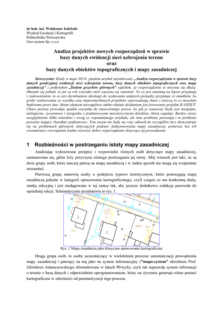 dr hab. inż. Waldemar Izdebski Wydział Geodezji i Kartografii Politechnika Warszawska Geo-system Sp. z o.o. Analiza projektów nowych rozporządzeń w sprawie bazy danych ewidencji sieci uzbrojenia terenu oraz bazy danych obiektów topograficznych i mapy zasadniczej Streszczenie: Kiedy w maju 2013r. pisałem artykuł zatytułowany „Analiza rozporządzenia w sprawie bazy danych geodezyjnej ewidencji sieci uzbrojenia terenu, bazy danych obiektów topograficznych oraz mapy zasadniczej” z podtytułem „Siedem grzechów głównych” sądziłem, że rozporządzenie to utrzyma się dłużej. Okazało się jednak, że już za rok wszystko znów zaczyna się zmieniać. To co jest zamianą na lepsze przyjmuję z zadowoleniem, to co jest dorabianiem ideologii do wydawania unijnych pieniędzy przyjmuje ze smutkiem, bo próby realizowania za wszelka cenę nieprzemyślanych projektów wprowadzają chaos i niszczą to co mozolnie budowano przez lata. Moim zdaniem niewątpliwie takim właśnie działaniem jest forsowanie projektu K-GESUT. Chaos prawny powoduje spadek szacunku do stanowionego prawa, bo jak je szanować kiedy jest niespójne, nielogiczne, życzeniowe i niezgodne z podstawowymi merytorycznymi dziedziny, którą reguluje. Bardzo cieszy uwzględnienie kilku wniosków i uwag ze wspomnianego artykułu, ale inne problemy pozostają i to problemy poważne mające charakter podstawowy. Tym razem nie będę się więc odnosił do szczegółów lecz skoncentruje się na problemach głównych, dotyczących podstaw funkcjonowania mapy zasadniczej, ponieważ bez ich zrozumienia i rozwiązania trudno stworzyć dobre rozporządzenie dotyczące jej prowadzenia. 1 Rozbieżności w postrzeganiu istoty mapy zasadniczej Analizując wykreowane przepisy i wypowiedzi różnych osób dotyczące mapy zasadniczej, zastanawiam się, gdzie leży przyczyna różnego postrzegania jej istoty. Mój wniosek jest taki, że są dwie grupy osób, które inaczej patrzą na mapę zasadniczą i w żaden sposób nie mogą się wzajemnie zrozumieć. Pierwszą grupę stanowią osoby o podejściu typowo teoretycznym, które postrzegają mapę zasadniczą jedynie w kategorii opracowania kartograficznego, czyli czegoś co ma konkretną skalę, ramkę sekcyjną i jest zredagowane w tej ramce tak, aby jeszcze dodatkowo redakcja pasowała do sąsiedniej sekcji. Schematycznie przedstawia to rys. 1. Rys. 1 Mapa zasadnicza jako klasyczne opracowanie kartograficzne Druga grupa osób, to osoby uczestniczący w wieloletnim procesie automatyzacji prowadzenia mapy zasadniczej i patrzący na nią jako na system informacyjny (”mapa-system” określenie Prof. Zdzisława Adamczewskiego sformułowane w latach 90-tych), czyli tak naprawdę system informacji o terenie z bazą danych i odpowiednim oprogramowaniem, który na życzenie generuje różne postaci kartograficzne w zależności od parametryzacji tego procesu. Rys. 2 Mapa zasadnicza jako system informacyjny Pierwszy sposób postrzegania jest bardzo uproszczony, nie uwzględnia czynnika czasu i rozwoju technologii. Owszem tak było kiedy mapa była wykonywana na papierze, na którym po pomiarze, wykorzystując znaki umowne przedstawiano sytuacje terenową. Instrukcje określały co i jak mierzyć i jak przedstawiać graficznie. W tamtych czasach mówiło się, że „efektem pracy geodety jest mapa”. Czasy się zmieniały i dalej w obowiązujących przepisach zapisane było co mierzyć i jak przedstawiać, ale w wyniku rozwoju technologii, z jednej strony pomiar był automatyzowany, a z drugiej w jego wyniku gromadzono współrzędne obiektów terenowych, które wprowadzano do baz danych różnych systemów informatycznych. Cechą wspólną tych systemów było (i jest) to, że potrafią zgromadzone dane przedstawić w postaci mapy jak i innych wizualizacji. Rys. 3 Przykłady wizualizacji danych przestrzennych w systemie GEO-MAP Czyli na postawie zapisów prawa określających treść mapy zasadniczej, prowadzono odpowiednie bazy danych, z których taką mapę można było generować. W takiej sytuacji można powiedzieć, że „efektem pracy geodety nie jest już tradycyjna mapa lecz baza danych”. Baza danych, tak jak kiedyś mapa, jest aktualizowana zgodnie z obowiązującymi przepisami, ale na jej podstawie możemy generować różnorodne mapy zarówno co do treści jaki i skali. Aby spełnić wszystkie oczekiwania od mapy zasadniczej jako ”mapy-systemu” należy do prezentacji graficznej użyć odpowiedniej biblioteki znaków umownych, a w bazie danych systemu przewidzieć miejsce na przechowywanie dodatkowych informacji dotyczących zredagowania prezentacji graficznej tych danych, takich jak: etykiety, odnośniki i inne elementy pomocnicze, bo w przeciwnym wypadku uzyskiwany obraz samych pomiarów jest mało zadowalający (rys. 4a i 4b). Rys. 4 Prezentacja graficzna a) bez znaków umownych i redakcji, b) pełna prezentacja graficzna Zapamiętanie elementów redakcyjnych jest konieczne, aby nie dokonywać później każdorazowego przeredagowywania treści mapy, kiedy elementy zaczynają się zasłaniać czyniąc obraz nieczytelnym. Zwiększa to oczywiście objętość danych, ale zachowuje redakcję na cały okres użytkowania danych. W przypadku etykiet do uzyskania oczekiwanego efektu prezentacji najlepiej umożliwić stosowanie ich wiele instancji dla danego obiektu oraz przechowywać indywidualne parametry dla każdej z tych instancji, co w efekcie daje bardzo szerokie możliwości prezentacyjne. Rys. 5 Ilustracja wielu instancji tej samej etykiety Dodatkowo powinna istnieć możliwość powiązania z każdą etykietą odnośnika, który precyzyjnie wskazuje miejsce, do którego etykieta się odnosi oraz indywidualnej wysokości tekstu i sposobu justowania tekstu. Odnośnik powinien być niezależny w każdej instancji etykiety i powinien mieć możliwość definiowania jako lewostronny lub prawostronny. Przykładowe parametry prezentacyjne etykiety przedstawiono na r