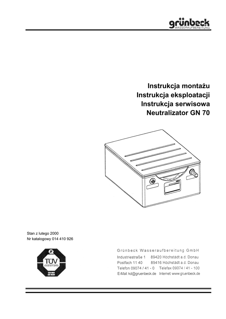Instrukcja montażu Instrukcja eksploatacji Instrukcja serwisowa Neutralizator GN 70 Stan z lutego 2000 Nr katalogowy 014 410 926 Neutralizator GN 70 Spis treści A Wskazówki ogólne ............................................................ 2 1 2 3 4 5 Wstęp Gwarancja Ogólne wskazówki bezpieczeństwa Transport i składowanie Utylizacja części złomowanych i materiałów eksploatacyjnych B Podstawowe informacje ................................................... 5 1 Ustawy, rozporządzenia, normy 2 Neutralizacja C Opis produktu ................................................................... 6 1 2 3 4 5 Tabliczka znamionowa Zakres dostawy Sposób pracy Dane techniczne Stosowanie zgodnie z przeznaczeniem D Instalowanie / Uruchomienie ............................................ 9 1 Wskazówki ogólne 2 Instalacja sanitarna 3 Uruchomienie E Zakłócenia ....................................................................... 12 F Konserwacja i utrzymanie .............................................. 13 1 Podstawowe wskazówki 2 Przeglądy 3 Konserwacja G Lista części zamiennych / Osprzęt ............................... 15 Załącznik: Dziennik eksploatacji Stopka redakcyjna Wszystkie prawa zastrzeżone. Copyright by Grünbeck Wasseraufbereitung GmbH Obowiązuje data wydania na stronie tytułowej. - Zmiany służące postępowi technicznemu zastrzeżone – Niniejszą instrukcję wolno tłumaczyć na języki obce, przedrukowywać, przenosić na nośniki danych lub powielać w inny sposób, także we fragmentach, wyłącznie za wyraźną pisemną zgodą firmy Grünbeck Wasseraufbereitung. Każdy rodzaj powielania nie zaakceptowany przez firmę Grünbeck stanowi naruszenie praw autorskich i będzie ścigany sądownie. Wydawca odpowiedzialny za treść: Grünbeck Wasseraufbereitung GmbH Industriestraße 1, 89240 Höchstadt a.d. Donau skr. poczt. 1140, 89416 Höchstadt a.d. Donau Telefon 09074/41-0 Telefaks 09074/41- 100 e-mail: [email protected] internet: www.gruenbeck.de 1 Neutralizator GN 70 A Wskazówki ogólne 1 Wstęp Cieszymy się, że zdecydowali się Państwo na urządzenie firmy Grünbeck. Od wielu lat zajmujemy się problematyką uzdatniania i obróbki wody i dysponujemy dla każdego problemu z wodą rozwiązanie na miarę potrzeb. Wszystkie urządzenia firmy Grünbeck wytwarzane są z wysokojakościowych materiałów. Gwarantuje to ich długą, niezakłóconą eksploatację, o ile neutralizatory nasze będą traktowane z należytą starannością. Pomogą w tym informacje zawarte w niniejszej instrukcji eksploatacji. Dlatego instrukcję tę należy przeczytać, zanim przystąpi się do instalowania, obsługi lub konserwacji urządzenia. Naszym celem jest zadowolenie Klientów. Dlatego firma Grünbeck kładzie duży nacisk na profesjonalne doradztwo. Tak więc we wszelkich kwestiach związanych z tym urządzeniem, możliwościach jego rozbudowy, czy też ogólnie w sprawach związanych z uzdatnianiem i obróbką wody i ścieków są do Państwa dyspozycji zarówno nasi przedstawiciele handlowi, jak i eksperci z naszego zakładu macierzystego w Höchstädt. Radę i pomoc uzyskają Państwo w naszym właściwym terytorialnie przedstawicielstwie (patrz załączony wykaz). W nagłych przypadkach do dyspozycji jest nasza „gorąca linia” serwisowa 0049 90 74 / 41 – 400. Telefonując tam prosimy podać dane Waszego urządzenia, co umożliwi szybkie połączenie bezpośrednio z właściwym ekspertem. Aby potrzebne dane mieć zawsze pod ręką, proponujemy wpisać je na tabliczkę znamionową zamieszczoną w rozdziale C. 2 Gwarancja Wszystkie aparaty i urządzenia firmy Grünbeck Wasseraufbereitung GmbH wytwarzane są wg uznanych zasad techniki i poddawane są obszernym kontrolom jakościowym. Jeśli mimo to zaistniały by jakiekolwiek powody do zastrzeżeń, to prosimy zgłaszać je na zasadach ogólnych warunków sprzedaży i dostaw firmy Viessmann i porozumień dodatkowych pomiędzy firmami Viessmann i Grünbeck. 2 Neutralizator GN 70 3 Ogólne wskazówki bezpieczeństwa 3.1 Symbole i wskazówki Ważne wskazówki, podawane w niniejszej instrukcji, akcentowane są symbolami. Dla zapewnienia bezpiecznej i ekonomicznej eksploatacji urządzenia należy zwracać szczególną uwagę na przestrzeganie tych właśnie wskazówek. Ostrzeżenie! Zlekceważenie tak oznaczonych wskazówek może w pewnych okolicznościach doprowadzić do zranień, szkód rzeczowych lub skażenia wody pitnej. Uwaga! Zlekceważenie tak oznaczonych wskazówek wywołuje ryzyko uszkodzeń urządzenia lub innych przedmiotów. Wskazówka: znak ten akcentuje wskazówki i rady ułatwiające prace przy urządzeniu. Tak oznaczone prace mogą być wykonywane tylko przez dopuszczony zakład instalatorski, dysponujący odpowiednio przeszkolonym personelem, albo też przez punkty serwisowe firmy Grünbeck (patrz załączone zestawienie punktów serwisowych). 3.2 Personel eksploatacyjny Przy urządzeniu mogą pracować wyłącznie osoby, które przeczytały i zrozumiały niniejszą instrukcję. Winny one przy tym szczególnie rygorystycznie przestrzegać zwłaszcza wskazówek bezpieczeństwa. 3.3 Stosowanie zgodnie z przeznaczeniem Urządzenie wolno stosować tylko do celów podanych w opisie produktu (rozdział C). Należy przy tym przestrzegać niniejszej instrukcji oraz lokalnie obowiązujących przepisów bezpieczeństwa i higieny pracy. Stosowanie zgodnie z przeznaczeniem oznacza również, że eksploatować wolno tylko urządzenie w nienagannym stanie technicznym. Ewentualne zakłócenia należy usuwać natychmiast. 3 Neutralizator GN 70 3.3 Opis szczególnych zagrożeń 4 Urządzenie wolno stosować tylko do celów podanych w opisie produktu (rozdział C). Należy przy tym przestrzegać niniejszej instrukcji oraz lokalnie obowiązujących przepisów bezpieczeństwa i higieny pracy. Stosowanie zgodnie z przeznaczeniem oznacza również, że eksploatować wolno tylko urządzenie w nienagannym stanie technicznym