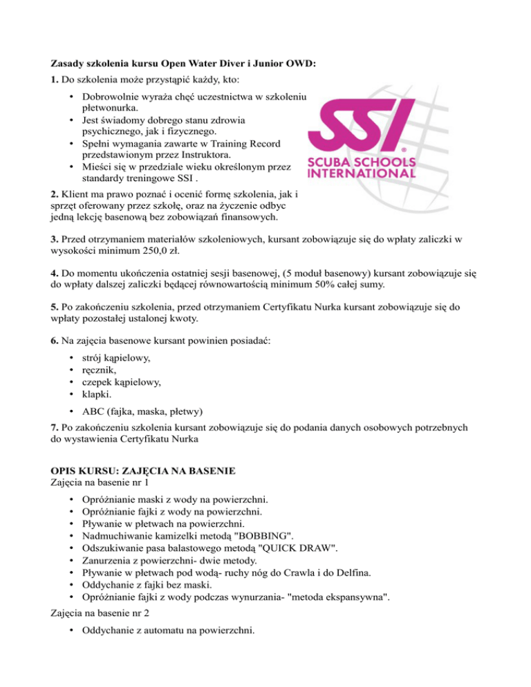 Zasady szkolenia kursu Open Water Diver i Junior OWD: 1. Do szkolenia może przystąpić każdy, kto: • Dobrowolnie wyraża chęć uczestnictwa w szkoleniu płetwonurka. • Jest świadomy dobrego stanu zdrowia psychicznego, jak i fizycznego. • Spełni wymagania zawarte w Training Record przedstawionym przez Instruktora. • Mieści się w przedziale wieku określonym przez standardy treningowe SSI . 2. Klient ma prawo poznać i ocenić formę szkolenia, jak i sprzęt oferowany przez szkołę, oraz na życzenie odbyc jedną lekcję basenową bez zobowiązań finansowych. 3. Przed otrzymaniem materiałów szkoleniowych, kursant zobowiązuje się do wpłaty zaliczki w wysokości minimum 250,0 zł. 4. Do momentu ukończenia ostatniej sesji basenowej, (5 moduł basenowy) kursant zobowiązuje się do wpłaty dalszej zaliczki będącej równowartością minimum 50% całej sumy. 5. Po zakończeniu szkolenia, przed otrzymaniem Certyfikatu Nurka kursant zobowiązuje się do wpłaty pozostałej ustalonej kwoty. 6. Na zajęcia basenowe kursant powinien posiadać: • • • • strój kąpielowy, ręcznik, czepek kąpielowy, klapki. • ABC (fajka, maska, płetwy) 7. Po zakończeniu szkolenia kursant zobowiązuje się do podania danych osobowych potrzebnych do wystawienia Certyfikatu Nurka OPIS KURSU: ZAJĘCIA NA BASENIE Zajęcia na basenie nr 1 • • • • • • • • • Opróżnianie maski z wody na powierzchni. Opróżnianie fajki z wody na powierzchni. Pływanie w płetwach na powierzchni. Nadmuchiwanie kamizelki metodą "BOBBING". Odszukiwanie pasa balastowego metodą "QUICK DRAW". Zanurzenia z powierzchni- dwie metody. Pływanie w płetwach pod wodą- ruchy nóg do Crawla i do Delfina. Oddychanie z fajki bez maski. Opróżnianie fajki z wody podczas wynurzania- "metoda ekspansywna". Zajęcia na basenie nr 2 • Oddychanie z automatu na powierzchni. • • • • • Oddychanie z automatu pod wodą. Oddychanie z automatu bez maski. Opróżnianie automatu z wody- dwa sposoby. Odszukiwanie automatu- dwa sposoby. Opróżnienie maski z wody. Zajęcia na basenie nr 3 • • • • • • Pompowanie kamizelki (ustami i z butli). Ustalanie pływalności (ustami i z butli ). Dzielenie się powietrzem- dodatkowe, alternatywne źródło powietrza. Oddychanie z partnerem z jednego automatu- "oddychanie partnerskie". Kontrolowane zanurzenie. Kontrolowane wynurzenie. Zajęcia na basenie nr 4 • • • • • Zdejmowanie i zakładanie pasa balastowego pod wodą. Wynurzenie awaryjne dzieląc się powietrzem. Zakładanie i zdejmowanie pasa balastowego na powierzchni. Kontrolowane awaryjne wynurzenie płynąc na płetwach. Wynurzenie awaryjne z dodatnią pływalnością. Zajęcia na basenie nr 5 • Zakładanie i zdejmowanie sprzętu na powierzchni. • Oddychanie z "bomblującego" automatu- symulacja uszkodzenia automatu. • Zdejmowanie i zakładanie sprzętu pod wodą. ZAJĘCIA NA WODACH OTWARTYCH Zajęcia na wodach otwartych nr 1 • • • • • • • • Opróżnianie maski z wody na powierzchni. Pomoc i asysta partnerowi- usuwanie skurczów, holowanie zmęczonego nurka. Pływanie po powierzchni w sprzęcie. Lokalizowanie pasa balastowego. Pompowanie kamizelki (ustami i z butli) Kontrolowane zanurzenie. Pływanie pod wodą. Kontrolowane wynurzenie. Zajęcia na wodach otwartych nr 2 • • • • • • Opróżnianie automatu z wody. Odszukiwanie automatu- dwa sposoby. Opróżnianie maski z wody. Kontrola Pływalności (ustami i z butli). Dzielenie się powietrzem- oddychanie z alternatywnego źródła powietrza. Oddychanie z jednego automatu- oddychanie partnerskie. Zajęcia na wodach otwartych nr 3 • Awaryjne wynurzenie dzieląc się powietrzem. • Awaryjne wynurzenie płynąc na płetwach. • Zdejmowanie i zakładanie pasa balastowego- pod i na wodzie. Zajęcia na wodach otwartych nr 4 • Wynurzenie awaryjne oddychając z jednego automatu. • Oddychanie z "bomblującego" automatu- symulacja uszkodzenia automatu. • Zdejmowanie i zakładanie sprzętu na powierzchni. Zajęcia na wodach otwartych nr 5 • Zdejmowanie i zakładanie sprzętu pod wodą. • Kontrola zużycia powietrza. • Wynurzenie awaryjne z dodatnią pływalnością- przez zrzucenie pasa balastowego. Po otrzymaniu certyfikatu nurkowego, jesteś gotów aby rozpocząć przygodę z nurkowaniem. Po kursie nie będziesz sam - oferujemy ci zdobywanie dalszego doświadczenia wspólnie z nami zarówno na akwenach w kraju jak i za granicą. Znajdziemy ci odpowiedniego partnera do nurkowania i wypożyczymy sprzęt oraz napełnimy butlę i przeprowadzimy serwis twojego sprzętu. Zapewnimy możliwośc odbycia kursów na interesujące cię specjalizacje takie jak: – nurkowanie głębokie – nawigacja – nurkowanie nitroksowe – nurkowanie nocne i przy ograniczonej widoczności – nurkowanie z łodzi – doskonała pływalnośc – nurkowanie z komputerem – poszukiwanie i wydobywanie – nurkowanie w suchych skafandrach – wiedza o sprzęcie – nurkowanie w prądzie – fale, prądy, pływy – nurkowanie na wrakach – podwodna fotografia cyfrowa Oferujemy również możliwośc odbycia kursu i zdobycie specjalizacji na wyjeździe np. w Chorwacji, Norwegii lub innym kraju. Nurkowanie daje nieograniczoną ilość możliwości poznawania, odkrywania , uczenia się i zdobywania nowych doświadczeń. Możesz podążyć wszędzie, gdzie tylko poprowadzi Cię pasja i entuzjazm. • Eksploracja lokalnych akwenów . Wskażemy ci miejsca nurkowe łatwo dostępne i tanie, dające możliwość wykorzystania posiadanej wiedzy, umiejętności i sprzętu, a przede wszystkim nabycia doświadczenia. Od Bałtyku poprzez ciekawe jeziora do miejsc takich jak kamieniołomy „Koparki” w Jaworznie i „Zakrzówek” w Krakowie. • Eksploracja akwenów całego świata. Podróżuj do egzotycznych miejsc na świecie i poznawaj fascynujące kultury. Siedemdziesiąt dwa procent świata znajduje się pod wodą, a Ty posiadasz li