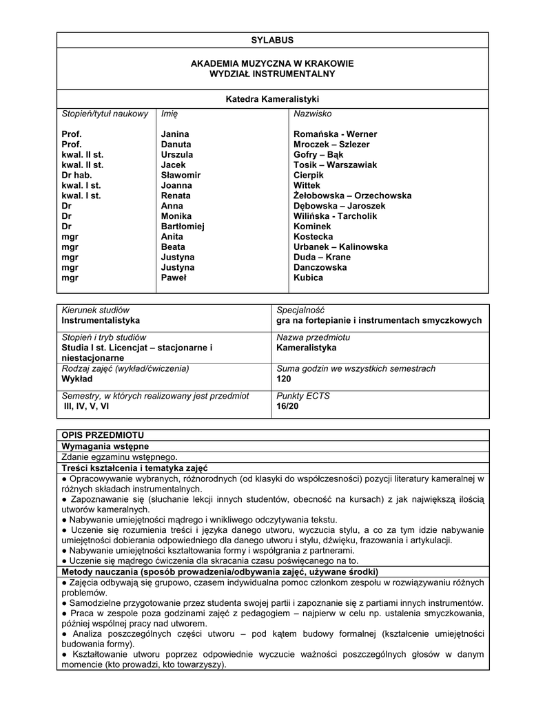 SYLABUS AKADEMIA MUZYCZNA W KRAKOWIE WYDZIAŁ INSTRUMENTALNY Katedra Kameralistyki Stopień/tytuł naukowy Imię Nazwisko Prof. Prof. kwal. II st. kwal. II st. Dr hab. kwal. I st. kwal. I st. Dr Dr Dr mgr mgr mgr mgr mgr Janina Danuta Urszula Jacek Sławomir Joanna Renata Anna Monika Bartłomiej Anita Beata Justyna Justyna Paweł Romańska - Werner Mroczek – Szlezer Gofry – Bąk Tosik – Warszawiak Cierpik Wittek Żełobowska – Orzechowska Dębowska – Jaroszek Wilińska - Tarcholik Kominek Kostecka Urbanek – Kalinowska Duda – Krane Danczowska Kubica Kierunek studiów Instrumentalistyka Specjalność gra na fortepianie i instrumentach smyczkowych Stopień i tryb studiów Studia I st. Licencjat – stacjonarne i niestacjonarne Rodzaj zajęć (wykład/ćwiczenia) Wykład Nazwa przedmiotu Kameralistyka Semestry, w których realizowany jest przedmiot III, IV, V, VI Punkty ECTS 16/20 Suma godzin we wszystkich semestrach 120 OPIS PRZEDMIOTU Wymagania wstępne Zdanie egzaminu wstępnego. Treści kształcenia i tematyka zajęć ● Opracowywanie wybranych, różnorodnych (od klasyki do współczesności) pozycji literatury kameralnej w różnych składach instrumentalnych. ● Zapoznawanie się (słuchanie lekcji innych studentów, obecność na kursach) z jak największą ilością utworów kameralnych. ● Nabywanie umiejętności mądrego i wnikliwego odczytywania tekstu. ● Uczenie się rozumienia treści i języka danego utworu, wyczucia stylu, a co za tym idzie nabywanie umiejętności dobierania odpowiedniego dla danego utworu i stylu, dźwięku, frazowania i artykulacji. ● Nabywanie umiejętności kształtowania formy i współgrania z partnerami. ● Uczenie się mądrego ćwiczenia dla skracania czasu poświęcanego na to. Metody nauczania (sposób prowadzenia/odbywania zajęć, używane środki) ● Zajęcia odbywają się grupowo, czasem indywidualna pomoc członkom zespołu w rozwiązywaniu różnych problemów. ● Samodzielne przygotowanie przez studenta swojej partii i zapoznanie się z partiami innych instrumentów. ● Praca w zespole poza godzinami zajęć z pedagogiem – najpierw w celu np. ustalenia smyczkowania, później wspólnej pracy nad utworem. ● Analiza poszczególnych części utworu – pod kątem budowy formalnej (kształcenie umiejętności budowania formy). ● Kształtowanie utworu poprzez odpowiednie wyczucie ważności poszczególnych głosów w danym momencie (kto prowadzi, kto towarzyszy). ● Dyskusja nad propozycjami studentów odnośnie interpretacji. ● Słuchanie koncertów, audycji radiowych, nagrań – dyskusja nad nimi. Cele nauczania i efekty kształcenia (oczekiwane rezultaty nauczania, nabyte przez studentów umiejętności i wiedza) ● Praktyczne poznanie jak największej ilości pozycji kameralnych. ● Nabywanie umiejętności samodzielnej pracy nad utworem. ● Nabycie umiejętności wyczucia stylu, kształtowania formy, tworzenia odpowiednich relacji między głosami, znalezienia odpowiedniego dla danego utworu dźwięku, dynamiki, tempa, artykulacji, czyli wszystkich czynników składających się na interesującą i stylową interpretację utworu. ● Wykształcenie zdolności współpracy z partnerami w różnych formacjach kameralnych. ● Nabywanie umiejętności koncentracji podczas prezentacji estradowej. Możliwe języki nauczania Niemiecki, angielski, francuski. ZALICZENIE PRZEDMIOTU Terminy, forma i zakres sprawdzianu umiejętności/wiedzy studenta Egzaminy semestralne – prezentacja przygotowanego programu. Sposoby oceny pracy studenta Udział procentowy w ocenie końcowej ocena ciągła (bieżące przygotowanie do zajęć i aktywność) 20 % śródsemestralne kolokwia pisemne/ustne końcowe zaliczenie pisemne/ustne/praktyczne egzamin pisemny egzamin ustny egzamin praktyczny 80 % kontrola obecności praca końcowa semestralna/roczna inne (wymienić) Ogółem 100 % Literatura obowiązkowa ● Słuchanie nagrań. ● Zapoznanie się z życiorysem i działalnością kompozytora, którego utwór jest grany, szczególnie z okresem, z którego dane dzieło pochodzi. Literatura uzupełniająca ● Wyszukiwanie i zapoznawanie się z książkami, czy artykułami omawiającymi problemy muzyczne, szczególnie dotyczącymi kameralistyki – np. Basil Smallman – The Piano Trio, Quartet and Quintet.