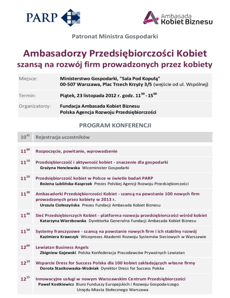 Patronat Ministra Gospodarki Ambasadorzy Przedsiębiorczości Kobiet szansą na rozwój firm prowadzonych przez kobiety Miejsce: Ministerstwo Gospodarki, "Sala Pod Kopułą" 00-507 Warszawa, Plac Trzech Krzyży 3/5 (wejście od ul. Wspólnej) Termin: Piątek, 23 listopada 2012 r. godz. 11 00 - 1500 Organizatorzy: Fundacja Ambasada Kobiet Biznesu Polska Agencja Rozwoju Przedsiębiorczości PROGRAM KONFERENCJI 1045 Rejestracja uczestników 1100 Rozpoczęcie, powitanie, wprowadzenie 1110 Przedsiębiorczość i aktywność kobiet - znaczenie dla gospodarki Grażyna Henclewska Wiceminister Gospodarki 1120 Przedsiębiorczość kobiet w Polsce w świetle badań PARP Bożena Lublińska-Kasprzak Prezes Polskiej Agencji Rozwoju Przedsiębiorczości 1130 Ambasadorki Przedsiębiorczości Kobiet - szansą na powstanie 100 nowych firm prowadzonych przez kobiety w 2013 r. Urszula Ciołeszyńska Prezes Fundacji Ambasada Kobiet Biznesu 1140 Sieć Przedsiębiorczych Kobiet - platforma rozwoju przedsiębiorczości wśród kobiet Katarzyna Wierzbowska Dyrektorka Generalna Fundacji Ambasada Kobiet Biznesu 1150 Systemy franczyzowe - szansą na powstanie nowych firm i ich stabilny rozwój Kazimiera Krawczyk Wiceprezes Akademii Rozwoju Systemów Sieciowych w Warszawie 1200 Lewiatan Business Angels Zbigniew Gajewski Polska Konfederacja Pracodawców Prywatnych Lewiatan 1210 Wsparcie Dress for Success Polska dla 100 kobiet zakładających własne firmy Dorota Stasikowaska-Woźniak Dyrektor Dress for Success Polska 1215 Innowacyjne usługi w nowym Warszawskim Centrum Przedsiębiorczości Paweł Kostkiewicz Biuro Funduszy Europejskich i Rozwoju Gospodarczego Urzędu Miasta Stołecznego Warszawa 1220 Przerwa kawowa 1300 Mentoring i coaching szansą na powstanie nowych firm i ich rozwój Iwona Majewska-Opiełka Ambasador Przedsiębiorczości Kobiet, Właścicielka Akademii Skutecznego Działania Iwony Majewskiej-Opiełki (ASDIMO) w Warszawie 1315 Poznajmy Ambasadorki Przedsiębiorczości Kobiet, które założyły i prowadzą swoje własne firmy. W krótkich wystąpieniach (max 5 min.) opowiedzą nam o swoich doświadczeniach na etapie startu w biznesie, jak pokonały trudności, czy ktoś im pomógł. Inspirujące podpowiedzi i dobre rady dla innych kobiet. Regina Bisikiewicz Założycielka, właścicielka i prezes zarządu Leadership Management International Polska (Wrocław) Helena Burzyńska Założycielka i właścicielka sieci sklepów ARHELAN (Bielsk Podlaski) Barbara Chwesiuk Założycielka i właścicielka firmy BIALCON (Biała Podlaska) Małgorzata Chechlińska Założycielka i właścicielka Grupy TRIP, Prezes Zarządu Polskiego Związku Prywatnych Pracodawców Turystyki Barbara Hildman Założycielka i właścicielka BIELENDA Kosmetyki Naturalne, Prezes Instytutu BIELENDA Professional (Kraków) Aleksandra Łukomska-Smulska Założycielka i właścicielka firmy RENIFER (Toruń) Izabela Makosz Założycielka i właścicielka firmy "Time for Wax" (Warszawa) Agata Młynarska Dziennikarka, prezenterka telewizyjna, założycielka i właścicielka portalu dla kobiet OnaOnaOna Ewa Polit Współwłaścicielka i Prezes Kancelarii Doradztwa Prawno-Ekonomicznego LAW & BUSINESS (Warszawa) Agnieszka Przybysz Założycielka i właścicielka pierwszego w Polsce Coaching Institute Maria Siemionek Założycielka, właścicielka i Dyrektor Szkoły Języków Obcych i Biura Tłumaczeń MS-MASTERS (Olsztyn) Bożena Skibicka Założycielka, współwłaścicielka, Przewodnicząca Rady Nadzorczej MIS (Wrocław) Małgorzata Smoczyńska Założycielka i liderka Akademii Kobiet Sukcesu (Warszawa) Ewa Stanisławiak Założycielka, właścicielka i Prezes Zarządu EKOUNIVERSA (Opole) Monika Szczerbak Założycielka i Prezes Zarządu firmy doradczej SOL Financial Services Sława Tarasiewicz Właścicielka Gospodarstwa Agroturystycznego "Trzy Świerki" (Galwiecie – Warmia i Mazury) Maria Waliczek Założycielka i właścicielka Laboratorium Kosmetyków Naturalnych FARMONA i FARMONA Hotel Business & Spa (Kraków) Alicja Wojciechowska Założycielka, właścicielka i szefowa firmy produkującej bielizną damską ALLES (Głownio k/Łodzi) Edyta Wojciechowska-Malke Właścicielka i Prezes firmy produkującej artykuły sportowe dla dzieci i młodzieży VISION ONE (Warszawa) 1445 Nowe możliwości sfinansowania rozwoju biznesu Ewa Janikowska Ambasador Przedsiębiorczości Kobiet, Założycielka, właścicielka i Prezes Zarządu CONCORDA (Warszawa) 1500 Pytania, odpowiedzi, podsumowanie 1515 Obiad dla wszystkich uczestników