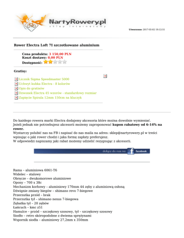 Utworzono: 2017-03-02 19:12:51 Rower Electra Loft 7I szczotkowane aluminium Cena produktu: 3 150,00 PLN Koszt dostawy: 0,00 PLN Dostępność: Gratisy: Licznik Sigma Speedmaster 5000 Uchwyt kubka Electra - 8 kolorów Opis do gratisów Dzwonek Electra 45 wzorów - standardowy rozmiar Zapięcie Spirala 12mm 150cm na kluczyk Do każdego rowera marki Electra dodajemy akcesoria które można dowolnie wymieniać. Jeżeli jednak nie potrzebujesz akcesorii możemy zaproponować kupon rabatowy od 6-14% na rower. Wystarczy polubić nas na FB i napisać do nas maila na adres: [email protected] w treści wpisując o jaki rower chodzi i jaka formę zapłaty preferujesz. W odpowiedzi napiszamy jaki rabat możemy udzielić rezygnując z akcesorii. Rama – aluminiowa 6061-T6 Widelec – stalowy Obręcze – dwukomorowe aluminiowe Opony – 700 x 38c Mechanizm korbowy – aluminiowy 170mm 44 zęby z aluminiową osłoną Dźwignie zmiany biegów – shimano revo 7-biegowe Przerzutka przód – brak Przerzutka tył – shimano nexus 7-biegowa Zębatka tył – 20 zębów Łańcuch – kmc z51 Hamulce – przód – szczękowy szosowy, tył – szczękowy szosowy Siodło – retro skóropodobne z dwiema sprężynami Wspornik siodła – aluminiowy 27,2mm x 350mm Wspornik kierownicy – aluminiowy klasyczny 25,4mm Kolor – szczotkowane aluminium Wyposażenie specjalne – malowane błotniki pod kolor ramy, aluminiowy bagażnik, aluminiowa podpora boczna, dwa miejsca do montażu uchwytu bidonu, miejsce do montażu zabezpieczenia szczękowego Dlaczego warto wybrać sklep NartyRowery.pl ? ● ● ● ● ● ● ● ● ● ● ● ● ● Darmowa Przesyłka Kurierska dla zamówień już od 400 PLN Szybka dostawa w 24h Możliwość zwrotu lub wymiany towaru w ciągu 10 dni od zakupu W naszym sklepie internetowym są tylko aktualnie dostępne produkty (zredukowaliśmy do minimum ryzyko braku dostępności zamówionego towaru) Możliwość negocjacji cen Częste promocje i rabaty ( obniżki cen, rabat na akcesoria, gratisy do rowerów) Fachowe doradztwo Pozytywne opinie w niezależnych serwisach m.in. Opineo, Allegro i porównywarkach cen Możliwość zakupu na raty - obsługujemy systemy Żagiel i Cetelem Sprzedajemy rowery wyregulowane i przesmarowane Do każdego zamówienia otrzymasz paragon lub fakturę stanowiący podstawę gwarancji Szczegółowe informacje o statusie zamówienia i wysyłce na adres e-mail podany w zamówieniu Obsługujemy płatności internetowe i Paypal Dołożono wszelkich starań, aby opisy i zdjęcia produktów były dokładne i aktualne. Specyfikacje i ceny mogą ulec zmianie bez uprzedzenia Płeć Przeznaczenie Męski Miejski, Cruiser Widelec/ amortyzator stalowy Manetki Przerzutka przód Przerzutka tył Kaseta/ wolnobieg Korbowód Pedały Hamulce shimano revo 7-biegowe brak shimano nexus 7-biegowa 20 zębów aluminiowy 170mm 44 zęby z aluminiową osłoną b.d. przód – szczękowy szosowy, tył – szczękowy szosowy Piasta przód b.d. Piasta tył b.d. Obręcze dwukomorowe aluminiowe Szprychy b.d. Kolekcja 2015 Opony 700 x 38c Stery b.d. Mostek aluminiowy klasyczny 25,4mm Kierownica b.d. Chwyty b.d. Siodło retro skóropodobne z dwiema sprężynami Sztyca aluminiowy 27,2mm x 350mm Waga b.d. Rama aluminiowa 6061-T6 Hamulce U-brake Damper - Pegi - Ilość biegów 7 Łańcuch Gwarancja Adres: http://nartyrowery.pl/ kmc z51 24 miesiące Telefon: 34 365 66 09, 793 61 04 29 Email: [email protected] Gadu-Gadu: Skype: