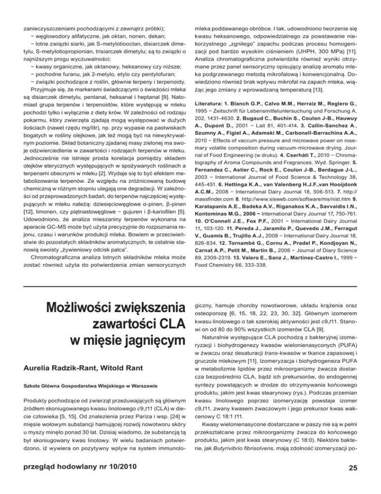 zanieczyszczeniami pochodzącymi z zewnątrz próbki); − węglowodory alifatyczne, jak oktan, nonen, dekan; − lotne związki siarki, jak S-metylotiooctan, disiarczek dimetylu, S-metylotiopropionian, trisiarczek dimetylu; są to związki o najniższym progu wyczuwalności; − kwasy organiczne, jak oktanowy, heksanowy czy niższe; − pochodne furanu, jak 2-metylo, etylo czy pentylofuran; − związki pochodzące z roślin, głównie terpeny i terpenoidy. Przyjmuje się, że markerami świadczącymi o świeżości mleka są disiarczek dimetylu, pentanal, heksanal i heptanal [9]. Natomiast grupa terpenów i terpenoidów, które występują w mleku pochodzi tylko i wyłącznie z diety krów. W zależności od rodzaju pokarmu, który zwierzęta zjadają mogą występować w dużych ilościach (nawet rzędu mg/litr), np. przy wypasie na pastwiskach bogatych w rośliny olejkowe, jak też mogą być na niewykrywalnym poziomie. Skład botaniczny zjadanej masy zielonej ma swoje odzwierciedlenie w zawartości i rodzajach terpenów w mleku. Jednocześnie nie istnieje prosta korelacja pomiędzy składem olejków eterycznych występujących w spożywanych roślinach a terpenami obecnymi w mleku [2]. Wydaje się to być efektem metabolizowania terpenów. Ze względu na zróżnicowaną budowę chemiczną w różnym stopniu ulegają one degradacji. W zależności od przeprowadzonych badań, do terpenów najczęściej występujących w mleku należą: dziesięciowęglowe α-pinen, β-pinen [12], limonen, czy piętnastowęglowe − gujuren i β-kariofilen [5]. Udowodniono, że analiza mieszaniny terpenów wykonana na aparacie GC-MS może być użyta precyzyjnie do rozpoznania rejonu, czasu i warunków produkcji mleka. Bowiem w przeciwieństwie do pozostałych składników aromatycznych, te ostatnie stanowią swoisty „żywieniowy odcisk palca”. Chromatograficzna analiza lotnych składników mleka może zostać również użyta do potwierdzenia zmian sensorycznych Możliwości zwiększenia zawartości CLA w mięsie jagnięcym Aurelia Radzik-Rant, Witold Rant Szkoła Główna Gospodarstwa Wiejskiego w Warszawie Produkty pochodzące od zwierząt przeżuwających są głównym źródłem skoniugowanego kwasu linolowego c9,t11 (CLA) w diecie człowieka [5, 15]. Od znalezienia przez Pariza i wsp. [24] w mięsie wołowym substancji hamującej rozwój nowotworu skóry u myszy minęło ponad 30 lat. Dzisiaj wiadomo, że substancją tą był skoniugowany kwas linolowy. W wielu badaniach potwierdzono, iż wywiera on pozytywny wpływ na system immunolo- przegląd hodowlany nr 10/2010 mleka poddawanego obróbce. I tak, udowodniono tworzenie się kwasu heksanowego, odpowiedzialnego za powstawanie niekorzystnego „zgniłego” zapachu podczas procesu homogenizacji pod bardzo wysokim ciśnieniem (UHPH, 300 MPa) [11]. Analiza chromatograficzna potwierdziła również wyniki otrzymane przez panel sensoryczny opisujący analizę aromatu mleka podgrzewanego metodą mikrofalową i konwencjonalną. Dowiedziono również brak wpływu mikrofal na zapach mleka, wiążąc jego zmiany z wprowadzaną temperaturą [13]. Literatura: 1. Blanch G.P., Calvo M.M., Herraiz M., Reglero G., 1995 − Zeitschrift für Lebensmitteluntersuchung und Forschung A, 202, 1431-4630. 2. Bugaud C., Buchin S., Coulon J-B., Hauwuy A., Dupont D., 2001 − Lait 81, 401-414. 3. Callin-Sanchez A., Szumny A., Figiel A., Adamski M., Carbonell-Barrachina A.A., 2010 − Effects of vaccum pressure and microwave power on rosemary volatile composition during vacuum-microwave drying. Journal of Food Engineering (w druku). 4. Cserháti T., 2010 − Chromatography of Aroma Compounds and Fragrances. Wyd. Springer. 5. Fernandez C., Astier C., Rock E., Coulon J-B., Berdague J-L., 2003 − International Journal of Food Science & Technology 38, 445-451. 6. Hettinga K.A., van Valenberg H.J.F.,van Hooijdonk A.C.M., 2008 − International Dairy Journal 18, 506-513. 7. http:// massfinder.com 8. http://www.sisweb.com/software/ms/nist.htm 9. Karatapanis A.E., Badeka A.V., Riganakos K.A., Savvaidis I.N., Kontominas M.G., 2006 − International Dairy Journal 17, 750-761. 10. O’Connell J.E., Fox P.F., 2001 − International Dairy Journal 11, 103-120. 11. Pereda J., Jaramilo P., Quevedo J.M., Ferragut V., Guamis B., Trujillo A.J., 2008 − International Dairy Journal 18, 826-834. 12. Tornambé G., Cornu A., Pradel P., Kondjoyan N., Carnat A.P., Petit M., Martin B., 2006 − Journal of Diary Science 89, 2309-2319. 13. Valero E., Sanz J., Martinez-Castro I., 1999 − Food Chemistry 66, 333-338. giczny, hamuje choroby nowotworowe, układu krążenia oraz osteoporozę [6, 15, 18, 22, 23, 30, 32]. Głównym izomerem kwasu linolowego o tak szerokiej aktywności jest c9,t11. Stanowi on od 80 do 90% wszystkich izomerów CLA [9]. Naturalnie występujące CLA pochodzą z bakteryjnej izomeryzacji i biohydrogenezy kwasów wielonienasyconych (PUFA) w żwaczu oraz desaturacji trans-kwasów w tkance zapasowej i gruczole mlekowym [11]. Izomeryzacja i biohydrogeneza PUFA w metabolizmie lipidów przez mikroorganizmy żwacza dostarcza bezpośrednio CLA, bądź ich prekursorów, do endogennej syntezy powstających w drodze do otrzymywania końcowego produktu, jakim jest kwas stearynowy (rys.). Podczas przemian kwasu linolowego poprzez izomeryzację powstaje izomer c9,t11, zwany kwasem żwaczowym i jego prekursor kwas wakcenowy C 18:1 t11. Kwasy wielonienasycone dostarczane w paszy nie są w pełni przekształcane przez mikroorganizmy żwacza do końcowego produktu, jakim jest kwas stearynowy (C 18:0). Niektóre bakterie, jak Butyrivibrio fibrisolvens, mają zdolność izomeryzacji po- 25 przeżuwaczy, jak i u nieprzeżuwaczy [10], ale dostępność TVA jest większa u zwierząt przeżuwających ze względu na procesy Tłuszcz pokarmowy biohydrogenezy [3]. Endogenną syntezę z kwasu wakcenowego potwierdzono także u ludzi, ale wydaje się, że źródłem tego prekursora może być mięso i mle