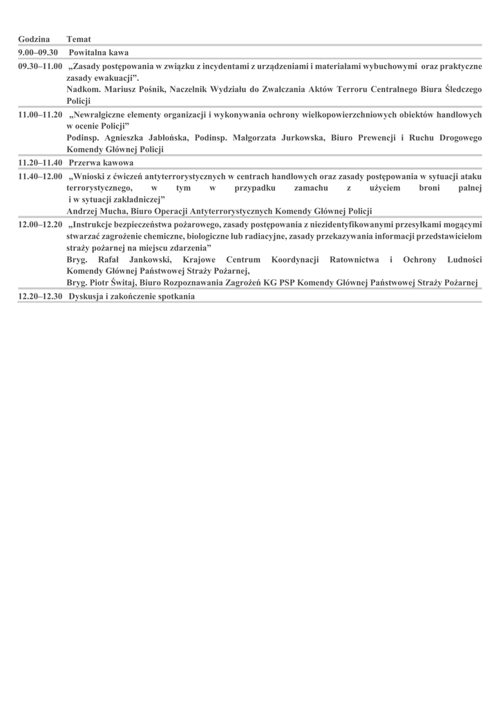 Godzina Temat 9.00–09.30 Powitalna kawa 09.30–11.00 „Zasady postępowania w związku z incydentami z urządzeniami i materiałami wybuchowymi oraz praktyczne zasady ewakuacji”. Nadkom. Mariusz Pośnik, Naczelnik Wydziału do Zwalczania Aktów Terroru Centralnego Biura Śledczego Policji 11.00–11.20 „Newralgiczne elementy organizacji i wykonywania ochrony wielkopowierzchniowych obiektów handlowych w ocenie Policji” Podinsp. Agnieszka Jabłońska, Podinsp. Małgorzata Jurkowska, Biuro Prewencji i Ruchu Drogowego Komendy Głównej Policji 11.20–11.40 Przerwa kawowa 11.40–12.00 „Wnioski z ćwiczeń antyterrorystycznych w centrach handlowych oraz zasady postępowania w sytuacji ataku terrorystycznego, w tym w przypadku zamachu z użyciem broni palnej i w sytuacji zakładniczej” Andrzej Mucha, Biuro Operacji Antyterrorystycznych Komendy Głównej Policji 12.00–12.20 „Instrukcje bezpieczeństwa pożarowego, zasady postępowania z niezidentyfikowanymi przesyłkami mogącymi stwarzać zagrożenie chemiczne, biologiczne lub radiacyjne, zasady przekazywania informacji przedstawicielom straży pożarnej na miejscu zdarzenia” Bryg. Rafał Jankowski, Krajowe Centrum Koordynacji Ratownictwa i Ochrony Ludności Komendy Głównej Państwowej Straży Pożarnej, Bryg. Piotr Świtaj, Biuro Rozpoznawania Zagrożeń KG PSP Komendy Głównej Państwowej Straży Pożarnej 12.20–12.30 Dyskusja i zakończenie spotkania