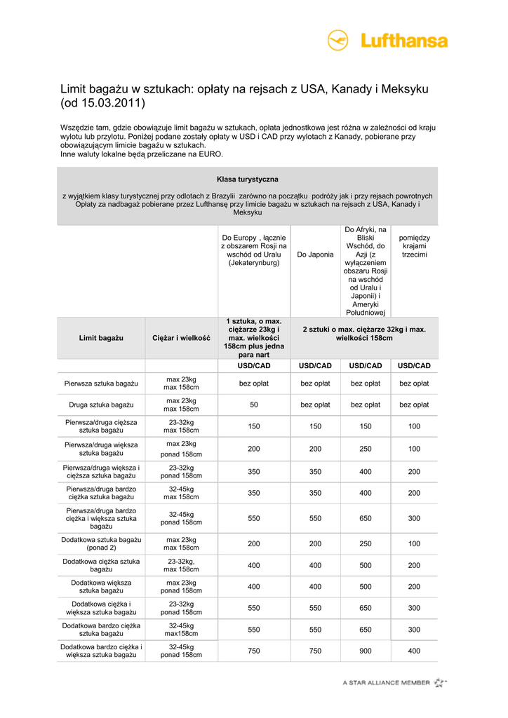 Limit bagaŜu w sztukach: opłaty na rejsach z USA, Kanady i Meksyku (od 15.03.2011) Wszędzie tam, gdzie obowiązuje limit bagaŜu w sztukach, opłata jednostkowa jest róŜna w zaleŜności od kraju wylotu lub przylotu. PoniŜej podane zostały opłaty w USD i CAD przy wylotach z Kanady, pobierane przy obowiązującym limicie bagaŜu w sztukach. Inne waluty lokalne będą przeliczane na EURO. Klasa turystyczna z wyjątkiem klasy turystycznej przy odlotach z Brazylii zarówno na początku podróŜy jak i przy rejsach powrotnych Opłaty za nadbagaŜ pobierane przez Lufthansę przy limicie bagaŜu w sztukach na rejsach z USA, Kanady i Meksyku Do Europy , łącznie z obszarem Rosji na wschód od Uralu (Jekaterynburg) Limit bagaŜu CięŜar i wielkość 1 sztuka, o max. cięŜarze 23kg i max. wielkości 158cm plus jedna para nart Do Japonia Do Afryki, na Bliski Wschód, do Azji (z wyłączeniem obszaru Rosji na wschód od Uralu i Japonii) i Ameryki Południowej pomiędzy krajami trzecimi 2 sztuki o max. cięŜarze 32kg i max. wielkości 158cm USD/CAD USD/CAD USD/CAD USD/CAD Pierwsza sztuka bagaŜu max 23kg max 158cm bez opłat bez opłat bez opłat bez opłat Druga sztuka bagaŜu max 23kg max 158cm 50 bez opłat bez opłat bez opłat Pierwsza/druga cięŜsza sztuka bagaŜu 23-32kg max 158cm 150 150 150 100 Pierwsza/druga większa sztuka bagaŜu ponad 158cm 200 200 250 100 Pierwsza/druga większa i cięŜsza sztuka bagaŜu 23-32kg ponad 158cm 350 350 400 200 Pierwsza/druga bardzo cięŜka sztuka bagaŜu 32-45kg max 158cm 350 350 400 200 Pierwsza/druga bardzo cięŜka i większa sztuka bagaŜu 32-45kg ponad 158cm 550 550 650 300 Dodatkowa sztuka bagaŜu (ponad 2) max 23kg max 158cm 200 200 250 100 Dodatkowa cięŜka sztuka bagaŜu 23-32kg, max 158cm 400 400 500 200 Dodatkowa większa sztuka bagaŜu max 23kg ponad 158cm 400 400 500 200 Dodatkowa cięŜka i większa sztuka bagaŜu 23-32kg ponad 158cm 550 550 650 300 Dodatkowa bardzo cięŜka sztuka bagaŜu 32-45kg max158cm 550 550 650 300 Dodatkowa bardzo cięŜka i większa sztuka bagaŜu 32-45kg ponad 158cm 750 750 900 400 max 23kg Klasa Pierwsza i Business oraz klasa turystyczna przy odlotach z Brazylii zarówno na początku podróŜy jak i przy rejsach powrotnych Opłaty za nadbagaŜ pobierane przez Lufthansę przy limicie bagaŜu w sztukach na rejsach z USA, Kanady i Meksyku Do Europy , łącznie z obszarem Rosji na wschód od Uralu (Jekaterynburg) Limit bagaŜu Pierwsza i druga sztuka bagaŜu Pierwsza/druga większa sztuka bagaŜu Pierwsza/druga bardzo cięŜka sztuka bagaŜu Pierwsza/druga większa i bardzo cięŜka sztuka bagaŜu CięŜar i wielkość max 32kg max 158cm max 32kg ponad 158cm 32-45kg max 158cm 32-45kg ponad 158cm Do Japonia Do Afryki, na Bliski pomiędzy Wschód, do krajami Azji (z trzecimi wyłączeniem obszaru Rosji na wschód od Uralu i Japonii) i Ameryki Południowej 2 sztuki o max. cięŜarze 32kg i max. wielkości 158cm USD USD USD USD bez opłat bez opłat bez opłat bez opłat 200 200 250 100 350 350 400 200 550 550 650 300 KaŜda dodatkowa sztuka bagaŜu max 32kg max 158cm 200 200 250 100 Dodatkowa większa sztuka bagaŜu max 32kg ponad 158cm 400 400 500 200 Dodatkowa bardzo cięŜka sztuka bagaŜu 32-45kg max 158cm 550 550 650 300 750 750 900 400 Dodatkowa bardzo cięŜka i większa sztuka bagaŜu 32-45kg ponad 158cm