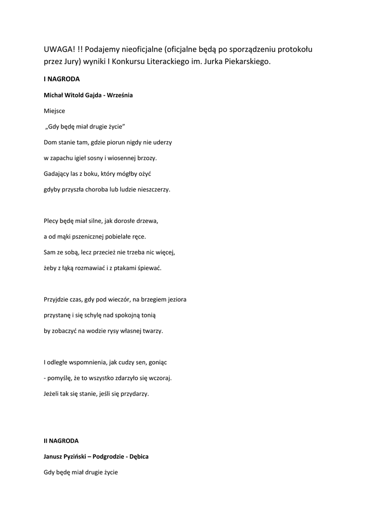 UWAGA! !! Podajemy nieoficjalne (oficjalne będą po sporządzeniu protokołu przez Jury) wyniki I Konkursu Literackiego im. Jurka Piekarskiego. I NAGRODA Michał Witold Gajda - Września Miejsce „Gdy będę miał drugie życie” Dom stanie tam, gdzie piorun nigdy nie uderzy w zapachu igieł sosny i wiosennej brzozy. Gadający las z boku, który mógłby ożyć gdyby przyszła choroba lub ludzie nieszczerzy. Plecy będę miał silne, jak dorosłe drzewa, a od mąki pszenicznej pobielałe ręce. Sam ze sobą, lecz przecież nie trzeba nic więcej, żeby z łąką rozmawiać i z ptakami śpiewać. Przyjdzie czas, gdy pod wieczór, na brzegiem jeziora przystanę i się schylę nad spokojną tonią by zobaczyć na wodzie rysy własnej twarzy. I odległe wspomnienia, jak cudzy sen, goniąc - pomyślę, że to wszystko zdarzyło się wczoraj. Jeżeli tak się stanie, jeśli się przydarzy. II NAGRODA Janusz Pyziński – Podgrodzie - Dębica Gdy będę miał drugie życie gdy będę miał drugie życie powrócę tam gdzie taty łza skapnęła kiedyś do kwaśnego mleka ze wspomnieniem, że czerń skiby złotem lśniła dla mnie gdy Chrystus przydrożny ocierał pot z twarzy patrząc mi na ręce wykręcone bólem tu wrócę niosąc w oczach cud rozstań nigdy nierozstanych świadectwo wiary i pokory z puzzli ułożę twarz mojej ziemi delikatność błękitu i żar czerni znajomy pejzaż kładzie się dywanem po którym delikatnie stąpam aby go nie zburzyć nie zapomnieć miejsca na którym ojciec niby obrus matka ziarno do ziarna równym rzędem kładzie a ze mną malwy wrócą do ogrodu gdzie spokój nie ma sobie równych cisza usiądzie na progu domu z różańcem godzina w twardniejącej dłoni oczy zabłękitnieją chabrem wśród słońcem malowanych zbóż i mąką zabieleją kłos przy miodnej drodze młodości pod białym welonem sadu szepcącym o dojrzałym owocu na drodze do raju tu stałem się cząstką świata jak kariatyda dźwigając na głowie cały ciężar wyrastałem jak cierpka tarnina z odłogów nadziei na lepsze jutro wznosiłem wzrok ku niebu z uporem ptaka wracając na strych gdzie w kołysce z pajęczyn usnęło dzieciństwo wchodząc pod lewe żebro najpiękniejszym obrazem konia żującego w pysku wędzidło i niedolę własną gdy buty nie chciały przyjść do mnie a miska nie rosła wraz ze mną jeszcze tylko pokroić chleb (żeby dla wszystkich po dawnemu) dłonią siejącą len na główkach dzieci kaleczącą się w kolcach mroku na której chwast chciał zamieszkać lecz nie miał odwagi III NAGRODA Katarzyna Dybżyńska - Świdnik St.James Infirmary Blues „Feel the breeze blowin’,come on, look out, here it comes Naw I can say whatever I feel like to you gdy będę miał drugie życie, ani czas ani miejsce nie sprawią, że moglibyśmy się nie spotkać mogliśmy się spotkać, tak jakby ktoś wreszcie narysował na niebie linie pomiędzy punktami konstelacji, nie zmniejszając tym samym odległości pomiędzy gwiazdami, lecz dając im drogi. mogłeś stać oparty o światło latarnie przed wejściem do podrzędnego hotelu, który sam w sobie jest historią i palić papierosa, wyjąć go powoli z namaszczeniem, ust po to, by uśmiechnąć się szelmowsko na mój widok, witaj kochanie, powiedziałbyś po raz pierwszy, tak pewnie jak gdyby nie było dreszczy, pędzących na czołowe i choreografii trzęsienia ziemi, jak gdybyśmy nie postawili wszystkiego na jedną, mocno wyświechtaną kartę, nie ryzykowali, że się zgubimy w labiryncie małych strachów i dużych wątpliwości. Moglibyśmy trzymać się za ręce jak gdybyśmy znali kierunek, moglibyśmy tańczyć na węch, zanurzeni w zapachu tytoniu i żywicy jak w kołysce muzyki, lekko, jak gdybyśmy dobrze znali soundtrack. Moglibyśmy iść dokądkolwiek, albo iść wcale, zanurzyć się w którekolwiek przed siebie albo w znieruchomienia pomiędzy naszymi ciałami i odpalając kolejnego papierosa, znaleźć u ciebie moją zapalniczkę WYRÓŻNIENIE Magdalena Cybulska - Łódź Gdy będę miał drugie życie Odnajdę ścieżkę, która dobrze zna moje stopy. Pogłaszczę po zielonej grzywie konika polnego. W ogródku będzie pachniała mięta. Rozetrę jej listki w palcach. Teraz mam pięć lat, Ty trzydzieści. Obydwoje patrzymy na świat, jakbyśmy go widzieli po raz pierwszy w życiu. Nawet spadający suchy liść wzbudza nasz zachwyt. Deszczowe chmury przyfrunęły ze wschodu. A przecież wystarczy nam tylko niewielka kałuża. Bo podobno właśnie w kałużach mieszkają krokodyle. Nigdy nie miałem tyle szczęścia, aby złapać choć jednego na wędkę, z wierzbowej witki. Może nie byłem wystarczająco cierpliwy. Dziś dłużej czekałbym nad jej brzegiem. Ale teraz mówią, że jestem na to za stary i za mądry. Dlatego przyglądam się z boku, czy w którymś wiaderku nie pływa krokodyl. Nadal wierzę, że wszystko się jeszcze może wydarzyć. WYRÓŻNIENIE Agnieszka Sygendowska – Łódź Gdy będę miał drugie życie gdy każesz Panie, zacząć podróż po raz wtóry to proszę, pozwól zabrać mi w walizce z życia rachunki i faktury. Gdy drugie życie zacznę z tym bagażem doświadczeń straty, wstydu złości, może tym razem zdam egzamin z miłości, dobra i mądrości. Gdy wręczysz mi ten ważny bilet bez daty, trasy, przeznaczenia ja nie odmówię ale błagam – bym miał tu coś do powiedzenia Kiedy mój zegar ruszy po raz drugi i zacznie się wędrówka poprzez czas obiecaj Panie, ,że podobnym tempem ci których kocham ruszą wzdłuż swych tras Wiem, nie wypada się targować gdy drugie życie w zasięgu lecz proszę, spraw, by ta pielgrzymka nie była truchtem po okręgu WYRÓŻNIENIE Anna Piliszewska – Wieliczka Kiedy Bóg się pomyli… Kiedy Bóg się pomyli i będę miał drugie życie Na świat popatrzę inaczej – przez liście, bo mnie to mniej boli I kupię mocne sandały – w nich pójdę w ciszę i spokój, A potem twierdzę wzniosę – z powietrza,