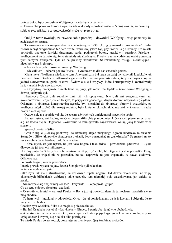 Lekcje boksu były pomysłem Wolfganga. Frieda była przeciwna. – Uczenie chłopców walki może wpędzić ich w kłopoty – protestowała. – Zaczną uważać, że poradzą sobie w sytuacji, która w rzeczywistości może ich przerosnąć. Oni już teraz uważają, że zawsze sobie poradzą – dowodził Wolfgang – więc pomóżmy im zwiększyć ich szanse. Ta rozmowa miała miejsce dwa lata wcześniej, w 1930 roku, gdy niemal z dnia na dzień Berlin znowu zaczął przypominać ten sam szpital wariatów, jakim był, gdy urodzili się bliźniacy. Do miasta powróciły znajome dźwięki tłuczonego szkła, podkutych butów, krzyków i strzałów. Friedzie i Wolfgangowi wydawało się, że to się nigdy nie skończyło. Trwały te same codzienne walki pomiędzy tymi samymi frakcjami. Tyle że na prawicy nazistowski Sturmabteilung zastąpił nieistniejące i nieopłakiwane Freikorps. – Jak za dawnych czasów – zauważył Wolfgang. – Nie całkiem – odparła ponuro Frieda. – Tym razem to dla nas znacznie gorsze. Miała rację i Wolfgang wiedział o tym. Antysemityzm był teraz bardziej wyraźny niż kiedykolwiek przedtem. Josef Goebbels, hitlerowski gauleiter Berlina, nie przepuścił dnia, żeby nie pojawić się na jakimś skrzyżowaniu, gdzie oskarżał Żydów o siłę i wpływy, które korumpowały i kontrolowały każdy aspekt życia społecznego. – Gdybyśmy rzeczywiście mieli takie wpływy, jak mówi ten łajdak – komentował Wolfgang – dawno już by nie żył. Niemieccy Żydzi byli zupełnie inni, niż ich opisywano. Nie byli ani zorganizowani, ani skoncentrowani. Jedyne, co ich łączyło, to przypadek genealogii, dzięki któremu nazywali się Żydami. Oskarżani o zbiorową konspiracyjną agresję, byli niezdolni do zbiorowej obrony i wszystkim, co Wolfgang mógł zrobić dla swojej rodziny, były kraty w oknach, składany nóż w kieszeni i nauka boksu dla chłopców. Oczywiście nie spodziewał się, że zaczną używać tych umiejętności przeciwko sobie. Patrząc wstecz, ani Paulus, ani Otto nie potrafili sobie przypomnieć, który z nich pierwszy przyznał się, że kocha się w Dagmarze. Zwierzenie to zainicjowało najkrwawszą walkę, jaką kiedykolwiek stoczyli. Sprowokowała ją Silke. Grali z nią w „końską podkowę” na błotnistej alejce miejskiego ogrodu niedaleko mieszkania Stenglów i Silke jak zwykle skorzystała z okazji, żeby ponarzekać na „księżniczkę” Dagmarę i na to, jak się robiła coraz bardziej zadufana w sobie. – Ona myśli, że jest lepsza, bo jest taka bogata i taka ładna – powiedziała gderliwie. – Tylko dlatego, że jej tata jest milionerem. Urażony pogardą Silke jeden z bliźniaków kazał jej być cicho, bo Dagmara jest w porządku. Drugi powiedział, że więcej niż w porządku, bo tak naprawdę to jest wspaniała. A nawet cudowna. Olśniewająca. Po prostu bogini, można powiedzieć. I nagle prawda wyszła na jaw. Bracia Stenglowie byli zakochani. W tej samej dziewczynie. Silke była tak zła i sfrustrowana, że dosłownie tupała nogami. Od dawna wyczuwała, że w jej ukochanych bliźniakach wzbierają takie uczucia, tym niemniej była zaszokowana, jak daleko to zaszło. – Nie możecie się obaj w niej kochać! – krzyczała. – To po prostu głupie. Co do tego chłopcy się akurat zgadzali. – Oczywiście, że nie! – warknął Paulus. – Bo ja już jej powiedziałem, że ją kocham i zgodziła się ze mną chodzić. – To łgarstwo! – krzyknął w odpowiedzi Otto. – Ja jej powiedziałem, że ja ją kocham i obiecała, że ze mną będzie chodzić. Chociaż była wściekła, Silke nie mogła się nie roześmiać. – Ha, ha! Oszukała was obu! – krzyknęła. – Głupcy. Pewnie obaj ją gówno obchodzicie. – A właśnie że nie! – wrzasnął Otto, nacierając na brata i popychając go. – Ona mnie kocha, a ty się lepiej odczep i trzymaj się z daleka albo pożałujesz! To wtedy Paulus go zaskoczył, powalając na ziemię potrójną kombinacją ciosów. – Jest moja! – krzyknął w dół do zaskoczonego i lekko zamroczonego brata. – Powiedziała mi, że mnie kocha! – Diabła tam, kocha cię, ty idioto! – zawołał Otto w odpowiedzi, kierując swój okrzyk w stronę miejsca między falującymi mu przed oczami dwoma wizerunkami brata. – Powiedziała, że mnie kocha! Otto nigdy nie widział, żeby brat miał tak czerwoną twarz, takie dzikie oczy. Paulus był przecież tym spokojnym bliźniakiem. – Robi dupków z was obu! – zawołała Silke z trójgłowego pnia, na którym przycupnęła, żeby oglądać przedstawienie. – Przecież to jasne, że obu wam powiedziała to samo. Ma teraz uciechę. – Ty się nie wtrącaj, Silks! Otto został zaatakowany znienacka. Kiedy popchnął brata do tyłu, w stronę schowka na rowery, ciężką ręką waląc go w pierś, nie spodziewał się, że ten odpowie serią dokładnie wymierzonych ciosów. Teraz był jednak gotów. Odkrył, że jest jeden temat, który pozbawia Paulusa jego opanowania i rozsądku. – Tak, ty się nie wtrącaj, Silks – powiedział Paulus. – To sprawa między Ottonem i mną, a ty, Otts, lepiej się wycofaj. OK? Bo będziesz żałował. – Taak? – odparł Otto, podnosząc się z ziemi. – Ty myślisz, że jak ci się udał jeden czy drugi cios, to już jesteś wojownikiem, co? No dobra, to teraz ja cię zbiję na kwaśne jabłko, Paulo, aż przyznasz, że Dagmara jest moja. Otto wstał, spuścił głowę i zaczął obijać dolne partie żeber Paulusa prawymi i lewymi sierpowymi. Otto nie uczył się najlepiej i to Paulus dostawał w szkole lepsze stopnie z budowy człowieka, ale wiedział, gdzie są wątroba i nerki i atakował te partie ciała Paulusa, tak jak został nauczony. Paulus zatoczył się do tyłu, krztusił się, próbując wciągnąć powietrze i powstrzymać wymioty. – No, przyznaj! – krzyczał Otto. – Tylko przyznaj! Teraz to Paulus zgiął się wpół, z trudem łapiąc powie