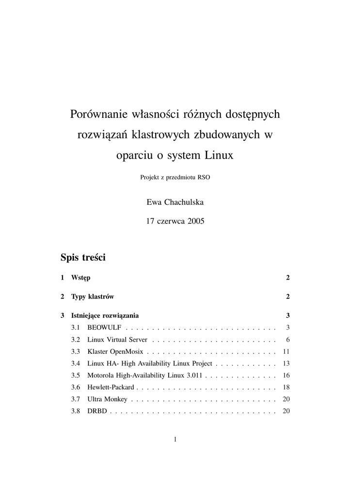Porównanie własności różnych dostępnych rozwiązań klastrowych zbudowanych w oparciu o system Linux Projekt z przedmiotu RSO Ewa Chachulska 17 czerwca 2005 Spis treści 1 Wstęp 2 2 Typy klastrów 2 3 Istniejące rozwiązania 3 3.1 BEOWULF . . . . . . . . . . . . . . . . . . . . . . . . . . . . . 3 3.2 Linux Virtual Server . . . . . . . . . . . . . . . . . . . . . . . . 6 3.3 Klaster OpenMosix . . . . . . . . . . . . . . . . . . . . . . . . . 11 3.4 Linux HA- High Availability Linux Project . . . . . . . . . . . . 13 3.5 Motorola High-Availability Linux 3.011 . . . . . . . . . . . . . . 16 3.6 Hewlett-Packard . . . . . . . . . . . . . . . . . . . . . . . . . . . 18 3.7 Ultra Monkey . . . . . . . . . . . . . . . . . . . . . . . . . . . . 20 3.8 DRBD . . . . . . . . . . . . . . . . . . . . . . . . . . . . . . . . 20 1 2 TYPY KLASTRÓW 4 Bibliografia 22 1 Wstęp Mimo wzrostu wydajności współczesnych komputerów PC, są zadania, które zawsze będą przekraczały możliwości pojedynczej maszyny. Dotyczy to wszelkich zadań obliczeniowych, począwszy od obliczeń matematycznych, kompilacji dużych programów, przez rendering grafiki, a na kompresji plików do formatu MP3 kończąc. Dotyczy to również wszelkich zadań przechowywania lub udostępniania dużej ilości danych. Do takich zadań tworzy się tzw. klastry - połączone grupy komputerów, pracujące pod nadzorem specjalnego oprogramowania, które potrafi rozdzielać pracę między wszystkie pracujące maszyny. Ponieważ uruchamianie klastrów wymagało dotąd zakupu specjalnego, kosztownego sprzętu i oprogramowania, ich budowa była zarezerwowana jedynie dla dużych ośrodków naukowych, firm i administracji państwowej. Obecnie, dzięki Linuksowi i bezpłatnemu oprogramowaniu Open Source klastry wykorzystywane są nie tylko w dużych korporacjach, ale także w małych prywatnych rozwiązaniach. 2 Typy klastrów Jak myślimy o klastrach to pierwszym, co przychodzi do głowy to takie rozwiązania, które mają na celu podnieść wydajność obliczeniową jakiegoś systemu. Takie klastry nazywane są klastrami wydajnościowymi, (high-performance) i są stosowane wszędzie tam gdzie zależy nam na wykonaniu jakiś obliczeń w rozsądnym czasie. Poza rozwiązaniami podnoszącymi wydajność obliczeniową istnieją również systemy zapewniające niezawodną i nieprzerwaną pracę. Klastry wysokiej dostępności (high-availability) są stosowane tam, gdzie do czynienia mamy z aplikacjami, których nieprzerwana praca jest krytyczna dla jakiejś in2 3 ISTNIEJĄCE ROZWIĄZANIA stytucji czy systemu. Kluczem tego typu rozwiązań jest nadmiarowość. Klaster wysokiej dostępności zbudowany jest z wielu maszyn, a ich podzbiory mogą zapewnić określoną usługę. W najprostszym przypadku to jedno urządzenie lub serwer jest dostępny, pozostałe natomiast monitorują jego pracę, aby upewnić się, że wszystko jest poprawnie. Jeśli stwierdzone zostaną błędy to miejsce pierwszego serwera zajmuje jego następca. Istnieje jeszcze jeden typ klastrów. Koncepcja klastrów z równoważeniem obciążenia (load-balancing) jest taka by zapewnić wyższą wydajność dzięki rozproszeniu pracy na wiele komputerów. Na przykład, jeśli serwer WWW jest implementowany z użyciem klastra LB wówczas różne zapytania do serwera są dystrybuowane pomiędzy komputery w klastrze. Może to być realizowane przy użyciu prostego algorytmy Round-Robin. Przykładowo, gdy kierowane jest zapisanie do serwera DNS, ten zwraca adres następnej maszyny w klastrze. Oczywiście istnieją bardziej wyrafinowane algorytmy wykorzystujące sprzężenie zwrotne od każdej z maszyn tak by wybrać maszynę, która najlepiej poradzi sobie z zadaniem. W tej chwili wszystkie przedstawione wyżej koncepcje przeplatają się tak by stworzyć rozwiązania spełniające konkretne wymagania. 3 Istniejące rozwiązania W dalszej części zostaną przedstawione istniejące rozwiązania klastrowe. Są to rozwiązania zarówno zwiększające niezawodność jak i takie, których zadaniem jest zwiększenie wydajności. 3.1 BEOWULF Beowulf to wielokomputerowa architektura, która może zostać użyta do obliczeń równoległych. Jest to system, który na ogół składa się z jednego węzła-serwera i jednego lub więcej węzła-klienta połączonego przez Ethernet lub jakąś inną sieć. Jest to system zbudowany w oparciu o powszechnie dostępne komponenty 3 3 ISTNIEJĄCE ROZWIĄZANIA sprzętowe, jak każdy PC zdolny do uruchomienia Linuxa oraz standardowe karty Ethernet i switch’e. Nie zawiera żadnych unikalnych komponentów sprzętowych i jest łatwy w tworzeniu. Beowulf korzysta również ze zwykłego oprogramowania, jak system operacyjny Linux, Parallel Virtual Machine (PVM) oraz Message Passing Interface (MPI). Węzeł-serwer kontroluje cały klaster i udostępnia pliki klientom. Pełni on także funkcję konsoli klastra i jest jego bramą do zewnętrznego świata. Duże maszyny Beowulf mogą posiadać więcej niż jeden węzeł-serwer, oraz inne węzły stworzone dla specyficznych zadań, na przykład konsole lub stacje monitorujące. W większości przypadków węzły-klienci w systemie Beowulf są głupie, im głupsze tym lepiej. Węzły są konfigurowane i kontrolowane przez węzeł-serwer, i robią tylko to, co kazano im robić. W konfiguracji bezdyskowej klienci nie znają nawet swojego adresu IP lub nazwy, dopóki serwer im ich nie poda. Jedną z podstawowych różnic pomiędzy Beowulf’em a architekturą COW (Cluster of Workstations) jest to, że Beowulf zachowuje się bardziej jak jedna maszyna, niż wiele stacji roboczych. W większości przypadków węzły-klienci nie posiadają klawiatur czy monitorów, a dostęp do nich jest możliwy jedynie przez odległe logowanie bądź opcjonalny terminal szeregowy. Węzły Beowulf można sobie wyobrazić jako pakiet CPU + pamięć, który może zostać podłączony do klastra, tak jak CPU czy moduł pamięci moż