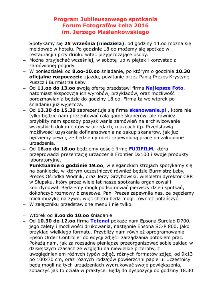Program Jubileuszowego spotkania Forum Fotografów Łeba 2016 im. Jerzego Maślankowskiego – Spotykamy się 25 września (niedziela), od godziny 14.oo można się meldować w hotelu. Po godzinie 18.oo możemy się spotkać w restauracji i przy drinku witać przyjeżdżające osoby. – Można przyjechać wcześniej, w sobotę lub w piątek i korzystać z zamówionej pogody. – W poniedziałek od 8.oo-10.oo śniadanie, po którym o godzinie 10.30 oficjalne rozpoczęcie zjazdu, powitanie przez Panią Prezes Krystynę Puszcz i Burmistrza Łeby. – Od 11.oo do 13.oo swoją ofertę przedstawi firma Najlepsze Foto, natomiast ekspozycja ich wyrobów, przykładów, oraz możliwość porozmawiania będzie do godziny 18.oo. Firma ta we wtorek po śniadaniu już wyjeżdża. – Od 13.30 do 15.30 zaprezentuje się firma skanowanie.pl , która nie tylko będzie nam prezentować całą gamę skanerów, ale również przybliży nam sposoby pozyskiwania zamówień na archiwizowanie wszystkich dokumentów w urzędach, muzeach itp. Przedstawią możliwości uzyskania dofinansowania na zakup skanerów, jak już będziemy pewni, że będziemy mieli zapewnioną pracę na zakupione urzadzenia. – Od 16.oo do 18.oo będziemy gościć firmę FUJIFILM, która przeprowadzi prezentację urzadzenia Frontier Dx100 i swoje produkty laboratoryjne. – Punktualnie o godzinie 19.oo, w eleganckich strojach spotykamy się na bankiecie, w którym uczestniczyć również będzie Burmistrz Łeby, Prezes Ośrodka Wodnik, oraz Jerzy Grzybowski, wieloletni dyrektor CRR w Słupsku, który przez wiele lat nasze spotkania organizował i koordynował. Będziemy mogli podsumować pierwszy dzień spotkań, dokończyć rozmowy biznesowe. Pani Prezes zapewniła nas, że będziemy mieli muzykę na żywo, więc chętni będą mogli również potańczyć. – W załączniku przedstawione menu i nie tylko. – Wtorek od 8.oo do 10.oo śniadanie – Od 10.30 do 12.oo firma Tetenal pokaże nam Epsona Surelab D700, jego zalety i możliwości drukowania, następnie Epsona SC-P 800, jako przykład wielkiego formatu. Przybliży nam również oprogramowanie Epson Order Controller do edycji zdjęć i zarządzania potokiem prac. Pokażą nam, jak za rozsądne pieniądze przeorganizować sobie zakład w dzisiejszych czasach ze względu na niewielkie przeroby, z uwzględnieniem różnych typów zdjęć, różnych formatów zdjęć, od 9x13 po 100x70 cm, oraz różnych rodzajów powierzchni papieru. Uczestnicy będą mogli na tych urządzeniach wydrukować swoje powiększenia, zobaczyć jak to działa w praktyce. Będą do dyspozycji do godziny 18.30 – Od 12.30 do 14.30 firma Profi Book zaprezentuje nam swoje urządzenia do samodzielnej produkcji fotoksiążek, zademonstruje ich działanie. – Od 15.oo do 17.oo powtórnie zaprezentuje się firma FUJIFILM, której przedstawiciele tym razem pokażą nam ich bezusterkowe aparaty, z którymi będziemy mogli sobie zrobić mały plener, a najpiękniejsze zdjęcia wydrukować. – Od 17.30 do 20.oo obiadokolacja w restauracji. Możemy tuataj siedzieć tak długo, dopóki będą ciekawe tematy, nikt nas nie będzie popędzał i wyganiał. – Środa od 8.oo do 10.oo śniadanie, zakończenie spotkania W czasie wszystkich prezentacji będzie można oglądać i ewentualnie zamawiać opakowania do fotografii firmy FOTOPAK, której stoisko będzie cały czas dostępne. Przez cały czas naszego spotkania będzie można oglądać wystawę o naszym niedawno zmarłym koledze – artyście Krzysztofie Niesporku. Wystawę podjął się zorganizować Krajowy Cech Fotografów, którego Krzysztof był członkiem. Forum Fotografów w Łebie początkowo było spotkaniem tylko dla "elity" wśród fotografów, zaproszenia były imienne, każdy przywoził swoje najlepsze prace, które wyznaczały aktualny trend w fotografii. Zawsze były wybierane najlepsze zdjęcia, a konkurencja była zacięta. W początkowych latach przyjeżdżało ponad 100 osób, zapraszano modelki i modeli, urządzano studio, w którym każdy mógł pokazać jak fotografuje, można było wiele się nauczyć, podpatrując pracę innych. Z czasem zaczęto zapraszać różne firmy, które nam pokazywały najnowocześniejszy sprzęt, były wykłady na najbardziej nas interesujące tematy. Każdy wyjeżdża z takiego spotkania naładowany nowymi pomysłami, z nowymi siłami na następny rok pracy. Po śmierci kolegi Jerzego Maślankowskiego, głównego "motoru" tych spotkań, oficjalna nazwa naszych spotkań, to Forum Fotografów im. Jerzego Maślankowskiego. Kilka słów o naszym Patronie Jerzy Maślankowski urodził się 1.VI.1928 roku w Wyszynie koło Płocka. Jego powołanie - to zatrzymać czas w fotografii. Swoje doświadczenie zdobywał w pracy. Umiejętności potwierdził dyplomem mistrza fotografa. Jak sam podkreślał, jego największym osiągnięciem było to, że dzieci - córka i syn oraz wnukowie rozwijają firmę, a On może już spokojnie odpoczywać w swoim domu na wsi. Był członkiem Cechu Rzemiosł Różnych w Płocku. Działał w Izbie Rzemieślniczej Mazowsza, Kurpi i Podlasia, w której pełnił funkcję Przewodniczącego komisji egzaminacyjnej. Był wieloletnim Przewodniczącym Branżowej Komisji Fotografów Związku Rzemiosła Polskiego w Warszawie. Działał w Płockim Towarzystwie Fotograficznym gdzie wielokrotnie prezentował swoje prace. Współtworzył, a 2002 roku reaktywował spotkania fotografów w Łebie. W marcu 2007 roku roku rodzina, koledzy, przyjaciele uczestniczyli w jego ostatniej drodze. Odszedł do Pana Naszego, by robić zdjęcia z wyższego pułapu. Za swoją działalność odznaczony najwyższymi odznaczeniami państwowymi: Krzyżem Kawalerskim Orderu Odrodzenia Polski, Złotym medalem za zasługi dla ZRP im. Jana Kilińskiego, złotą odznaką za wyszkolenie uczniów. Już nigdy więcej nie zaśpiewa „swojej biduli” Pozostanie w naszej pamięci mały wzrostem WIELKI DUCHEM UWAGA WAŻNE!! Niektórzy fot