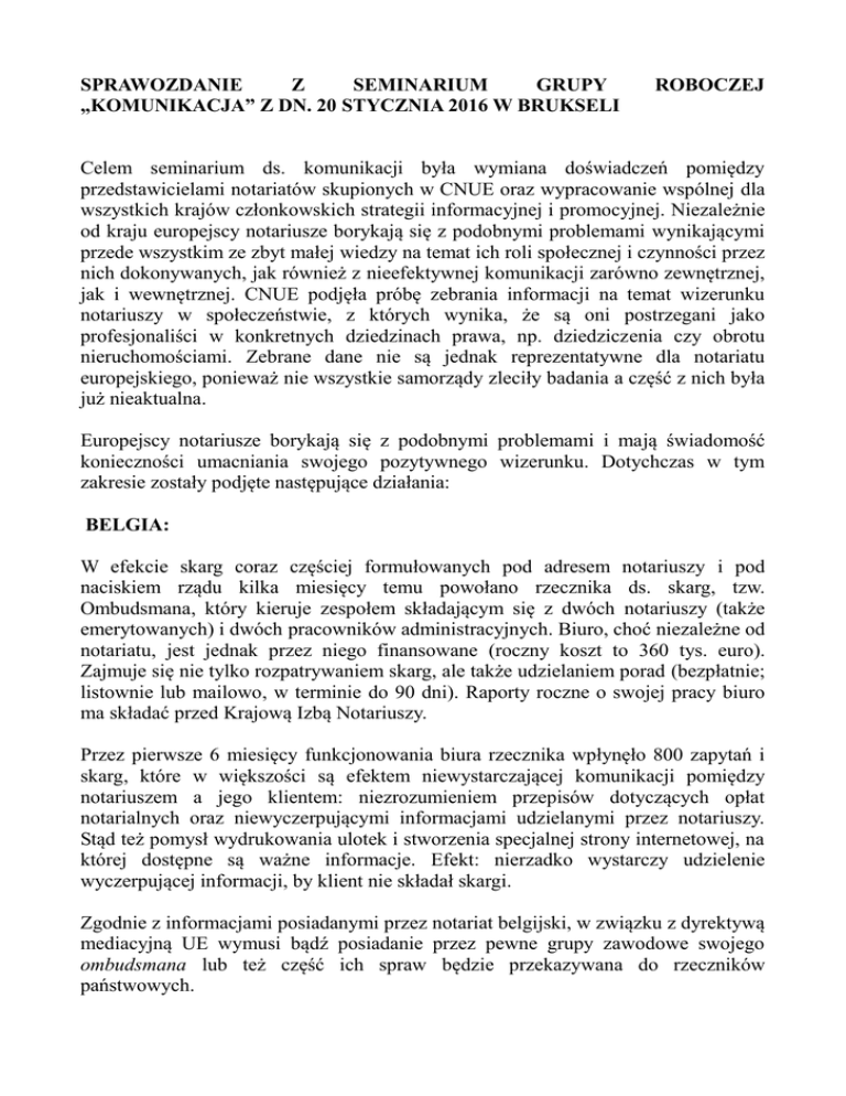 SPRAWOZDANIE Z SEMINARIUM GRUPY „KOMUNIKACJA” Z DN. 20 STYCZNIA 2016 W BRUKSELI ROBOCZEJ Celem seminarium ds. komunikacji była wymiana doświadczeń pomiędzy przedstawicielami notariatów skupionych w CNUE oraz wypracowanie wspólnej dla wszystkich krajów członkowskich strategii informacyjnej i promocyjnej. Niezależnie od kraju europejscy notariusze borykają się z podobnymi problemami wynikającymi przede wszystkim ze zbyt małej wiedzy na temat ich roli społecznej i czynności przez nich dokonywanych, jak również z nieefektywnej komunikacji zarówno zewnętrznej, jak i wewnętrznej. CNUE podjęła próbę zebrania informacji na temat wizerunku notariuszy w społeczeństwie, z których wynika, że są oni postrzegani jako profesjonaliści w konkretnych dziedzinach prawa, np. dziedziczenia czy obrotu nieruchomościami. Zebrane dane nie są jednak reprezentatywne dla notariatu europejskiego, ponieważ nie wszystkie samorządy zleciły badania a część z nich była już nieaktualna. Europejscy notariusze borykają się z podobnymi problemami i mają świadomość konieczności umacniania swojego pozytywnego wizerunku. Dotychczas w tym zakresie zostały podjęte następujące działania: BELGIA: W efekcie skarg coraz częściej formułowanych pod adresem notariuszy i pod naciskiem rządu kilka miesięcy temu powołano rzecznika ds. skarg, tzw. Ombudsmana, który kieruje zespołem składającym się z dwóch notariuszy (także emerytowanych) i dwóch pracowników administracyjnych. Biuro, choć niezależne od notariatu, jest jednak przez niego finansowane (roczny koszt to 360 tys. euro). Zajmuje się nie tylko rozpatrywaniem skarg, ale także udzielaniem porad (bezpłatnie; listownie lub mailowo, w terminie do 90 dni). Raporty roczne o swojej pracy biuro ma składać przed Krajową Izbą Notariuszy. Przez pierwsze 6 miesięcy funkcjonowania biura rzecznika wpłynęło 800 zapytań i skarg, które w większości są efektem niewystarczającej komunikacji pomiędzy notariuszem a jego klientem: niezrozumieniem przepisów dotyczących opłat notarialnych oraz niewyczerpującymi informacjami udzielanymi przez notariuszy. Stąd też pomysł wydrukowania ulotek i stworzenia specjalnej strony internetowej, na której dostępne są ważne informacje. Efekt: nierzadko wystarczy udzielenie wyczerpującej informacji, by klient nie składał skargi. Zgodnie z informacjami posiadanymi przez notariat belgijski, w związku z dyrektywą mediacyjną UE wymusi bądź posiadanie przez pewne grupy zawodowe swojego ombudsmana lub też część ich spraw będzie przekazywana do rzeczników państwowych. W ramach działań komunikacyjnych notariat belgijski planuje także odświeżenie swojego logo (aktualnie to rysunek przedstawiający książkę pióro i wagę). AUSTRIA: Notariat austriacki unowocześnił swoją stronę internetową: aktualnie jest ona dostosowana do urządzeń mobilnych, prostsza w obsłudze i prowadzona w języku niemieckim i angielskim. Podzielona jest na serwis informacyjny dla klientów oraz serwis zamknięty dla notariuszy. Na stronie notariatu są zamieszczane podstawowe informacje dotyczące każdej kancelarii, ponadto każdy notariusz w Austrii ma swoją własną stronę internetową. Kolejną nowością jest projekt „Notariat publiczny” zakładający wyjście notariuszy do obywateli: w specjalnie wyznaczonych miejscach (np. w centrach handlowych) notariusze udzielają informacji na tematy leżące w ich kompetencjach, jak również informują o swojej pracy. Austriacki samorząd notarialny zorganizował Międzynarodową Konferencję Notariuszy Cywilistów oraz kilkanaście spotkań z przedstawicielami małej i średniej przedsiębiorczości (to przez nich jest on często uważany za „hamulcowego” rozwoju oraz za organ niepotrzebnie ograniczający prowadzenie firmy). Nawiązał także współpracę z agencją reklamową w zakresie bardziej ofensywnych działań – efektem jest m.in. akcja plakatowa pt. „Nie pozwólmy, by Austria stała się republiką bananową”, która ma przestrzegać przed liberalizacją prawa dot. zakładania spółek w Austrii i Europie. FRANCJA: Po podjętej przez rząd, pierwszej od lat próbie zmian sposobu funkcjonowania notariuszy – w tym ograniczenia pobieranych przez nich opłat za dokonane czynności – notariat Francji znalazł się w sytuacji kryzysowej. Samodzielnie trudno było skutecznie przeciwstawiać się szermowanym przez ustawodawcę hasłom, takim jak „zmniejszenie strumienia pieniądza płynącego do notariuszy” i „oddania obywatelom 6 miliardów euro”, stąd decyzja o podjęciu współpracy z profesjonalną agencją PR. Na podstawie ustalonej strategii podjęto działania zmierzające do poinformowania społeczeństwa o tym, jak wygląda praca notariusza oraz jaka część pobieranych przez niego opłat stanowi jego przychód. Jednym z działań zapisanych w tej strategii było rozesłanie ulotek informacyjnych do wszystkich notariuszy, by za ich pośrednictwem trafiały do klientów. Kolejnym były – zorganizowane po raz pierwszy w historii francuskiego notariatu – protesty uliczne, w których uczestniczyli notariusze wraz z pracownikami. Wsparcia udzieliły także inne grupy zawodowe. Akcje te były wzmocnione zamieszczanymi w prasie informacjami, które konfrontowały hasła polityków z faktami dotyczącymi pracy notariusza. W efekcie widocznie wzrosła świadomość publiczna dotycząca pracy notariuszy, także wśród polityków, jednakże rząd francuski nie wycofał się z projektu obniżenia taksy notarialnej. Poziom świadomości społecznej nt. pracy notariusza mają podnieść odbywające się w każdą pierwszą sobotę miesiąca spotkania z notariuszami pod hasłem „Spotkaj się ze swoim notariuszem”. Odbywają się one w m.in. w kawiarniach, gdzie klienci mogą porozmawiać z notariuszami w mniej formalnej atmosferze. HISZPANIA: Notariat hiszpański – w ramach wykonania planu komuni
