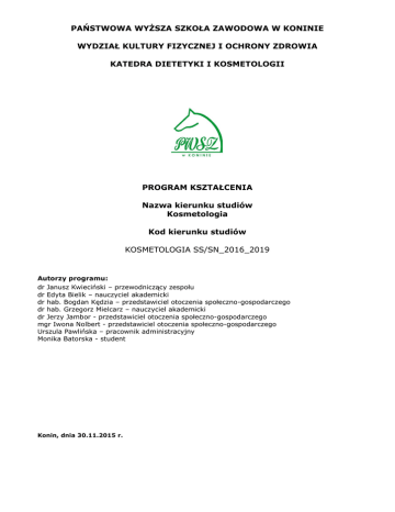 PAŃSTWOWA WYŻSZA SZKOŁA ZAWODOWA W KONINIE WYDZIAŁ KULTURY FIZYCZNEJ I OCHRONY ZDROWIA KATEDRA DIETETYKI I KOSMETOLOGII PROGRAM KSZTAŁCENIA Nazwa kierunku studiów Kosmetologia Kod kierunku studiów KOSMETOLOGIA SS/SN_2016_2019 Autorzy programu: dr Janusz Kwieciński – przewodniczący zespołu dr Edyta Bielik – nauczyciel akademicki dr hab. Bogdan Kędzia – przedstawiciel otoczenia społeczno-gospodarczego dr hab. Grzegorz Mielcarz – nauczyciel akademicki dr Jerzy Jambor - przedstawiciel otoczenia społeczno-gospodarczego mgr Iwona Nolbert - przedstawiciel otoczenia społeczno-gospodarczego Urszula Pawlińska – pracownik administracyjny Monika Batorska - student Konin, dnia 30.11.2015 r. 1. Ogólna charakterystyka kierunku studiów „KOSMETOLOGIA” 1.1. Podstawowe informacje Poziom kształcenia Profil kształcenia Forma studiów Liczba semestrów Tytuł zawodowy uzyskiwany przez absolwenta Obszar kształcenia (wiodący – główny dla kierunku) Obszary kształcenia (pozostałe) Dziedzina nauki (wiodąca – główna dla kierunku) studia pierwszego stopnia praktyczny stacjonarne, niestacjonarne 6 licencjat nauk medycznych i nauk o zdrowiu oraz nauk o kulturze fizycznej nauk przyrodniczych nauk ścisłych nauk medycznych Dziedziny nauki (pozostałe) nauk nauk nauk nauk nauk farmaceutycznych o zdrowiu o kulturze fizycznej biologicznych chemicznych Dyscyplina naukowa (wiodąca – główna dla kierunku) medycyna Dyscypliny naukowe (pozostałe) biologia medyczna biochemia biofizyka biologia mikrobiologia chemia technologia chemiczna 1.2. Koncepcja kształcenia Zgodna z opisem (koncepcją) zawodu KOSMETOLOG /223912/ wg Krajowego Standardu Kwalifikacji Zawodowych (Ministerstwo Pracy i Polityki Społecznej Departament Rynku Pracy). Kosmetolog to specjalista zajmujący się poprawianiem i przywracaniem urody. Zajmuje się profilaktyką, która ma na celu opóźnienie zewnętrznych oznak starzenia się oraz zachowanie jak najdłużej sprawności życiowej, a także problemami dotyczącymi zmian skórnych, które szczególnie niekorzystnie wpływają na wygląd zewnętrzny (wg Krajowego Standardu Kwalifikacji Zawodowych, KOSMETOLOG /223912/, Ministerstwo Pracy i Polityki Społecznej Departament Rynku Pracy). Absolwent uzyskuje przygotowanie do pracy w gabinetach kosmetycznych o pełnym zakresie świadczonych usług, współpracy z lekarzem dermatologiem w zakresie pielęgnacji skóry zmienionej chorobowo oraz systematycznego doskonalenia zawodowego. Absolwent podczas studiów zdobywa umiejętności posługiwania się wiedzą objętą programem studiów, w tym – ogólną z zakresu nauk humanistycznych i nauk o zdrowiu oraz szczegółową z zakresu kosmetologii. W szczególności jest przygotowywany do realizacji następujących działań oraz wykorzystywania w praktyce zawodowej poniższych kompetencji (realizacji zadań): posługiwania się terminologią stosowaną w kosmetyce i kosmetologii; planowania rodzajów z rozpoznaniem; zabiegów kosmetycznych wykonywania zabiegów z zakresu kosmetyki z uwzględnieniem wskazań i przeciwwskazań; i stosowania pielęgnacyjnej, kosmetyków leczniczej i zgodnie upiększającej prawidłowego odczytywania składu kosmetyku i ustalania jego zastosowania; obsługiwania aparatów i urządzeń stosowanych w kosmetyce; sporządzania i stosowania preparatów niezbędnych do wykonywania zabiegów kosmetycznych; określania wpływu preparatów kosmetycznych na skórę i organizm człowieka; rozpoznawania i charakteryzowania rodzaju skóry; diagnozowania stanu skóry oraz przydatków skórnych; 2 prowadzenia ścisłej współpracy z lekarzem dermatologiem w zakresie pielęgnacji skóry zmienionej chorobowo; przestrzegania przepisów bezpieczeństwa i higieny pracy oraz ochrony środowiska; organizowania stanowiska pracy zgodnie z wymaganiami ergonomii; udzielania pierwszej pomocy przedmedycznej; wykonywania zabiegów fizykoterapeutycznych z uwzględnieniem wskazań i przeciwwskazań; posługiwania się językiem obcym (słownictwo ogólne oraz terminologia stosowana w naukach o zdrowiu) w zakresie wspomagającym wykonywanie zadań zawodowych; wykorzystywania informacji o nowościach i trendach rozwojowych w kosmetyce i kosmetologii; czerpania z różnych źródeł informacji oraz z doradztwa specjalistycznego; wykonywania zawodu ze szczególną starannością, zgodnie z zasadami etyki zawodowej; respektowania przepisów prawa dotyczących działalności gospodarczej i wykonywanych zadań zawodowych; prowadzenia działalności gospodarczej; organizowania, wyposażania i prowadzenia gabinetu kosmetycznego. Absolwent może podejmować pracę w gabinetach kosmetycznych, ośrodkach odnowy biologicznej, centrach Spa & Wellness, gabinetach dermatologicznych (w charakterze współpracownika lekarzadermatologa w zakresie pielęgnacji skóry), w ośrodkach badań aplikacyjnych produktów kosmetycznych, firmach produkujących kosmetyki, w szkolnictwie kosmetycznym (pod warunkiem posiadania uprawnień pedagogicznych w rozumieniu przepisów oświatowych), w organizacjach zajmujących się promocją zdrowia i urody. Absolwent studiów pierwszego stopnia na kierunku „kosmetologia” posiada uprawnienia oraz wiedzę umożliwiającą podjęcie studiów drugiego stopnia. 1.3. Związek kierunku studiów z misją i strategią Uczelni oraz strategią Wydziału Kierunek „kosmetologia” w pełni wpisuje się w misję Uczelni jaką jest tworzenie przyjaznego miejsca do studiowania, gdzie będzie można rozwijać swoje talenty i realizować pasje oraz przygotować się do udanego startu zawodowego dzięki wykwalifikowanej kadrze oraz nowoczesnej bazie dydaktycznej na uznanej w regionie i kraju Uczelni. Na terenie Powiatu Konińskiego i powiatów ościennych występuje aktualnie luka edukacyjna związana z brakiem dostępu młodzieży do kształcenia na poziomie studiów na kierunku „kosmetologia” (licencjat). Utworzenie kierunku „kosmetologia” umożliwi dostęp 