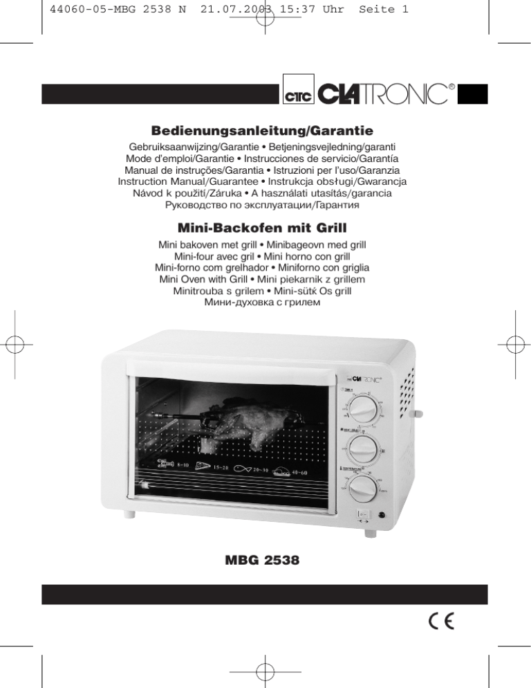 44060-05-MBG 2538 N 21.07.2003 15:37 Uhr Seite 1 R Bedienungsanleitung/Garantie Gebruiksaanwijzing/Garantie • Betjeningsvejledning/garanti Mode d’emploi/Garantie • Instrucciones de servicio/Garantía Manual de instruções/Garantia • Istruzioni per l’uso/Garanzia Instruction Manual/Guarantee • Instrukcja obsługi/Gwarancja Návod k použití/Záruka • A használati utasítás/garancia Руководство по эксплуатации/Гарантия Mini-Backofen mit Grill Mini bakoven met grill • Minibageovn med grill Mini-four avec gril • Mini horno con grill Mini-forno com grelhador • Miniforno con griglia Mini Oven with Grill • Mini piekarnik z grillem Minitrouba s grilem • Mini-sütќ Оs grill Мини-духовка с грилем MBG 2538 44060-05-MBG 2538 N 21.07.2003 15:37 Uhr Seite 2 Allgemeine Sicherheitshinweise D • • • • • • • • • • • • • • • Lesen Sie vor Inbetriebnahme dieses Gerätes die Bedienungsanleitung sehr sorgfältig durch. Bitte bewahren Sie diese Anleitung, den Garantieschein, den Kassenbon und nach Möglichkeit den Karton mit der Innenverpackung gut auf! Das Gerät ist ausschließlich für den privaten und nicht für den gewerblichen Gebrauch bestimmt. Ziehen Sie immer den Stecker aus der Steckdose, wenn Sie das Gerät nicht benutzen, Zubehörteile anbringen, es reinigen oder wenn eine Störung auftritt. Schalten Sie das Gerät zuvor aus. Ziehen Sie am Stecker, nicht am Kabel. Um Kinder vor den Gefahren elektrischer Geräte zu schützen, lassen Sie diese mit dem Gerät niemals unbeaufsichtigt. Wählen Sie den Standort Ihres Gerätes deshalb so, dass Kinder keinen Zugriff auf das Gerät haben. Achten Sie darauf, dass das Kabel nicht herunterhängt. Prüfen Sie das Kabel und das Gerät regelmäßig auf Schäden hin. Ein Gerät ist bei Schäden, egal welcher Art, nicht in Betrieb zu nehmen. Reparieren Sie das Gerät nicht selbst, sondern suchen Sie bitte einen autorisierten Fachmann auf. Um Gefährdungen zu vermeiden, darf ein defektes Netzkabel nur vom Hersteller, unserem Kundendienst oder einer ähnlich qualifizierten Person durch ein gleichwertiges Kabel ersetzt werden. Halten Sie das Gerät und das Kabel fern von Hitze, direkter Sonneneinstrahlung, Feuchtigkeit, scharfen Kanten und ähnlichem. Benutzen Sie das Gerät, selbst für kurze Augenblicke, niemals unbeaufsichtigt! Schalten Sie das Gerät, wenn Sie es nicht benutzen, immer aus. Verwenden Sie nur Original-Zubehör. Verwenden Sie das Gerät nicht im Freien*). Das Gerät darf auf keinen Fall in Wasser oder andere Flüssigkeiten eingetaucht werden oder damit in Berührung kommen*). Benutzen Sie das Gerät nicht mit nassen oder feuchten Händen*). Sollte das Gerät feucht oder nass geworden sein, ziehen Sie sofort den Netzstecker aus der Steckdose*). Nicht ins Wasser greifen! Benutzen Sie das Gerät nur für den vorgesehenen Zweck. *) Beachten Sie bitte die nachfolgenden „Speziellen Sicherheitshinweise...“. Spezielle Sicherheitshinweise für dieses Gerät • • • • • 2 Das Gehäuse wird bei Betrieb heiß! Bitte Topflappen verwenden! Das Gerät nicht in der Nähe von heißen Gegenständen bzw. Wärmequellen aufstellen! Stellen Sie das Gerät auf eine hitzebeständige Unterlage. Um einen Hitzestau zu vermeiden, den Backofen nicht direkt unter einen Schrank stellen. Sorgen Sie für genügend Freiraum! Stellen Sie sicher, dass die Schaltuhr in der Position „0“ steht, wenn Sie das Gerät nicht benutzen. 44060-05-MBG 2538 N 21.07.2003 15:37 Uhr Seite 3 Inbetriebnahme D Fetten Sie das Backblech leicht ein. Betreiben Sie das Gerät mit dem Zubehör (Backblech, Grill-Rost, Grillspieß usw.) auf höchster Temperatur ca. 5 Minuten zur Entfernung der Schutzschichten. Leichte Rauchentwicklung ist dabei normal. Sorgen Sie für ausreichende Belüftung. Anschließend reinigen Sie bitte das Zubehör in einem Spülbad. Bedienung 1. Die Zeitschaltuhr muss auf die Position „0“ gestellt sein. 2. Schließen Sie das Gerät nun an eine vorschriftsmäßig installierte 230V, 50 HzSchutzkontakt-Steckdose an. Die Angaben dazu finden Sie auf demTypenschild. 3. Geben Sie das Gargut entsprechend in den Ofen. 4. Stellen Sie die gewünschte Temperatur ein. 5. Wählen Sie den Funktionsbereich (Ober-, Unter- oder Ober- und Unterhitze). Wenn Sie den Grillspieß verwenden, schalten Sie den Rotationsmotor mit dem Schalter –[––]– ein. 6. Stellen Sie mit der Zeitschaltuhr durch Drehen im Uhrzeigersinn die Gardauer ein. Nach Ablauf der eingestellten Zeit schaltet das Gerät automatisch ab und es ertönt ein kurzes Klingelzeichen. 7. Bei Garzeiten von weniger als 5 Minuten drehen Sie bitte die Zeitschaltuhr zuerst auf ca. 15 Minuten und dann bis auf z. B. 3 Minuten zurück. Somit geht die Uhr genauer. Hier empfiehlt es sich, den Ofen kurz vorzuheizen (etwa 3 Minuten lang). 8. Wenn der Ofen abgeschaltet ist, können Sie die Tür wieder öffnen und das Essen mit einem Topflappen herausnehmen.(Vorsicht: Heiß! ). Zubehör: Rost: Backblech: Hebe-Griffe: zum Toasten; als Untersatz für Backformen für Pizza, Unterlage zum Überbacken, als Fettpfanne zum Herausnehmen des heißen Backblechs und zum Einhängen und Herausnehmen des Grillspießes. Übersicht der Backzeiten: GARGUT Pizza Fleisch Toast Gebäck Schaschlik Braten Geflügel Warmhalten TEMPERATUR/ °C 150-180 200-240 120-160 120-180 200-240 210-230 200-230 50-70 ZEIT/Min. 10-20 12-18 3-5 10-15 40-60 60-80 70-120 3 44060-05-MBG 2538 N 21.07.2003 15:37 Uhr Seite 4 Reinigung & Lagerung D • • • • Ziehen Sie den Stecker aus der Steckdose. Das Gerät nur im abgekühlten Zustand reinigen oder lagern. VERBRENNUNGSGEFAHR! Alle Zubehörteile können Sie in einem Spülbad spülen. Das Innere des Gerätes ist selbstreinigend und bedarf keiner Pflege. Verwenden Sie keine scharfen oder scheuernden Reinigungsmittel. Wischen Sie nicht an dem Heizelement. Kratzen Sie nicht an der Schutzschicht des Backbleches. Krümel od