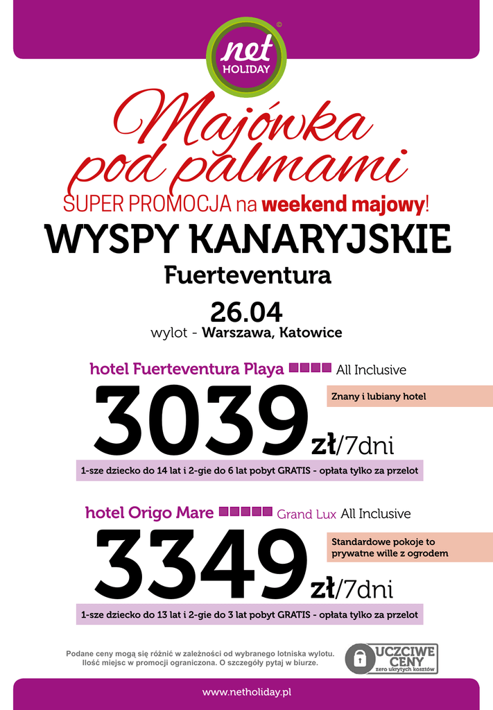 Majówka pod palmami SUPER PROMOCJA na weekend majowy! WYSPY KANARYJSKIE Fuerteventura 26.04 wylot - Warszawa, Katowice hotel Fuerteventura Playa 3039 3349 All Inclusive Znany i lubiany hotel zł/7dni 1-sze dziecko do 14 lat i 2-gie do 6 lat pobyt GRATIS - opłata tylko za przelot hotel Origo Mare Grand Lux All Inclusive Standardowe pokoje to prywatne wille z ogrodem zł/7dni 1-sze dziecko do 13 lat i 2-gie do 3 lat pobyt GRATIS - opłata tylko za przelot Podane ceny mogą się różnić w zależności od wybranego lotniska wylotu. Ilość miejsc w promocji ograniczona. O szczegóły pytaj w biurze. www.netholiday.pl Majówka pod palmami SUPER PROMOCJA na weekend majowy! WYSPY KANARYJSKIE Teneryfa 30.04 wylot - Warszawa, Katowice hotel Blue Sea Lagos de Cesar 2899 3199 All Inclusive W pobliżu słynne klify Los Gigantes zł/7dni 1-sze dziecko do 13 lat pobyt GRATIS - opłata tylko za przelot hotel Aguamarina Golf All Inclusive Duże zaplecze rekreacyjne zł/7dni 1-sze dziecko do 14 lat i 2-gie do 6 lat pobyt GRATIS - opłata tylko za przelot Podane ceny mogą się różnić w zależności od wybranego lotniska wylotu. Ilość miejsc w promocji ograniczona. O szczegóły pytaj w biurze. www.netholiday.pl Majówka pod palmami SUPER PROMOCJA na weekend majowy! GRECJA Kreta 26.04 wylot - Warszawa, Katowice hotel Themis Beach 1999 2179 All Inclusive Przy pięknej piaszczystej plaży zł/7dni 1-sze dziecko do 14 lat i 2-gie do 14 lat pobyt GRATIS - opłata tylko za przelot hotel Peninsula All Inclusive Przpiękne położenie zł/7dni 1-sze dziecko do 14 lat i 2-gie do 6 lat pobyt GRATIS - opłata tylko za przelot Podane ceny mogą się różnić w zależności od wybranego lotniska wylotu. Ilość miejsc w promocji ograniczona. O szczegóły pytaj w biurze. www.netholiday.pl Majówka pod palmami SUPER PROMOCJA na weekend majowy! GRECJA Rodos 27.04 wylot - Warszawa, Katowice hotel Anavadia All Inclusive 1899 2099 Odnowiony w 2014 roku zł/7dni 1-sze dziecko do 13 lat i 2-gie do 13 lat pobyt GRATIS - opłata tylko za przelot hotel Smartline Kolymbia Star All Inclusive Nowy Aqua Park w hotelu zł/7dni 1-sze dziecko do 14 lat i 2-gie do 14 lat pobyt GRATIS - opłata tylko za przelot Podane ceny mogą się różnić w zależności od wybranego lotniska wylotu. Ilość miejsc w promocji ograniczona. O szczegóły pytaj w biurze. www.netholiday.pl Majówka pod palmami SUPER PROMOCJA na weekend majowy! GRECJA Zakynthos 01.05 wylot - Warszawa, Katowice hotel Admiral Tsilivi All Inclusive 1999 Wstęp do Aqua Parku GRATIS zł/7dni 1-sze dziecko do 14 lat pobyt GRATIS - opłata tylko za przelot Podane ceny mogą się różnić w zależności od wybranego lotniska wylotu. Ilość miejsc w promocji ograniczona. O szczegóły pytaj w biurze. www.netholiday.pl Majówka pod palmami SUPER PROMOCJA na weekend majowy! WŁOCHY Sycylia 26.04 wylot - Warszawa, Katowice hotel Admiral Tsilivi All Inclusive 1999 Bezpośrednio przy „Karaibskiej” plaży z białym piaskiem - bezpłatne leżaki i parasole zł/7dni 1-sze dziecko do 14 lat i 2-gie do 6 lat pobyt GRATIS - opłata tylko za przelot Podane ceny mogą się różnić w zależności od wybranego lotniska wylotu. Ilość miejsc w promocji ograniczona. O szczegóły pytaj w biurze. www.netholiday.pl Majówka pod palmami SUPER PROMOCJA na weekend majowy! TUNEZJA 30.04 wylot - Warszawa, Katowice hotel Ramada Liberty Resort 1659 1899 All Inclusive All Inclusive na plaży zł/7dni 1-sze dziecko do 12 lat pobyt GRATIS - opłata tylko za przelot hotel Framissima Regency All Inclusive Bogaty program animacyjny zł/7dni 1-sze dziecko do 12 lat pobyt GRATIS - opłata tylko za przelot Podane ceny mogą się różnić w zależności od wybranego lotniska wylotu. Ilość miejsc w promocji ograniczona. O szczegóły pytaj w biurze. www.netholiday.pl Majówka pod palmami SUPER PROMOCJA na weekend majowy! MAROKO 01.05 wylot - Warszawa, Katowice hotel Beach Albatros 2499 2229 All Inclusive Znakomite All Inclusive zł/7dni 1-sze dziecko do 12 lat pobyt GRATIS - opłata tylko za przelot wycieczka Cesarskie Miasta HB - śniadania i obiadokolacje Sprawdzony program zwiedzania zł/7dni Kameralne grupy - zwiedzanie bez pośpiechu Podane ceny mogą się różnić w zależności od wybranego lotniska wylotu. Ilość miejsc w promocji ograniczona. O szczegóły pytaj w biurze. www.netholiday.pl Majówka pod palmami SUPER PROMOCJA na weekend majowy! TURCJA Alanya 29.04 wylot - Warszawa, Katowice hotel Oba Time All Inclusive 1649 1999 Blisko centrum Alanii zł/7dni 1-sze dziecko do 13 lat pobyt GRATIS - opłata tylko za przelot hotel Kahya Resort Aqua & Spa All Inclusive Aqua Park w hotelu zł/7dni 1-sze dziecko do 13 lat i 2-gie do 7 lat pobyt GRATIS - opłata tylko za przelot Podane ceny mogą się różnić w zależności od wybranego lotniska wylotu. Ilość miejsc w promocji ograniczona. O szczegóły pytaj w biurze. www.netholiday.pl