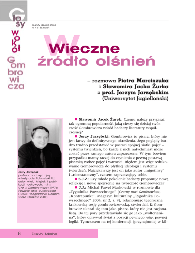 Zeszyty Szkolne 2004 nr 4 (14) jesień Wieczne W źródło olśnień – rozmowa Piotra Marciszuka i Sławomira Jacka Żurka z prof. Jerzym Jarzębskim (Uniwersytet Jagielloński) Jerzy Jarzębski profesor nadzwyczajny w Instytucie Polonistyki UJ; autor wielu książek i publi− kacji naukowych, m.in.: Gra w Gombrowicza (1977); Powieść jako autokreacja (1984); Podglądanie Gombro− wicza (Kraków 2001) 8 Zeszyty Szkolne n Sławomir Jacek Żurek: Czemu należy przypisać tak ogromną popularność, jaką cieszy się dzisiaj twórczość Gombrowicza wśród badaczy literatury współczesnej? n Jerzy Jarzębski: Gombrowicz to pisarz, który nie jest łatwy do definitywnego określenia. Jego poglądy bardzo trudno przedstawić w postaci spójnej siatki pojęć – systemu twierdzeń, bo każde z nich natychmiast może zostać przez samego autora zaprzeczone. W tym bowiem przypadku mamy raczej do czynienia z pewną postawą pisarską wobec pojęć i wartości. Błędem jest więc redukowanie Gombrowicza do płytkiej ideologii i systemu twierdzeń. Najciekawszy jest on jako autor „migotliwy” i „nieostateczny”, czasem zaprzeczający sobie. n S.J.Ż.: Czy młode pokolenie badaczy proponuje nową refleksję i nowe spojrzenie na twórczość Gombrowicza? n J.J.: Michał Paweł Markowski w rozmowie dla „Tygodnika Powszechnego” (Czarny nurt Gombrowicza, „Kontrapunkt”. Magazyn kulturalny „Tygodnika Powszechnego” 2004, nr 2, s. 9), relacjonując tegoroczną krakowską sesję gombrowiczowską, stwierdził, iż Gombrowicz ukazał się tam jako pisarz, który nie jest racjonalistą. Do tej pory przedstawiało się go jako „wolterianina”, który opisywał świat z pozycji pewnego ratio, pewnej logiki. Tymczasem na tej konferencji (przynajmniej w kil- Wieczne źródło olśnień ku referatach) ukazał się jako ktoś stojący nad przepaścią, niewyrażalny do końca, pisarz, który opuszcza teren logicznego wywodu i idzie w stronę bełkotu, będącego wyrazem niedostateczności języka. n S.J.Ż.: Gdyby tak spojrzeć na mapę i poszukać na niej gombrowiczowskich ośrodków badawczych, to gdzie są dzisiaj najbardziej prężne? n J.J.: Ciekawe jest, że w tej kwestii sytuacja się wciąż zmienia. Kiedyś niewątpliwie silnym ośrodkiem był Instytut Badań Literackich PAN i w ogóle Warszawa. To tutaj tworzyli „gombrowiczologię” profesorowie, m.in.: Włodzimierz Bolecki, Danuta Danek, Michał Głowiński, Maria Janion, Zdzisław Łapiński. Drugim ośrodkiem był Kraków dzięki osobie prof. Jana Błońskiego (pierwszy redaktor tekstów Gombrowicza) i jego uczniom, do których się zaliczam także ja. Natomiast w tej chwili punkt ciężkości jakby się trochę z Warszawy i Krakowa przeniósł. Na wspomnianej już konferencji pojawiło się wielu młodych ludzi, tuż przed doktoratem lub tuż po nim, którzy pochodzą m.in. z Poznania, Katowic, Wrocławia czy Gdańska. n S.J.Ż.: A czy poza Polską można by wskazać takie miejsca, gdzie badacze podejmują refleksję gombrowiczowską? n J.J.: Oczywiście. Tradycyjnie bardzo mocnym ośrodkiem jest Francja. Swego czasu wyszła tam praca zbiorowa, świadcząca o wpływie pisarza na dwa pokolenia badaczy i artystów: Gombrowicz vingt ans après. Tam też pojawiła się cała plejada krytyków, którzy mieli o nim coś istotnego do powiedzenia, np. nieżyjący już Dominique de Roux, Lakis Proguidis, Jean Decottignies, Małgorzata Smorąg-Goldberg, Manuel Carcassonne, Jean- -Pierre Salgas, Pierre Pachet. Gombrowicz należy we Francji do kanonu literackiego i wielu Francuzów uważa wręcz, że to jest francuski pisarz, nic nie wiedząc o tym, że on był Polakiem. Również w Niemczech jest sporo ciekawych badaczy, którzy zajmują się Gombrowiczem w różnych aspektach, np. Rolf Fieguth, Olaf Kühl, Hanjo Beressem, a w Stanach Zjednoczonych pojawiają się teksty o Gombrowiczu z pogranicza filozofii i socjologii postmodernistycznej oraz tzw. queer theory, analizujące jego seksualność, a także usytuowanie wobec społecznych i narodowych stereotypów, np. przetłumaczone w Polsce Grymasy Gombrowicza pod redakcją Ewy Płonowskiej-Ziarek. n S.J.Ż.: Panie Profesorze, kim był ostatecznie Witold Gombrowicz – filozofem, dramaturgiem, powieściopisarzem czy po prostu wielkim prowokatorem? n J.J.: [westchnięcie – red.] Wszystkim po trochu… Nie podejmuję się powiedzieć, kim był. Boję się, że jak zacząłbym definiować, to on wtedy tam z góry, z nieba zaraz by mnie zmiażdżył… Gombrowicz chciał być wszystkim. Jego namiętnością było istnienie ponad wszelkiego rodzaju podziałami. Kiedy pojawiał się jakikolwiek nowy nurt, np. w filozofii czy literaturoznawstwie, to on wtedy mówił: „To ja…”, „To ja byłem pierwszym strukturalistą”, pierwszym egzystencjalistą, dziś powiedziałby, że był pierwszym dekonstrukcjonistą… n S.J.Ż.: Jakby dzisiaj – Pana zdaniem – zareagował Gombrowicz, gdyby usłyszał, że ktoś nazywa go „pierwszym polskim postmodernistą”? n J.J.: Zgodziłby się z nim z chęcią. Gombrowicz bowiem z jednej strony borykał się z upływem czasu – martwiło go, że jest jakby odsunięty na Zeszyty Szkolne 9 rozmowa z prof. Jerzym Jarzębskim bok przez ten upływ, a jednocześnie inwazję nowych idei. Stąd zawsze chciał być pionierem, zawsze na szczycie, na fali, biegnąc w przyszłość. Z drugiej strony, ta postawa była w przypadku Gombrowicza marketingową strategią, której on sam był głęboko świadom – wiedział, że pisarz musi się sprzedawać w księgarni. On czuł, że powiedzenie „byłem jednym z pierwszych postmodernistów” byłoby w sumie nierynkowe i że należy mówić: „byłem pierwszym”. n S.J.Ż.: A w takim razie, trochę zmieńmy wcześniejsze pytanie i zapytajmy, kim on jest dla Pana? n J.J.: Wiecznym źródłem olśnień. Czytając Gombrowicza, nigdy się nie nudzę, zawsze znajduję w jego tekstach coś interesującego. On j