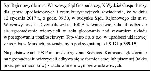 Sąd Rejonowy dla m.st. Warszawy, Sąd Gospodarczy, X Wydział Gospodarczy dla spraw upadłościowych i restrukturyzacyjnych zawiadamia, że w dniu 12 stycznia 2017 r., o godz. 09.30, w budynku Sądu Rejonowego dla m.st. Warszawy przy ul. Czerniakowskiej 100 A w Warszawie, sala 14, odbędzie się zgromadzenie wierzycieli w celu głosowania nad zawarciem układu w postępowaniu upadłościowym Top-Vitro Sp. z o.o. w upadłości układowej z siedzibą w Markach, prowadzonym pod sygnaturą akt X GUp 339/15. Na podstawie art. 198 Puin oraz zarządzenia Sędziego Komisarza głosowanie na zgromadzeniu wierzycieli odbywa się w formie ustnej lub pisemnej (także przez pełnomocników) z zachowaniem wymogów ustawowych.
