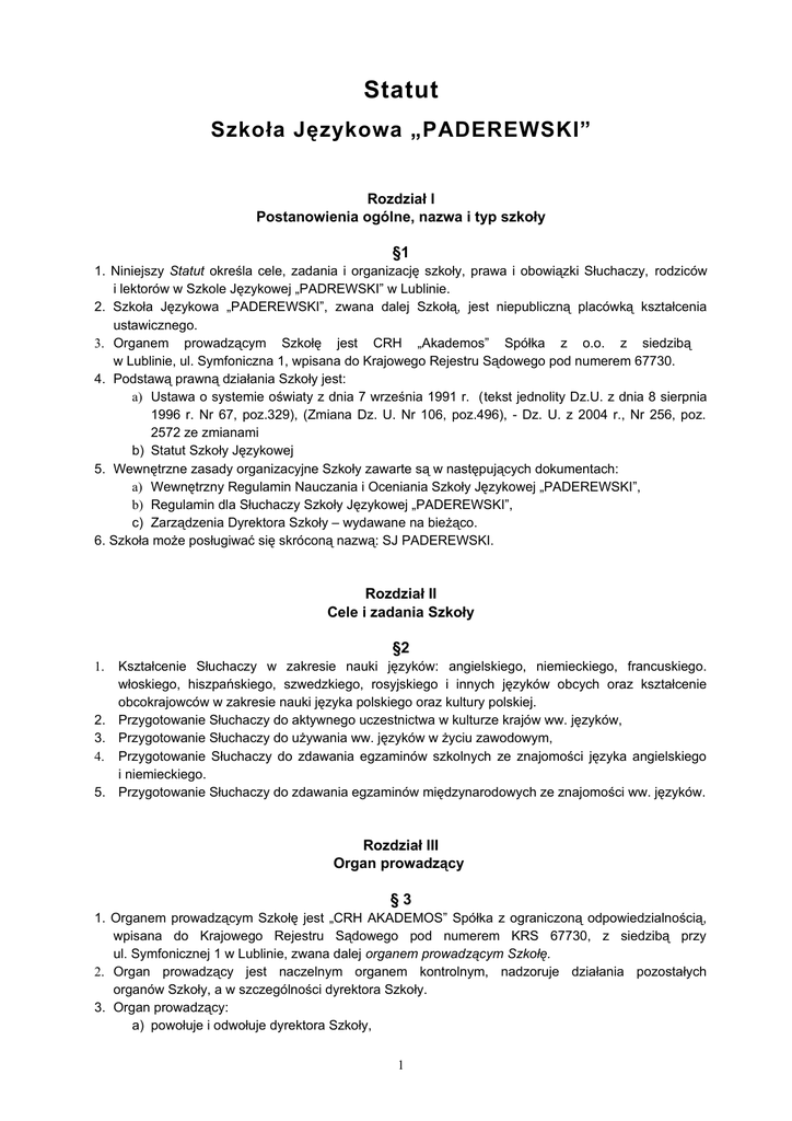 Statut Szkoła Językowa „PADEREWSKI” Rozdział I Postanowienia ogólne, nazwa i typ szkoły §1 1. Niniejszy Statut określa cele, zadania i organizację szkoły, prawa i obowiązki Słuchaczy, rodziców i lektorów w Szkole Językowej „PADREWSKI” w Lublinie. 2. Szkoła Językowa „PADEREWSKI”, zwana dalej Szkołą, jest niepubliczną placówką kształcenia ustawicznego. 3. Organem prowadzącym Szkołę jest CRH „Akademos” Spółka z o.o. z siedzibą w Lublinie, ul. Symfoniczna 1, wpisana do Krajowego Rejestru Sądowego pod numerem 67730. 4. Podstawą prawną działania Szkoły jest: a) Ustawa o systemie oświaty z dnia 7 września 1991 r. (tekst jednolity Dz.U. z dnia 8 sierpnia 1996 r. Nr 67, poz.329), (Zmiana Dz. U. Nr 106, poz.496), - Dz. U. z 2004 r., Nr 256, poz. 2572 ze zmianami b) Statut Szkoły Językowej 5. Wewnętrzne zasady organizacyjne Szkoły zawarte są w następujących dokumentach: a) Wewnętrzny Regulamin Nauczania i Oceniania Szkoły Językowej „PADEREWSKI”, b) Regulamin dla Słuchaczy Szkoły Językowej „PADEREWSKI”, c) Zarządzenia Dyrektora Szkoły – wydawane na bieżąco. 6. Szkoła może posługiwać się skróconą nazwą: SJ PADEREWSKI. Rozdział II Cele i zadania Szkoły §2 Kształcenie Słuchaczy w zakresie nauki języków: angielskiego, niemieckiego, francuskiego. włoskiego, hiszpańskiego, szwedzkiego, rosyjskiego i innych języków obcych oraz kształcenie obcokrajowców w zakresie nauki języka polskiego oraz kultury polskiej. 2. Przygotowanie Słuchaczy do aktywnego uczestnictwa w kulturze krajów ww. języków, 3. Przygotowanie Słuchaczy do używania ww. języków w życiu zawodowym, 4. Przygotowanie Słuchaczy do zdawania egzaminów szkolnych ze znajomości języka angielskiego i niemieckiego. 5. Przygotowanie Słuchaczy do zdawania egzaminów międzynarodowych ze znajomości ww. języków. 1. Rozdział III Organ prowadzący §3 1. Organem prowadzącym Szkołę jest „CRH AKADEMOS” Spółka z ograniczoną odpowiedzialnością, wpisana do Krajowego Rejestru Sądowego pod numerem KRS 67730, z siedzibą przy ul. Symfonicznej 1 w Lublinie, zwana dalej organem prowadzącym Szkołę. 2. Organ prowadzący jest naczelnym organem kontrolnym, nadzoruje działania pozostałych organów Szkoły, a w szczególności dyrektora Szkoły. 3. Organ prowadzący: a) powołuje i odwołuje dyrektora Szkoły, 1 b) zatrudnia i zwalnia pracowników Szkoły (na wniosek dyrektora Szkoły), c) zapewnia warunki działania Szkoły, d) wyposaża Szkołę w środki niezbędne do prowadzenia działalności statutowej, e) zatwierdza corocznie budżet Szkoły, f) podejmuje decyzje w nadzwyczajnych sprawach finansowych obciążających budżet Szkoły, g) podejmuje decyzje o współpracy mającej znaczenie strategiczne dla Szkoły, h) prowadzi i nadzoruje inwestycje Szkoły, i) zatwierdza plany promocyjne Szkoły, j) rozpatruje odwołania od decyzji dyrektora Szkoły, k) zatwierdza zmiany w odpowiednich dokumentach Szkoły, 4. Organ prowadzący odpowiada za: a) realizację budżetu Szkoły, b) jakość i poziom warunków i środków działania Szkoły, c) remonty i inwestycje Szkoły. 5. Organ prowadzący jest reprezentowany przez upoważnione do jego reprezentacji osoby. 6. Kompetencje statutowe organu prowadzącego wypełnia Zarząd organu prowadzącego. Rozdział IV Organy Szkoły §4 1. Organami Szkoły są: a) Dyrektor Szkoły b) Metodyk Szkoły §5 1. Organ prowadzący powołuje dyrektora Szkoły na okres 4 lat. 2. Dyrektor Szkoły może złożyć rezygnację przed upływem kadencji. 3. Organ prowadzący może odwołać dyrektora Szkoły w z ważnych przyczyn. trybie natychmiastowym §6 1. Dyrektor Szkoły jest naczelnym organem wykonawczym Szkoły, który nadzoruje działania lektorów i administracji. 2. Dyrektor Szkoły: a) reprezentuje Szkołę, b) dba o prestiż i dobre imię oraz o jakość pracy Szkoły, c) realizuje strategię rozwoju Szkoły, d) wyznacza i nadzoruje wykonywanie obowiązków przez osoby pracujące dla Szkoły oraz kieruje ich pracą, e) ustala zasady rekrutacji do Szkoły, f) ustala i zmienia wysokość czesnego, g) określa Regulamin dla Słuchaczy Szkoły h) określa Zakres obowiązków i uprawnień pracowników Szkoły, i) określa Roczny terminarz pracy Szkoły (w tym terminarz oceniania), j) opracowuje siatkę grup i godzin na dany rok szkolny, k) zatwierdza harmonogram nauczania, l) zwołuje posiedzenia Lektorów Szkoły, m) powierza zlecenia i dzieła do wykonania, także na wniosek metodyka Szkoły, n) podpisuje umowy z - placówkami edukacyjnymi wykonującymi zadania dydaktyczne na rzecz Szkoły, - placówkami korzystającymi z usług edukacyjnych Szkoły, 2 - placówkami podejmującymi współpracę ze Szkołą, o) rekrutuje pracowników administracyjnych, p) zatwierdza programy autorskie do realizacji w Szkole oraz programy Szkoły, q) podpisuje zaświadczenia wystawiane przez Szkołę, r) przygotowuje budżet roczny Szkoły, sprawuje kontrolę nad wydatkami Szkoły, odpowiada za prawidłowe wykorzystanie wydatków Szkoły oraz gospodaruje środkami Szkoły, s) rozpatruje odwołania od decyzji wicedyrektora, t) przygotowuje organizację pracy Szkoły: - zatwierdza tygodniowy plan zajęć, - przydziela czynności - dydaktyczne i pozadydaktyczne, - zatwierdza podział słuchaczy na grupy, u) organizuje bieżącą pracę Szkoły - organizuje i/lub nadzoruje współpracę Szkoły z innymi organizacjami i placówkami - organizuje i/lub nadzoruje udział Szkoły w imprezach kulturalnych i środowiskowych, - organizuje nabór Słuchaczy do Szkoły, - organizuje i/lub nadzoruje promocję i reklamę Szkoły, - pozyskuje materiały i pomoce dydaktyczne dla Szkoły, - organizuje, jeśli istnieje taka potrzeba, zebrania z Rodzicami Słuchaczy niepełnoletnich, - zapewnia systematyczną informację dla Rodziców o wynikach w nauce ich dzieci, - czuwa nad realizacją terminarza pracy Szkoły, v) sprawuje nadzór pedagogiczny na
