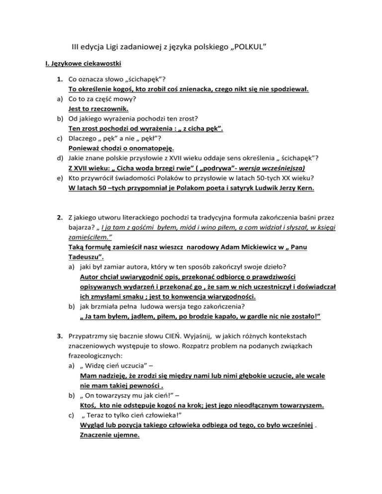 III edycja Ligi zadaniowej z języka polskiego „POLKUL” I. Językowe ciekawostki 1. Co oznacza słowo „ścichapęk”? To określenie kogoś, kto zrobił coś znienacka, czego nikt się nie spodziewał. a) Co to za część mowy? Jest to rzeczownik. b) Od jakiego wyrażenia pochodzi ten zrost? Ten zrost pochodzi od wyrażenia : „ z cicha pęk”. c) Dlaczego „ pęk” a nie „ pękł”? Ponieważ chodzi o onomatopeję. d) Jakie znane polskie przysłowie z XVII wieku oddaje sens określenia „ ścichapęk”? Z XVII wieku: „ Cicha woda brzegi rwie” ( „podrywa”- wersja wcześniejsza) e) Kto przywrócił świadomości Polaków to przysłowie w latach 50-tych XX wieku? W latach 50 –tych przypomniał je Polakom poeta i satyryk Ludwik Jerzy Kern. 2. Z jakiego utworu literackiego pochodzi ta tradycyjna formuła zakończenia baśni przez bajarza? „ I ja tam z gośćmi byłem, miód i wino piłem, a com widział i słyszał, w księgi zamieściłem.” Taką formułę zamieścił nasz wieszcz narodowy Adam Mickiewicz w „ Panu Tadeuszu”. a) jaki był zamiar autora, który w ten sposób zakończył swoje dzieło? Autor chciał uwiarygodnić opis, przekonać odbiorcę o prawdziwości opisywanych wydarzeń i przekonać go , że sam w nich uczestniczył i doświadczał ich zmysłami smaku ; jest to konwencja wiarygodności. b) jak brzmiała pełna ludowa wersja tego zakończenia? „ Ja tam byłem, jadłem, piłem, po brodzie kapało, w gardle nic nie zostało!” 3. Przypatrzmy się bacznie słowu CIEŃ. Wyjaśnij, w jakich różnych kontekstach znaczeniowych występuje to słowo. Rozpatrz problem na podanych związkach frazeologicznych: a) „ Widzę cień uczucia” – Mam nadzieję, że zrodzi się między nami lub nimi głębokie uczucie, ale wcale nie mam takiej pewności . b) „ On towarzyszy mu jak cień!” – Ktoś, kto nie odstępuje kogoś na krok; jest jego nieodłącznym towarzyszem. c) „ Teraz to tylko cień człowieka!” Wygląd lub pozycja takiego człowieka odbiega od tego, co było wcześniej . Znaczenie ujemne. d) „ To wydarzenie kładzie się cieniem na naszych dotychczasowych stosunkach.” Nasze stosunki pogorszyły się na wskutek jakiegoś wydarzenia. e) „W tej sprawie pojawił się cień podejrzenia!” – Pojawiła się przesłanka czegoś złego, ale jest ona bardzo nieuchwytna. f) Wyjaśnij, dlaczego wyraz „ CIEŃ” to homonim. Wyraz „cień” jest homonimem, ponieważ posiada różnorodne znaczenia. 4. Rozpatrzmy inny ciekawy przykład powiedzenia, które funkcjonuje w naszym języku, a jego autorką jest Agnieszka Osiecka: „ Nie o to chodzi by złowić króliczka, ale by gonić go.” a) Jaki jest tytuł utworu, z którego pochodzi ten cytat i kiedy powstał? Utwór nosi nazwę nazwę „ Króliczek” i powstał w 1967 roku. b) Jaki to środek poetycki? Hiperbola Powtórzenie Metafora Animizacja Oksymoron c) Wyjaśnij, dlaczego określenie „AUTOTELIZACJA DZIAŁANIA” pasuje do przytoczonego tekstu Osieckiej? Ponieważ my sami musimy zdecydować, co jest ważniejsze: cel do którego dążymy, czy też działania, czyli sam proces dążenia do celu. d) Co oznacza to powiedzenie w sensie metaforycznym? Lepiej dążyć do celu dla samego dążenia, niż osiągnąć cel i tym samym stracić go, bo przecież cel oznacza koniec! II. Czy stare przysłowia mogą być jeszcze aktualne? Czy rozumiesz ich sens? a) „ Dano mu kijec za siekierkę.” ( XVII wiek); dla ułatwienia; Jan Brzechwa uwspółcześnił to przysłowie, które dzisiaj brzmi: „ Zamienił stryjek siekierkę na kijek” Ktoś zrobił bardzo zły interes! b) „ Zastaw się, a postaw się” ; Samuel Adalberg, 1894 r. Nie liczenie się z własnymi możliwościami finansowymi wówczas, gdy chcemy komuś zaimponować, udowodnić, że mamy gest, że nas na to stać. Udowadniamy swoją gościnność, stać nas na przepych i wystawność, choć często tylko dlatego ,że się zadłużamy. c) „ Pokorne cielę dwie matki ssie”; Jacek Przybylski. 1819 r. Przedstaw znaczenie tego przysłowia w dwóch kontekstach znaczeniowych: pozytywnym i negatywnym Kontekst pozytywny: Ktoś bardzo pokorny może liczyć na dodatkowe korzyści. Kontekst negatywny: Rezygnacja z własnej dumy w zamian za materialne korzyści. d) „ Nieszczęścia chodzą parami”; Tadeusz Jaroszyński, 1908 r. Często, niestety, zło nie występuje samotnie, ale towarzyszy mu inne zło. e) „ Mądrej głowie dość dwie słowie”; XVIII w. Jeśli ktoś jest mądry, to szybko coś zrozumie i nie trzeba mu długich wyjaśnień. Na przykładzie tego przysłowia wyjaśnij, czym dawniej była w języku polskim LICZBA PODWÓJNA Wyraz „ słowie” to ciekawy przykład starej w języku polskim liczby podwójnej, która wskazywała, że chodzi wyłącznie o DWA słowa, nie więcej. III. Co mówią nam słynne rzeźby i obrazy? a) Przyjrzyj się dokładnie piedestałowi, na którym Benvenuto Cellini umieścił postaci Wenus i Merkurego w rzeźbie „ Perseusz z głową Meduzy”. Wyjaśnij, jaki związek ze zdrowiem i spiskiem na jego życie pełnią ci mitologiczni bogowie. Trzeba przyznać, że to mrożąca krew w żyłach historia, która, paradoksalnie pomogła włoskiemu artyście… Wenus To symbol choroby wenerycznej, która trapiła artystę. Merkury Po łacinie Marcunius to rtęć. Ta trucizna wiąże się ze spiskiem na życie Celliniego. Artysta chorował na syfilis, z którego , wbrew zamiarom zabójców, wyleczył go posiłek, który został przez morderców polany rtęcią. Paradoksalnie rtęć wyleczyła go z syfilisu i wdzięczny Cellini nie podał niedoszłych zabójców do sądu. Na pamiątkę tego niezwykłego wydarzenia umieścił swoją historię w alegorycznych postaciach greckich bogów. . Merkury IV. Czy wielcy artyści to nudziarze, całkowicie oderwani od rzeczywistości? Nierozsądne byłoby udowadnianie, że „ Mickiewicz wielkim poetą był”, bo wiadomo, że był! O ile ciek