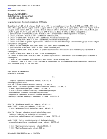 Uchwały RM 2002-2006 Cz.IV o nr 256-380a XML Uchwała Nr XXIV/340/04 Uchwała Nr XXIV/340/04 Rady Miejskiej w Stalowej Woli z dnia 28 maja 2004 roku w sprawie zmian budżecie miasta na 2004 roku Na podstawie art. 18, ust. 1, ustawy z dnia 8 marca 1990 r o samorządzie gminnym (Dz. U. Nr 142, poz. 1591 z 2001 r.; z 2002 r. Nr 23, poz. 220, Nr 62, poz. 558, Nr 113, poz. 984, Nr 153, poz. 1271, Nr 214, poz. 1806, z 2003 r. Nr 80, poz. 717, Nr 162, poz. 1568) oraz art. 124, ust 1 ustawy z dnia 26 listopada 1998 r. o finansach publicznych (z 2003 r. Dz. U. Nr 15, poz. 148, Nr 45, poz. 391, Nr 65, poz. 594, Nr 96, poz. 874, Nr 166, poz. 1611, Nr 189, poz. 1851) oraz zgodnie z: 1) porozumieniem Nr EK0II.3042-2/5/04 z dnia 15.IV.2004 r. z Województwem Podkarpackim w Rzeszowie, 2) umową Nr 5/2004 z dnia 20.IV.2004 r. z PFOŚiGW w Stalowej Woli, 3) umowa Nr 59/GI/2004 z dnia 29.IV.2004 r. ze Starostą Powiatu Stalowowolskiego, 4) umowa Nr 3/rp/2004 z dnia 14.IV.2004 r. ze Starostą Powiatu Stalowowolskiego, 5) umowa Nr 1/3/2003 w sprawie organizowania i refundowania kosztów okresowego zatrudnienia mającego na celu nabycie praktycznych umiejętności, 6) aneksu Nr 1 do umowy Nr 108/GI/2003 z dnia 19.II.2004 r. z PUP w Stalowej Woli, 7) porozumieniem Nr 12/2004 z dnia 3.III.2004 r. z PUP w Stalowej Woli, 8) umowa Nr 23/GI/2004 z dnia 3.III.2004 r. w sprawie organizowania i finansowania prac interwencyjnych przez PUP w Stalowej Woli, 9) umowa Nr 6/rp/2004 z dnia 19.IV.2004 r. z PUP w Stalowej Woli, 10) umowa Nr 58/GI/2004 z dnia 29.IV.2004 r. w sprawie organizowania i finansowania prac interwencyjnych przez PUP w Stalowej Woli, 11) aneks Nr 1 do umowy Nr 10/GI/2004 z dnia 30.IV.2004 r. z PUP w Stalowej Woli, 12) informacji z dnia 14.IV.2004 r. z PPB ?Prefabet? w Stalowej Woli dot. opłaty eksploatacyjnej za wydobytą kopalnię ze złoża na terenie gminy za I kw. 2004 roku. Rada Miejska w Stalowej Woli uchwala, co następuje: §1 1. Zwiększa się dochody budżetowe o kwotę 834.829,- zł. w następujących działach: dział 700 ? Gospodarka mieszkaniowa o kwotę 210.000,- zł. rozdz. 70005 ? Gospodarka gruntami i nieruchomościami o kwotę 210.000,- zł. § 0690 - Wpływ z różnych opłat o kwotę 100.000,- zł. § 0750 ? Dochody z najmu i dzierżawy składników majątkowych Skarbu Państwa, jednostek samorządu terytorialnego lub jednostek zaliczanych do sektora finansów publicznych oraz innych umów o podobnym charakterze o kwotę 110.000,- zł. dział 750 ? Administracja publiczna o kwotę 41.942,- zł. rozdz. 75023 ? Urząd miasta o kwotę 41.942,- zł. § 0970 ? Wpływy z różnych dochodów o kwotę 41.942,- zł. dział 756 ? Dochody od osób prawnych, od osób fizycznych i od innych jednostek nie posiadających osobowości prawnej oraz wydatki związane z ich poborem o kwotę 88.558,- zł. rozdz. 75618 ? Wpływy z opłat stanowiących dochody jednostek samorządu terytorialnego na podstawie ustaw o kwotę 88.558,- zł. § 0130 ? Opłata restrukturyzacyjna o kwotę 88.000,- zł. § 0460 ? Opłata eksploatacyjna o kwotę 558,- zł. Uchwały RM 2002-2006 Cz.IV o nr 256-380a Uchwały RM 2002-2006 Cz.IV o nr 256-380a dział 852 ? Pomoc społeczna o kwotę 36.329,- zł. rozdz. 85219 ? Ośrodki pomocy społecznej o kwotę 36.329,- zł. § 0970 ? Wpływ z różnych dochodów o kwotę 36.329,- zł. dział 900 ? Gospodarka komunalna i ochrona środowiska o kwotę rozdz. 90095 ? Pozostała działalność o kwotę 300.000,- zł. § 6260 ? Dotacje otrzymane z funduszy celowych na finansowanie lub dofinansowanie kosztów realizacji inwestycji i zakupów inwestycyjnych jednostek sektora finansów publicznych o kwotę 300.000,- zł. 300.000,- zł. dział 921 ? Kultura i ochrona dziedzictwa narodowego o kwotę 1.000,- zł. rozdz. 92105 ? Pozostałe zadania w zakresie kultury o kwotę 1.000,- zł. § 2710 ? Wpływy z tyt. pomocy społecznej udzielonej między jednostkami samorządu terytorialnego na dofinansowanie własnych zadań bieżących o kwotę 1.000,- zł. dział 926 ? Kultura fizyczna i Sport o kwotę 157.000,- zł rozdz. 92604 ? Instytucje kultury fizycznej o kwotę 157.000,- zł § 0830 ? Wpływy z usług o kwotę 157.000,- zł 2. Zmniejsza się dochody budżetowe o kwotę 110.000,- zł. dział 750 ? Administracja publiczna o kwotę 110.000,- zł. rozdz. 75023 ? Urząd miasta o kwotę 110.000,- zł. § 0750 ? Dochody z najmu i dzierżawy składników majątkowych Skarbu Państwa, jednostek samorządu terytorialnego lub jednostek zaliczanych do sektora finansów publicznych oraz innych umów o podobnym charakterze o kwotę 110.000,- zł. 3. Zwiększa się wydatki budżetowe o kwotę 1.272.871,- zł. w następujących działach: dział 700 ? Gospodarka mieszkaniowa o kwotę 683.600,- zł. rozdz. 70005 ? Gospodarka gruntami i nieruchomościami o kwotę 683.600,- zł. § 6050 ? Wydatki inwestycyjne jednostek budżetowych o kwotę 25.000,- zł. z przeznaczeniem na zadanie ?PT na adaptację budynku na lokale socjalne?. § 6060 ? Wydatki na zakupy inwestycyjne jednostek budżetowych o kwotę 658.600,- zł. z przeznaczeniem na zakup budynku i gruntu z przeznaczeniem na lokale socjalne od ?Lasowiaka?. dział 750 ? Administracja publiczna o kwotę 41.942,- zł. rozdz. 75023 ? Urząd miasta o kwotę 41.942,- zł. § 4010 ? Wynagrodzenia osobowe pracowników o kwotę 36.345,- zł. § 4110 ? Składki na ubezpieczenia społeczne o kwotę 5.597,- zł. z przeznaczeniem na wynagrodzenia i pochodne dla osób zatrudnionych w Urzędzie miasta w ramach prac interwencyjnych ? refundacja PUP w Stalowej Woli. dział 803 ? Szkolnictwo wyższe o kwotę 100.000,- zł. rozdz. 80307 ? Jednostki pomocnicze szkolnictwa wyższego o kwotę 100.000,- zł. § 2520 ? Dotacja podmiotowa z budżetu dla szkoły wyższej o kwotę 100.000,- zł. z przeznaczeniem dla Fundacji Uniwersyteckiej KUL. dział 852 ? Pomoc społeczna o kwotę 36.329,- zł. rozdz. 85219 ? Ośrodki pomocy społecznej o kwotę 36.329,- zł. § 4010 ? Wynagrodz