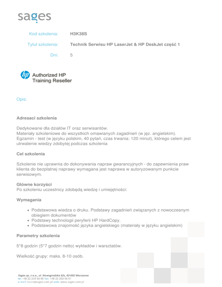 Kod szkolenia: Tytuł szkolenia: Dni: H3K38S Technik Serwisu HP LaserJet & HP DeskJet część 1 5 Opis: Adresaci szkolenia Dedykowane dla działów IT oraz serwisantów. Materiały szkoleniowe do wszystkich omawianych zagadnień (w jęz. angielskim). Egzamin - test (w języku polskim, 40 pytań, czas trwania: 120 minut), którego celem jest utrwalenie wiedzy zdobytej podczas szkolenia Cel szkolenia Szkolenie nie uprawnia do dokonywania napraw gwarancyjnych - do zapewnienia praw klienta do bezplatnej naprawy wymagana jest naprawa w autoryzowanym punkcie serwisowym. Główne korzyści Po szkoleniu uczestnicy zdobędą wiedzę i umiejętności: Wymagania Podstawowa wiedza o druku. Podstawy zagadnień związanych z nowoczesnym obiegiem dokumentów Podstawy technologii peryferii HP HardCopy. Podstawowa znajomość języka angielskiego (materiały w języku angielskim) Parametry szkolenia 5*8 godzin (5*7 godzin netto) wykładów i warsztatów. Wielkość grupy: maks. 8-10 osób. Program szkolenia: Uczestnicy otrzymają podstawową wiedzę techniczną i serwisową na temat drukarek Hewlett-Packard.Uczestnicy będą mogli instalować , konfigurować oraz naprawiać drukarki HP takie jak: HP LaserJet 5L, 6L, 5P, 6P, 2100, 2200, 2300, HP LaserJet 4050, 4100, 4200, 4300, 5100, 8150, 9000, HP Color LaserJet 4500, 4550, 4600, 5500, 8500, 8550, 9500, HP DeskJet 4xx, 5xx, 6xx, 7xx, 8xx, 9xx, 1100, 1120, 1220, 3xxx, 5xxx. Po ukończeniu szkolenia uczestnik otrzyma dyplom „Technika Serwisu HP LaserJet & DeskJet” Po ukończeniu szkolenia, uczestnik będzie posiadał obszerną wiedzę o drukarkach HP i stosowanych w nich technologiach W czasie szkolenia uczestnik będzie mógł korzystać z wieloletniego doświadczenia naszych konsultantów w dziedzinie serwisowania sprzętu hp (wiedza + oprogramowanie + dokumentacje) Omówienie architektury drukarek Hewlet Packard oraz używanej terminologii. Omówienie zagadnień związanych ze stosowaniem produktów HP w heterogenicznych środowiskach IT. Laboratorium ( ćwiczenia) zagadnienia serwisowe. Omówienie architektury oraz aplikacji używanych przy konfiguracji i serwisowaniu drukarek HP. Ćwiczenia praktyczne z drukarek HP Uwaga! Na szkoleniu będzie można zapoznać się z najnowszymi drukarkami Hewlett Packard ! Po ukończeniu szkolenia, uczestnik będzie doświadczony w procedurach serwisowania drukarek Hewlett Packard oraz w zagadnieniach wsparcia użytkownika. Po ukończeniu szkolenia uczestnik otrzyma dostęp do książek serwisowych, dokumentacji technicznej oraz filmow serwisowych (w formie elektronicznej) Na szkoleniu uczestnik będzie mógł skonsultować się i wymienić doświadczenia na temat problematycznych zagadnień związanych z serwisem sprzętu hp. Linie drukarek HP, procedury serwisowe i zagadnienia wsparcia. Prezentacja technicznych oraz serwisowych informacji o akcesoriach używanych w drukarkach HP. Powered by TCPDF (www.tcpdf.org)