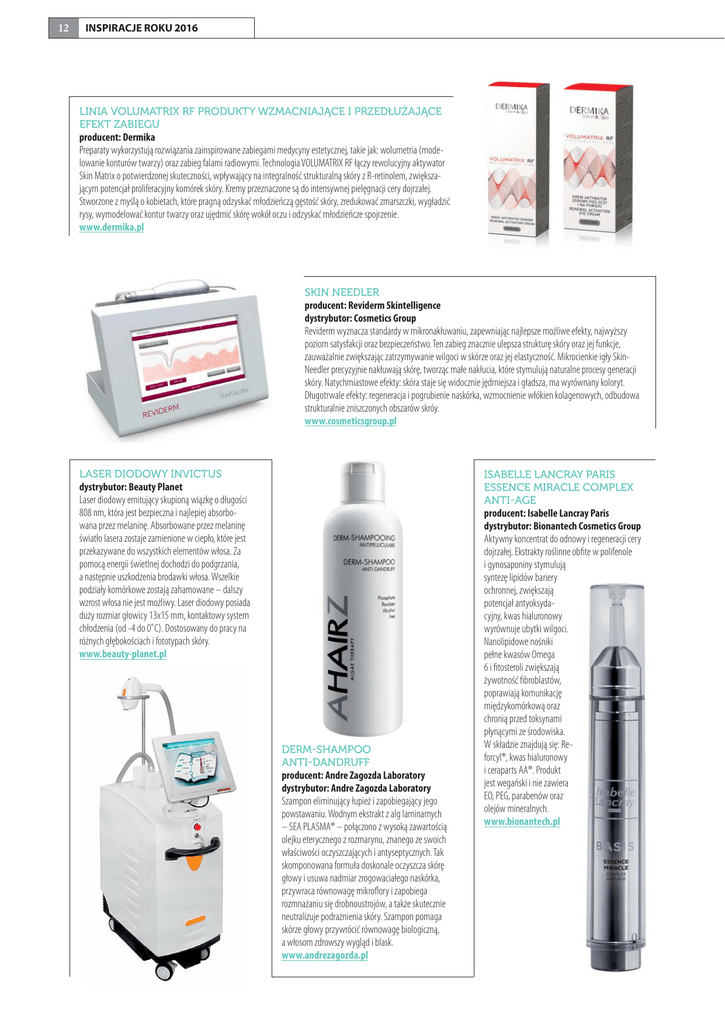 12 INSPIRACJE ROKU 2016 LINIA VOLUMATRIX RF PRODUKTY WZMACNIAJĄCE I PRZEDŁUŻAJĄCE EFEKT ZABIEGU producent: Dermika Preparaty wykorzystują rozwiązania zainspirowane zabiegami medycyny estetycznej, takie jak: wolumetria (modelowanie konturów twarzy) oraz zabieg falami radiowymi. Technologia VOLUMATRIX RF łączy rewolucyjny aktywator Skin Matrix o potwierdzonej skuteczności, wpływający na integralność strukturalną skóry z R-retinolem, zwiększającym potencjał proliferacyjny komórek skóry. Kremy przeznaczone są do intensywnej pielęgnacji cery dojrzałej. Stworzone z myślą o kobietach, które pragną odzyskać młodzieńczą gęstość skóry, zredukować zmarszczki, wygładzić rysy, wymodelować kontur twarzy oraz ujędrnić skórę wokół oczu i odzyskać młodzieńcze spojrzenie. www.dermika.pl SKIN NEEDLER producent: Reviderm Skintelligence dystrybutor: Cosmetics Group Reviderm wyznacza standardy w mikronakłuwaniu, zapewniając najlepsze możliwe efekty, najwyższy poziom satysfakcji oraz bezpieczeństwo. Ten zabieg znacznie ulepsza strukturę skóry oraz jej funkcje, zauważalnie zwiększając zatrzymywanie wilgoci w skórze oraz jej elastyczność. Mikrocienkie igły SkinNeedler precyzyjnie nakłuwają skórę, tworząc małe nakłucia, które stymulują naturalne procesy generacji skóry. Natychmiastowe efekty: skóra staje się widocznie jędrniejsza i gładsza, ma wyrównany koloryt. Długotrwale efekty: regeneracja i pogrubienie naskórka, wzmocnienie włókien kolagenowych, odbudowa strukturalnie zniszczonych obszarów skróy. www.cosmeticsgroup.pl LASER DIODOWY INVICTUS dystrybutor: Beauty Planet Laser diodowy emitujący skupioną wiązkę o długości 808 nm, która jest bezpieczna i najlepiej absorbowana przez melaninę. Absorbowane przez melaninę światło lasera zostaje zamienione w ciepło, które jest przekazywane do wszystkich elementów włosa. Za pomocą energii świetlnej dochodzi do podgrzania, a następnie uszkodzenia brodawki włosa. Wszelkie podziały komórkowe zostają zahamowane – dalszy wzrost włosa nie jest możliwy. Laser diodowy posiada duży rozmiar głowicy 13x15 mm, kontaktowy system chłodzenia (od -4 do 0˚C). Dostosowany do pracy na różnych głębokościach i fototypach skóry. www.beauty-planet.pl DERM-SHAMPOO ANTI-DANDRUFF producent: Andre Zagozda Laboratory dystrybutor: Andre Zagozda Laboratory Szampon eliminujący łupież i zapobiegający jego powstawaniu. Wodnym ekstrakt z alg laminarnych – SEA PLASMA® – połączono z wysoką zawartością olejku eterycznego z rozmarynu, znanego ze swoich właściwości oczyszczających i antyseptycznych. Tak skomponowana formuła doskonale oczyszcza skórę głowy i usuwa nadmiar zrogowaciałego naskórka, przywraca równowagę mikroflory i zapobiega rozmnażaniu się drobnoustrojów, a także skutecznie neutralizuje podrażnienia skóry. Szampon pomaga skórze głowy przywrócić równowagę biologiczną, a włosom zdrowszy wygląd i blask. www.andrezagozda.pl ISABELLE LANCRAY PARIS ESSENCE MIRACLE COMPLEX ANTI-AGE producent: Isabelle Lancray Paris dystrybutor: Bionantech Cosmetics Group Aktywny koncentrat do odnowy i regeneracji cery dojrzałej. Ekstrakty roślinne obfite w polifenole i gynosaponiny stymulują syntezę lipidów bariery ochronnej, zwiększają potencjał antyoksydacyjny, kwas hialuronowy wyrównuje ubytki wilgoci. Nanolipidowe nośniki pełne kwasów Omega 6 i fitosteroli zwiększają żywotność fibroblastów, poprawiają komunikację międzykomórkową oraz chronią przed toksynami płynącymi ze środowiska. W składzie znajdują się: Reforcyl®, kwas hialuronowy i ceraparts AA®. Produkt jest wegański i nie zawiera EO, PEG, parabenów oraz olejów mineralnych. www.bionantech.pl