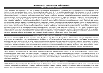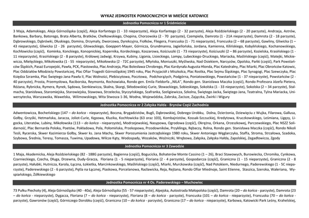 WYKAZ JEDNOSTEK POMOCNICZYCH W MIEŚCIE KATOWICE Jednostka Pomocnicza nr 1 Śródmieście 3 Maja, Adamskiego, Aleja Górnośląska (część), Aleja Korfantego (1 - 33 nieparzyste), Aleja Korfantego (2 - 32 parzyste), Aleja Roździeńskiego (2 - 20 parzyste), Andrzeja, Astrów, Bankowa, Barbary, Batorego, Brata Alberta, Bratków, Chełkowskiego, Chopina, Chorzowska (2 - 70 parzyste), Czempiela, Damrota (1 - 21A nieparzyste), Damrota (2 - 18 parzyste), Dąbrowskiego, Dąbrówki, Dłuskiego, Domina, Drzymały, Dworcowa, Dyrekcyjna, Fiołków, Fliegera, Francuska (1 - 71 nieparzyste), Francuska (2 – 68 parzyste), Gawliny, Gliwicka (1 – 43 nieparzyste), Gliwicka (2 - 26 parzyste), Głowackiego, Goeppert-Mayer, Górnicza, Grundmanna, Jagiellońska, Jordana, Kamienna, Kilińskiego, Kobylińskiego, Kochanowskiego, Kochłowicka (część), Kominka, Konckiego, Konopnickiej, Kopernika, Kordeckiego, Koszarowa, Kościuszki (1 - 73 nieparzyste), Kościuszki (2 – 86 parzyste), Kozielska, Krasińskiego (1 11 nieparzyste), Krasińskiego (2 - 8 parzyste), Królowej Jadwigi, Krzywa, Kubiny, Ligonia, Lisieckiego, Lompy, Lubeckiego-Druckiego, Mariacka, Maślińskiego (część), Matejki, Mickiewicza, Mielęckiego, Mikołowska (1 - 55 nieparzyste), Mikołowska (2 - 72C parzyste), Młyńska, Moniuszki, Myśliwska, Nad Osiekiem, Narcyzów, Opolska, Pańki (część), Park Powstańców Śląskich, Pasaż Europejski, Pawła, PCK, Piastowska, Plac Andrzeja, Plac Bolesława Chrobrego, Plac Kardynała Augusta Hlonda, Plac Katedralny, Plac Miarki, Plac Obrońców Katowic, Plac Oddziałów Młodzieży Powstańczej, Plac Ofiar Tragedii Górnośląskiej 1945 roku, Plac Przyjaciół z Miszkolca, Plac Rostka, Plac Sejmu Śląskiego, Plac Synagogi, Plac Szewczyka, Plac Księdza Szramka, Plac Świętego Jana Pawła II, Plac Wolności, Plebiscytowa, Pocztowa, Podchorążych, Podgórna, Poniatowskiego, Powstańców (1 - 37 nieparzyste), Powstańców (2 40 parzyste), Prosta, Przemysłowa, Raciborska, Reymonta, Rochowiaka, Rondo gen. Emila Fieldorfa ,,NILA'', Rondo gen. Stanisława Maczka (część), Rondo Profesora Józefa Pietera, Różana, Rybnicka, Rymera, Rynek, Sądowa, Sienkiewicza, Skalna, Skargi, Skłodowskiej-Curie, Słowackiego, Sobieskiego, Sokolska (1 - 33 nieparzyste), Sokolska (2 – 34 parzyste), Stalmacha, Stanisława, Staromiejska, Starowiejska, Stawowa, Strzelecka, Styczyńskiego, Szafranka, Szeligiewicza, Szkolna, Świętego Jacka, Świętego Jana, Teatralna, Tylna Mariacka, Uniwersytecka, Warszawska, Wawelska, Wilimowskiego, Wita Stwosza 1-36, Wodna, Wojewódzka, Zabrska, Zacisze, Zajączka, Żwirki i Wigury Jednostka Pomocnicza nr 2 Załęska Hałda - Brynów Część Zachodnia Adwentowicza, Bocheńskiego (147 – do końca - nieparzyste), Boczna, Brygadzistów, Bugli, Dąbrowskiej, Dobrego Urobku, Dolna, Dzierżonia, Dziewięciu z Wujka, Filarowa, Gallusa, Gołby, Grzyśki, Hetmańska, Jaracza, Joliot-Curie, Kępowa, Kluzika, Kochłowicka (63 oraz 103), Kombajnistów, Kossak-Szczuckiej, Kredytowa, Kruczkowskiego, Leśmiana, Ligęzy, Ligocka, Literatów, Lubiny, Mikołowska (113 – do końca - nieparzyste), Modrzejewskiej, Nasypowa, Ogrodowa (część), Okrężna, Orkana, Orzeszkowej, Parczewskiego, Plac NSZZ Solidarność, Plac Bernarda Poloka, Poetów, Pokładowa, Pola, Połomińska, Przekopowa, Przodowników, Przyklinga, Rębaczy, Rolna, Rondo gen. Stanisława Maczka (część), Rondo Nikoli Tesli, Rycerska, Skwer Kazimierza Gołby, Skwer ks. Jana Machy, Skwer Porozumienia Jastrzębskiego 1980 roku, Skwer Antoniego Węglarczyka, Staffa, Stroma, Strzałowa, Szadoka, Szybowa, Średnia, Teresy, Tomasza, Tuwima, Upadowa, Wilcze Kąty, Wodospady, Wozaków, Woźniczki, Wrębowa, Załęska, Załęska Hałda, Zapolskiej, Zegadłowicza, Zgody Jednostka Pomocnicza nr 3 Zawodzie 1 Maja, Akademicka, Aleja Roździeńskiego (82 - 188G parzyste), Bagienna (część), Bogucicka, Bohaterów Monte Cassino (1 – 26), Braci Stawowych, Burowiecka, Chromika, Cynkowa, Czarnieckiego, Czecha, Długa, Drzewna, Dudy-Gracza, Floriana (1 - 5 nieparzyste), Floriana (2 - 4 parzyste), Gospodarcza (część), Graniczna (1 - 15 nieparzyste), Graniczna (2 - 8 parzyste), Hałubki, Hutnicza, Karola, Łączna, Łokietka, Marcinkowskiego, Maślińskiego (część), Miarki, Murckowska (część), Nad Potokiem, Niedurnego, Paderewskiego (1 - 5C nieparzyste), Paderewskiego (2 - 6 parzyste), Pętla na Łącznej, Piaskowa, Porcelanowa, Racławicka, Reja, Rejtana, Rondo Ofiar Miednoje, Saint Etienne, Staszica, Szeroka, Waleriana, Wyspiańskiego, Żółkiewskiego Jednostka Pomocnicza nr 4 Os. Paderewskiego – Muchowiec 73 Pułku Piechoty (4), Aleja Górnośląska (40 - 40a), Aleja Górnośląska (55 - 57 nieparzyste), Alpejska, Autostrada Małopolska (część), Damrota (20 – do końca - parzyste), Damrota (23 – do końca - nieparzyste), Dygacza, Floriana (7 – do końca - nieparzyste), Floriana (8 – do końca - parzyste), Francuska (101 – do końca - nieparzyste), Francuska (70 – do końca parzyste), Gawronów (część), Górniczego Dorobku (część), Graniczna (10 – do końca - parzyste), Graniczna (17 – do końca - nieparzyste), Karbowa, Katowicki Park Leśny, Krahelskiej, Krasińskiego (10 – do końca - parzyste), Krasińskiego (21 – do końca - nieparzyste), Lotnisko, Murckowska (część), Ofiar Katynia, Paderewskiego (7 – do końca - nieparzyste), Paderewskiego (8 – do końca - parzyste), Pilotów, Plac Rady Europy, Plac Żołnierza Polskiego, Polna, Powstańców (41 - 43 nieparzyste), Powstańców (52), Prowansalska, Pszczyńska (część), Pułaskiego, Rodańska, Rondo Policji Województwa Śląskiego, Rondo Kazimierza Zenktelera, Równoległa, Sabaudzka, Sikorskiego, Skowrońskiego, Skwer 304 Dywizjonu Bombowego „Ziemi Śląskiej”, Skwer Richarda Holtzego, Skwer Zofii Klimondy, Sowińskiego, Szeptyckiego, Szybowcowa, Trzech Stawów, Żołnierzy Wyklętych Jednostka Pomocnicza nr 5 Brynów Część Ws