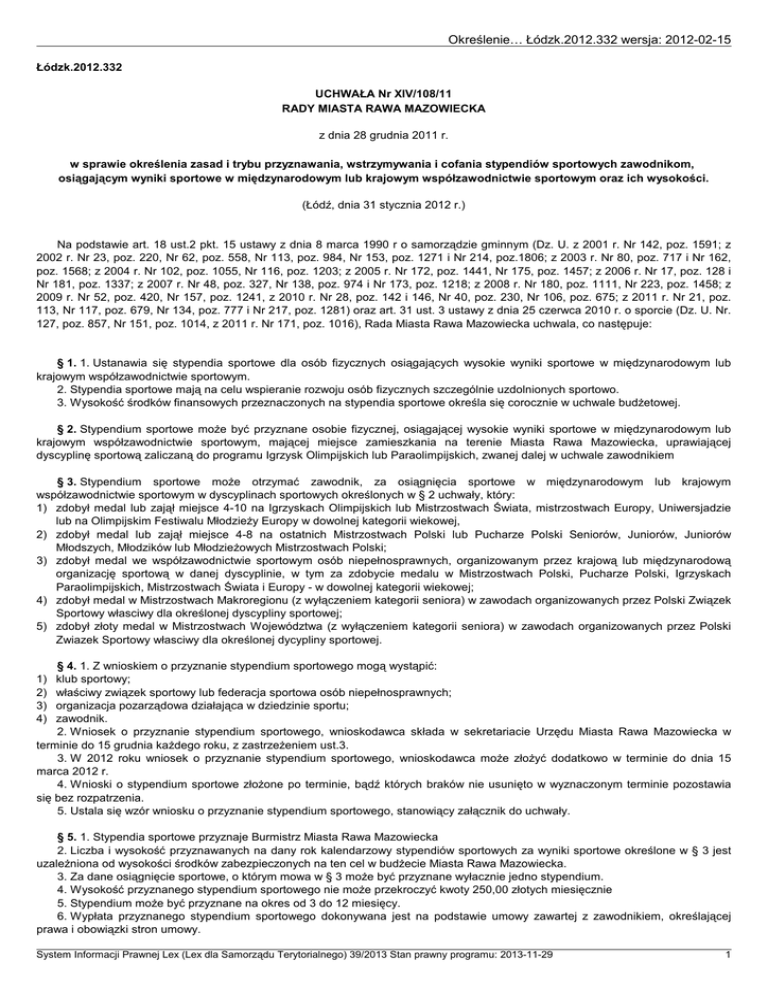 Określenie… Łódzk.2012.332 wersja: 2012-02-15 Łódzk.2012.332 UCHWAŁA Nr XIV/108/11 RADY MIASTA RAWA MAZOWIECKA z dnia 28 grudnia 2011 r. w sprawie określenia zasad i trybu przyznawania, wstrzymywania i cofania stypendiów sportowych zawodnikom, osiągającym wyniki sportowe w międzynarodowym lub krajowym współzawodnictwie sportowym oraz ich wysokości. (Łódź, dnia 31 stycznia 2012 r.) Na podstawie art. 18 ust.2 pkt. 15 ustawy z dnia 8 marca 1990 r o samorządzie gminnym (Dz. U. z 2001 r. Nr 142, poz. 1591; z 2002 r. Nr 23, poz. 220, Nr 62, poz. 558, Nr 113, poz. 984, Nr 153, poz. 1271 i Nr 214, poz.1806; z 2003 r. Nr 80, poz. 717 i Nr 162, poz. 1568; z 2004 r. Nr 102, poz. 1055, Nr 116, poz. 1203; z 2005 r. Nr 172, poz. 1441, Nr 175, poz. 1457; z 2006 r. Nr 17, poz. 128 i Nr 181, poz. 1337; z 2007 r. Nr 48, poz. 327, Nr 138, poz. 974 i Nr 173, poz. 1218; z 2008 r. Nr 180, poz. 1111, Nr 223, poz. 1458; z 2009 r. Nr 52, poz. 420, Nr 157, poz. 1241, z 2010 r. Nr 28, poz. 142 i 146, Nr 40, poz. 230, Nr 106, poz. 675; z 2011 r. Nr 21, poz. 113, Nr 117, poz. 679, Nr 134, poz. 777 i Nr 217, poz. 1281) oraz art. 31 ust. 3 ustawy z dnia 25 czerwca 2010 r. o sporcie (Dz. U. Nr. 127, poz. 857, Nr 151, poz. 1014, z 2011 r. Nr 171, poz. 1016), Rada Miasta Rawa Mazowiecka uchwala, co następuje: § 1. 1. Ustanawia się stypendia sportowe dla osób fizycznych osiągających wysokie wyniki sportowe w międzynarodowym lub krajowym współzawodnictwie sportowym. 2. Stypendia sportowe mają na celu wspieranie rozwoju osób fizycznych szczególnie uzdolnionych sportowo. 3. Wysokość środków finansowych przeznaczonych na stypendia sportowe określa się corocznie w uchwale budżetowej. § 2. Stypendium sportowe może być przyznane osobie fizycznej, osiągającej wysokie wyniki sportowe w międzynarodowym lub krajowym współzawodnictwie sportowym, mającej miejsce zamieszkania na terenie Miasta Rawa Mazowiecka, uprawiającej dyscyplinę sportową zaliczaną do programu Igrzysk Olimpijskich lub Paraolimpijskich, zwanej dalej w uchwale zawodnikiem § 3. Stypendium sportowe może otrzymać zawodnik, za osiągnięcia sportowe w międzynarodowym lub krajowym współzawodnictwie sportowym w dyscyplinach sportowych określonych w § 2 uchwały, który: 1) zdobył medal lub zajął miejsce 4-10 na Igrzyskach Olimpijskich lub Mistrzostwach Świata, mistrzostwach Europy, Uniwersjadzie lub na Olimpijskim Festiwalu Młodzieży Europy w dowolnej kategorii wiekowej, 2) zdobył medal lub zajął miejsce 4-8 na ostatnich Mistrzostwach Polski lub Pucharze Polski Seniorów, Juniorów, Juniorów Młodszych, Młodzików lub Młodzieżowych Mistrzostwach Polski; 3) zdobył medal we współzawodnictwie sportowym osób niepełnosprawnych, organizowanym przez krajową lub międzynarodową organizację sportową w danej dyscyplinie, w tym za zdobycie medalu w Mistrzostwach Polski, Pucharze Polski, Igrzyskach Paraolimpijskich, Mistrzostwach Świata i Europy - w dowolnej kategorii wiekowej; 4) zdobył medal w Mistrzostwach Makroregionu (z wyłączeniem kategorii seniora) w zawodach organizowanych przez Polski Związek Sportowy własciwy dla określonej dyscypliny sportowej; 5) zdobył złoty medal w Mistrzostwach Województwa (z wyłączeniem kategorii seniora) w zawodach organizowanych przez Polski Zwiazek Sportowy własciwy dla określonej dycypliny sportowej. § 4. 1. Z wnioskiem o przyznanie stypendium sportowego mogą wystąpić: klub sportowy; właściwy związek sportowy lub federacja sportowa osób niepełnosprawnych; organizacja pozarządowa działająca w dziedzinie sportu; zawodnik. 2. Wniosek o przyznanie stypendium sportowego, wnioskodawca składa w sekretariacie Urzędu Miasta Rawa Mazowiecka w terminie do 15 grudnia każdego roku, z zastrzeżeniem ust.3. 3. W 2012 roku wniosek o przyznanie stypendium sportowego, wnioskodawca może złożyć dodatkowo w terminie do dnia 15 marca 2012 r. 4. Wnioski o stypendium sportowe złożone po terminie, bądź których braków nie usunięto w wyznaczonym terminie pozostawia się bez rozpatrzenia. 5. Ustala się wzór wniosku o przyznanie stypendium sportowego, stanowiący załącznik do uchwały. 1) 2) 3) 4) § 5. 1. Stypendia sportowe przyznaje Burmistrz Miasta Rawa Mazowiecka 2. Liczba i wysokość przyznawanych na dany rok kalendarzowy stypendiów sportowych za wyniki sportowe określone w § 3 jest uzależniona od wysokości środków zabezpieczonych na ten cel w budżecie Miasta Rawa Mazowiecka. 3. Za dane osiągnięcie sportowe, o którym mowa w § 3 może być przyznane wyłacznie jedno stypendium. 4. Wysokość przyznanego stypendium sportowego nie może przekroczyć kwoty 250,00 złotych miesięcznie 5. Stypendium może być przyznane na okres od 3 do 12 miesięcy. 6. Wypłata przyznanego stypendium sportowego dokonywana jest na podstawie umowy zawartej z zawodnikiem, określającej prawa i obowiązki stron umowy. System Informacji Prawnej Lex (Lex dla Samorządu Terytorialnego) 39/2013 Stan prawny programu: 2013-11-29 1 Określenie… Łódzk.2012.332 wersja: 2012-02-15 § 6. 1. Burmistrz Miasta Rawa Mazowiecka wstrzymuje wypłacanie zawodnikowi stypendium sportowego w przypadku: 1) zaniedbywania przez niego realizacji programu szkolenia sportowego; 2) zawieszenia w prawach zawodnika przez organ statutowy właściwego związku sportowego, zgodnie z regulaminem tego związku lub przez macierzysty klub sportowy. 2. Wstrzymanie wypłacania stypendium sportowego następuje z początkiem miesiąca następującego po miesiącu, w którym wystąpiły okoliczności, o których mowa w ust. 1. 3. Wypłatę wstrzymanego stypendium wznawia się po ustaniu przyczyn jego wstrzymania, począwszy od miesiąca następującego po miesiącu, w którym przyczyny te ustały. 4. Za okres, w którym wstrzymano stypendium, świadczenie to nie przysługuje. § 7. 1. Burmistrz Miasta Rawa Mazowiecka pozbawia stypendium sportowego w przypadku, gdy zawodnik: 1) zaprzestaje realizac