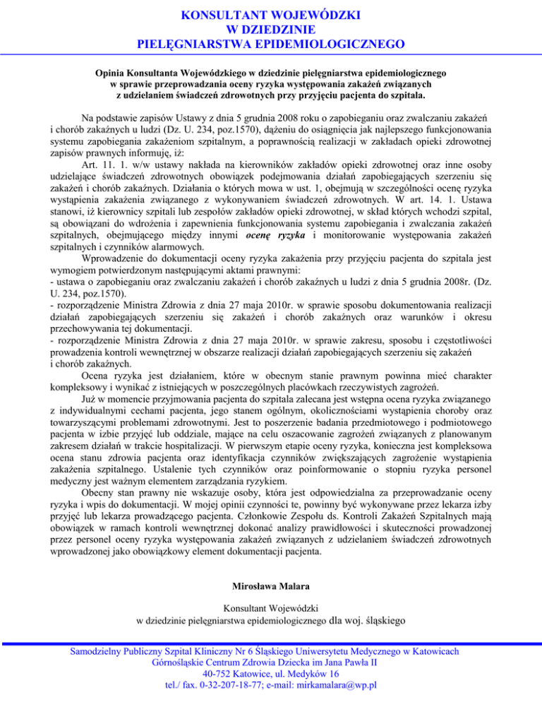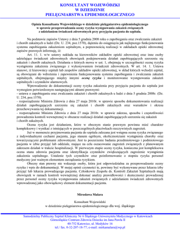KONSULTANT WOJEWÓDZKI W DZIEDZINIE PIELĘGNIARSTWA EPIDEMIOLOGICZNEGO Opinia Konsultanta Wojewódzkiego w dziedzinie pielęgniarstwa epidemiologicznego w sprawie przeprowadzania oceny ryzyka występowania zakażeń związanych z udzielaniem świadczeń zdrowotnych przy przyjęciu pacjenta do szpitala. Na podstawie zapisów Ustawy z dnia 5 grudnia 2008 roku o zapobieganiu oraz zwalczaniu zakażeń i chorób zakaźnych u ludzi (Dz. U. 234, poz.1570), dążeniu do osiągnięcia jak najlepszego funkcjonowania systemu zapobiegania zakażeniom szpitalnym, a poprawnością realizacji w zakładach opieki zdrowotnej zapisów prawnych informuję, iż: Art. 11. 1. w/w ustawy nakłada na kierowników zakładów opieki zdrowotnej oraz inne osoby udzielające świadczeń zdrowotnych obowiązek podejmowania działań zapobiegających szerzeniu się zakażeń i chorób zakaźnych. Działania o których mowa w ust. 1, obejmują w szczególności ocenę ryzyka wystąpienia zakażenia związanego z wykonywaniem świadczeń zdrowotnych. W art. 14. 1. Ustawa stanowi, iż kierownicy szpitali lub zespołów zakładów opieki zdrowotnej, w skład których wchodzi szpital, są obowiązani do wdrożenia i zapewnienia funkcjonowania systemu zapobiegania i zwalczania zakażeń szpitalnych, obejmującego między innymi ocenę ryzyka i monitorowanie występowania zakażeń szpitalnych i czynników alarmowych. Wprowadzenie do dokumentacji oceny ryzyka zakażenia przy przyjęciu pacjenta do szpitala jest wymogiem potwierdzonym następującymi aktami prawnymi: - ustawa o zapobieganiu oraz zwalczaniu zakażeń i chorób zakaźnych u ludzi z dnia 5 grudnia 2008r. (Dz. U. 234, poz.1570). - rozporządzenie Ministra Zdrowia z dnia 27 maja 2010r. w sprawie sposobu dokumentowania realizacji działań zapobiegających szerzeniu się zakażeń i chorób zakaźnych oraz warunków i okresu przechowywania tej dokumentacji. - rozporządzenie Ministra Zdrowia z dnia 27 maja 2010r. w sprawie zakresu, sposobu i częstotliwości prowadzenia kontroli wewnętrznej w obszarze realizacji działań zapobiegających szerzeniu się zakażeń i chorób zakaźnych. Ocena ryzyka jest działaniem, które w obecnym stanie prawnym powinna mieć charakter kompleksowy i wynikać z istniejących w poszczególnych placówkach rzeczywistych zagrożeń. Już w momencie przyjmowania pacjenta do szpitala zalecana jest wstępna ocena ryzyka związanego z indywidualnymi cechami pacjenta, jego stanem ogólnym, okolicznościami wystąpienia choroby oraz towarzyszącymi problemami zdrowotnymi. Jest to poszerzenie badania przedmiotowego i podmiotowego pacjenta w izbie przyjęć lub oddziale, mające na celu oszacowanie zagrożeń związanych z planowanym zakresem działań w trakcie hospitalizacji. W pierwszym etapie oceny ryzyka, konieczna jest kompleksowa ocena stanu zdrowia pacjenta oraz identyfikacja czynników zwiększających zagrożenie wystąpienia zakażenia szpitalnego. Ustalenie tych czynników oraz poinformowanie o stopniu ryzyka personel medyczny jest ważnym elementem zarządzania ryzykiem. Obecny stan prawny nie wskazuje osoby, która jest odpowiedzialna za przeprowadzanie oceny ryzyka i wpis do dokumentacji. W mojej opinii czynności te, powinny być wykonywane przez lekarza izby przyjęć lub lekarza prowadzącego pacjenta. Członkowie Zespołu ds. Kontroli Zakażeń Szpitalnych mają obowiązek w ramach kontroli wewnętrznej dokonać analizy prawidłowości i skuteczności prowadzonej przez personel oceny ryzyka występowania zakażeń związanych z udzielaniem świadczeń zdrowotnych wprowadzonej jako obowiązkowy element dokumentacji pacjenta. Mirosława Malara Konsultant Wojewódzki w dziedzinie pielęgniarstwa epidemiologicznego dla woj. śląskiego Samodzielny Publiczny Szpital Kliniczny Nr 6 Śląskiego Uniwersytetu Medycznego w Katowicach Górnośląskie Centrum Zdrowia Dziecka im Jana Pawła II 40-752 Katowice, ul. Medyków 16 tel./ fax. 0-32-207-18-77; e-mail: [email protected]