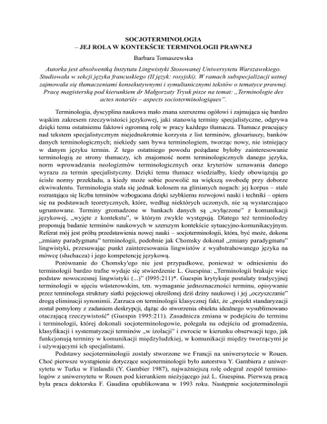 SOCJOTERMINOLOGIA – JEJ ROLA W KONTEKŚCIE TERMINOLOGII PRAWNEJ Barbara Tomaszewska Autorka jest absolwentką Instytutu Lingwistyki Stosowanej Uniwersytetu Warszawskiego. Studiowała w sekcji języka francuskiego (II język: rosyjski). W ramach subspecjalizacji ustnej zajmowała się tłumaczeniami konsekutywnymi i symultanicznymi tekstów o tematyce prawnej. Pracę magisterską pod kierunkiem dr Małgorzaty Tryuk pisze na temat: ,,Terminologie des actes notariés – aspects socioterminologiques”. Terminologia, dyscyplina naukowa mało znana szerszemu ogółowi i zajmująca się bardzo wąskim zakresem rzeczywistości językowej, jaki stanowią terminy specjalistyczne, odgrywa dzięki temu ostatniemu faktowi ogromną rolę w pracy każdego tłumacza. Tłumacz pracujący nad tekstem specjalistycznym niejednokrotnie korzysta z list terminów, glosariuszy, banków danych terminologicznych; niekiedy sam bywa terminologiem, tworząc nowy, nie istniejący w danym języku termin. Z tego ostatniego powodu pożądane byłoby zainteresowanie terminologią ze strony tłumaczy, ich znajomość norm terminologicznych danego języka, norm wprowadzania neologizmów terminologicznych oraz kryteriów uznawania danego wyrazu za termin specjalistyczny. Dzięki temu tłumacz wiedziałby, kiedy obowiązują go ścisłe normy przekładu, a kiedy może sobie pozwolić na większą swobodę przy doborze ekwiwalentu. Terminologia stała się jednak kolosem na glinianych nogach: jej korpus – stale rozrastająca się liczba terminów wzbogacana dzięki szybkiemu rozwojowi nauki i techniki – opiera się na podstawach teoretycznych, które, według niektórych uczonych, nie są wystarczająco ugruntowane. Terminy gromadzone w bankach danych są „wyłączone” z komunikacji językowej, „wyjęte z kontekstu”, w którym zwykle występują. Dlatego też terminolodzy proponują badanie terminów naukowych w szerszym kontekście sytuacyjno-komunikacyjnym. Referat mój jest próbą przedstawienia nowej nauki – socjoterminologii, która, być może, dokona „zmiany paradygmatu” terminologii, podobnie jak Chomsky dokonał „zmiany paradygmatu” lingwistyki, przesuwając punkt zainteresowania lingwistów z wyabstrahowanego języka na mówcę (słuchacza) i jego kompetencję językową. Porównanie do Chomsky'ego nie jest przypadkowe, ponieważ w odniesieniu do terminologii bardzo trafne wydaje się stwierdzenie L. Guespina: „Terminologii brakuje więc podstaw nowoczesnej lingwistyki (...)” (l995:211)*. Guespin krytykuje postulaty tradycyjnej terminologii w ujęciu wüsterowskim, tzn. wymaganie jednoznaczności terminu, opisywanie przez tenninologa struktury siatki pojęciowej określonej dziś dziny naukowej i jej „oczyszczanie” drogą eliminacji synonimii. Zarzuca on terminologii klasycznej fakt, że „projekt standaryzacji został pomylony z zadaniem deskrypcji, dążąc do stworzenia obiektu idealnego wysublimowano otaczającą rzeczywistość'' (Guespin 1995:211). Zasadnicza zmiana w podejściu do terminu i terminologii, której dokonali socjoterminologowie, polegała na odejściu od gromadzenia, klasyfikacji i systematyzacji terminów „w izolacji” i zwrocie w kierunku obserwacji tego, jak funkcjonują terminy w komunikacji międzyludzkiej, w komunikacji między tworzącymi je i używającymi ich specjalistami. Podstawy socjoterminologii zostały stworzone we Francji na uniwersytecie w Rouen. Choć pierwsze wystąpienie dotyczące socjoterminologii było autorstwa Y. Gambiera z uniwersytetu w Turku w Finlandii (Y. Gambier 1987), najważniejszą rolę odegrał zespół terminologów z uniwersytetu w Rouen pod kierunkiem nieżyjącego już L. Guespina. Pierwszą pracą była praca doktorska F. Gaudina opublikowana w 1993 roku. Następnie socjoterminologii zostały poświęcone numery trzech czasopism lingwistycznych; „Cahiers de linguistique socjale” (1991), „Le Langage et l'homme” (1993) i „Meta” (1995) „Dictionnaire ed linguistique et des sciences du langage” (Dubois i wsp. 1994) pod redakcją m. in. L. Guespina tak definiuje pojęcie socjoterminologii: „Socjoterminologia bierze pod uwagę aspekt socjolingwistyczny komunikacji naukowej i technicznej. (...) Rozważa ona termin techniczny w ujęciu, które za punkt wyjścia przyjmuje znak językowy. (...) Przedmiotem zainteresowania socjoterminologii są działania instytucjonalne, które mają na celu obserwację, rejestrację i normalizację praktyk językowych w procesach terminologicznych.” (cytat za: Boulanger, J.-C. 1995: 198; źródło niedostępne w Polsce). Zarzuty L. Guespina czynione terminologii klasycznej, która „spóźniła się na spotkania proponowane jej przez lingwistykę” (L. Guespin 1995: 211) mogą być rozumiane jako wyłączenie z zakresu zainteresowań terminologii kontekstu sytuacyjno-społecznokomunikacyjnego, w którym powstają terminy. Kontekstu tego nie uwzględniały tradycyjne definicje terminu i terminologii. A. Rey (1992: 22) podaje następującą definicję terminu: „(...) nazwa, definiowalna w obrębie spójnego systemu, będącego wyliczeniem elementów i/lub posiadającego strukturę, jest terminem; treść jej definicji powinna odpowiadać pojęciu (...), które można poddać analizie rozumowej”. Natomiast H. Felber i G. Budin (1994: 10) posuwają się jeszcze dalej, podając następującą definicję terminu: „znak pojęcia (...) składający się z jednego lub więcej znaków literowych”. Oznacza to w praktyce sprowadzenie terminu jedynie do postaci graficznej, co przywodzi na myśl poglądy lingwistyki osiemnaste- i dziewiętnastowiecznej, a także wcześniejszej, która teksty pisane czyniła podstawowym przedmiotem swoich badań. Definicja ta implikuje wyłączenie poza przedmiot terminologii całej sfery ustnej komunikacji między specjalistami. Ta ostatnia stanowi szczególny przedmiot zainteresowania F. Gaudina, który pisze (1995: 232): „Podczas pracy zesp