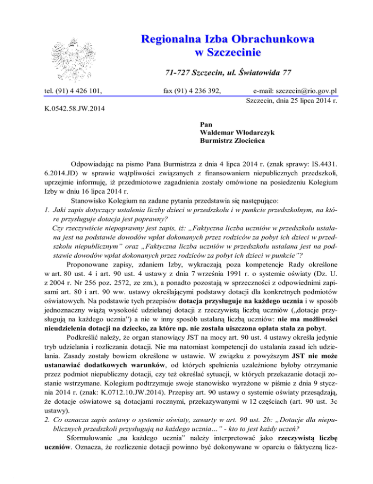 Regionalna Izba Obrachunkowa w Szczecinie 71-727 Szczecin, ul. Światowida 77 tel. (91) 4 426 101, fax (91) 4 236 392, e-mail: [email protected] Szczecin, dnia 25 lipca 2014 r. K.0542.58.JW.2014 Pan Waldemar Włodarczyk Burmistrz Złocieńca Odpowiadając na pismo Pana Burmistrza z dnia 4 lipca 2014 r. (znak sprawy: IS.4431. 6.2014.JD) w sprawie wątpliwości związanych z finansowaniem niepublicznych przedszkoli, uprzejmie informuję, iż przedmiotowe zagadnienia zostały omówione na posiedzeniu Kolegium Izby w dniu 16 lipca 2014 r. Stanowisko Kolegium na zadane pytania przedstawia się następująco: 1. Jaki zapis dotyczący ustalenia liczby dzieci w przedszkolu i w punkcie przedszkolnym, na które przysługuje dotacja jest poprawny? Czy rzeczywiście niepoprawny jest zapis, iż: „Faktyczna liczba uczniów w przedszkolu ustalana jest na podstawie dowodów wpłat dokonanych przez rodziców za pobyt ich dzieci w przedszkolu niepublicznym” oraz „Faktyczna liczba uczniów w przedszkolu ustalana jest na podstawie dowodów wpłat dokonanych przez rodziców za pobyt ich dzieci w punkcie”? Proponowane zapisy, zdaniem Izby, wykraczają poza kompetencje Rady określone w art. 80 ust. 4 i art. 90 ust. 4 ustawy z dnia 7 września 1991 r. o systemie oświaty (Dz. U. z 2004 r. Nr 256 poz. 2572, ze zm.), a ponadto pozostają w sprzeczności z odpowiednimi zapisami art. 80 i art. 90 ww. ustawy określającymi podstawy dotacji dla konkretnych podmiotów oświatowych. Na podstawie tych przepisów dotacja przysługuje na każdego ucznia i w sposób jednoznaczny wiążą wysokość udzielanej dotacji z rzeczywistą liczbą uczniów („dotacje przysługują na każdego ucznia”) a nie w inny sposób ustalaną liczbą uczniów: nie ma możliwości nieudzielenia dotacji na dziecko, za które np. nie została uiszczona opłata stała za pobyt. Podkreślić należy, że organ stanowiący JST na mocy art. 90 ust. 4 ustawy określa jedynie tryb udzielania i rozliczania dotacji. Nie ma natomiast kompetencji do ustalania zasad ich udzielania. Zasady zostały bowiem określone w ustawie. W związku z powyższym JST nie może ustanawiać dodatkowych warunków, od których spełnienia uzależnione byłoby otrzymanie przez podmiot niepubliczny dotacji, czy też określać sytuacji, w których przekazanie dotacji zostanie wstrzymane. Kolegium podtrzymuje swoje stanowisko wyrażone w piśmie z dnia 9 stycznia 2014 r. (znak: K.0712.10.JW.2014). Przepisy art. 90 ustawy o systemie oświaty przesądzają, że dotacje oświatowe są dotacjami rocznymi, przekazywanymi w 12 częściach (art. 90 ust. 3c ustawy). 2. Co oznacza zapis ustawy o systemie oświaty, zawarty w art. 90 ust. 2b: „Dotacje dla niepublicznych przedszkoli przysługują na każdego ucznia…” - kto to jest każdy uczeń? Sformułowanie „na każdego ucznia” należy interpretować jako rzeczywistą liczbę uczniów. Oznacza, że rozliczenie dotacji powinno być dokonywane w oparciu o faktyczną licz- bę uczniów w całym roku budżetowym, a nie liczbę uczniów wskazaną we wniosku o udzielenie dotacji. W trakcie roku budżetowego faktyczna liczba uczniów może ulegać zmianie i odbiegać od liczby uczniów wskazanej we wniosku o udzielenie dotacji, co oznacza, że w sytuacji gdy liczba uczniów w danym miesiącu jest wyższa od zgłoszonej, to dotacja przysługuje na wyższą, a gdy jest niższa - to na niższą liczbę uczniów i wówczas spadek ilości uczniów w trakcie roku budżetowego, wiąże się ze zmniejszeniem dotacji i koniecznością zwrotu nadmiernie pobranej dotacji (Wyrok Naczelnego Sądu Administracyjnego w Warszawie z dnia 29 lutego 2012 r.-II GSK 42/11; Wyrok WSA w Białymstoku z dnia 24.02.2010 r.-I SA/Bk 560/09). 3. Wobec faktu, że niepubliczne przedszkola i punkty przedszkolne nie muszą stosować rozporządzenia MENiS w zakresie sposobu prowadzenia dokumentacji przebiegu nauczania, jakie dokumenty w tym przedszkolu są właściwe do uznania, iż dziecko jest uczniem przedszkola? Przedszkole niepubliczne nie jest zobligowane do spełniania warunków art. 7 ust. 3 ustawy z dnia 7 września 1991 r. o systemie oświaty (Dz. U. z 2004 r. Nr 256, poz. 2572 ze zm.), zatem nie ma obowiązku prowadzenia dokumentacji przebiegu nauczania, tak jak dzieje się to w przedszkolach publicznych. O tym jaka dokumentacja jest prowadzona w danym przedszkolu niepublicznym, decyduje osoba prowadząca przedszkole. Jeśli w statucie przedszkola jest wskazana obowiązująca dokumentacja, wówczas taka obowiązuje. W tym przypadku nie ma wątpliwości, że przedszkole ma pełną swobodę w ustalaniu zasad działania, w tym dokumentowania swojej działalności. 4. Czy w statucie przedszkola niepublicznego winny być wskazane rodzaje dokumentów, na podstawie których dziecko jest uznane za ucznia tego przedszkola? Przepis art. 84 ust.2 ustawy o systemie oświaty w sposób wyczerpujący określa treść statutu. Statut przedszkola niepublicznego powinien określać: 1) nazwę przedszkola oraz jego zadania, 2) osobę prowadzącą przedszkole, 3) organy przedszkola oraz zakres ich zadań, 4) organizację przedszkola, 5) prawa i obowiązki pracowników oraz uczniów, w tym przypadki, w których uczeń może zostać skreślony z listy uczniów, 6) sposób uzyskiwania środków finansowych na działalność przedszkola, 7) zasady przyjmowania uczniów do przedszkola. Nie ma więc żadnego obowiązku do wskazywania w statucie przedszkola niepublicznego rodzaju dokumentów, na podstawie których dziecko uznane jest za ucznia tego przedszkola. 5. Czy JST podczas kontroli dotacji przedszkola niepublicznego, może kontrolować umowy cywilnoprawne zawarte z rodzicami i czy ta umowa powinna zawierać zapisy określające, od kiedy dziecko przestaje być uczniem przedszkola oraz z jakich powodów, a także zawierać zobowiązanie rodzica do zgłaszania rezygnacji z usług przedszkola? Zasady przyznawania dotacji przedszkolom niepublicznym, a także kontrol