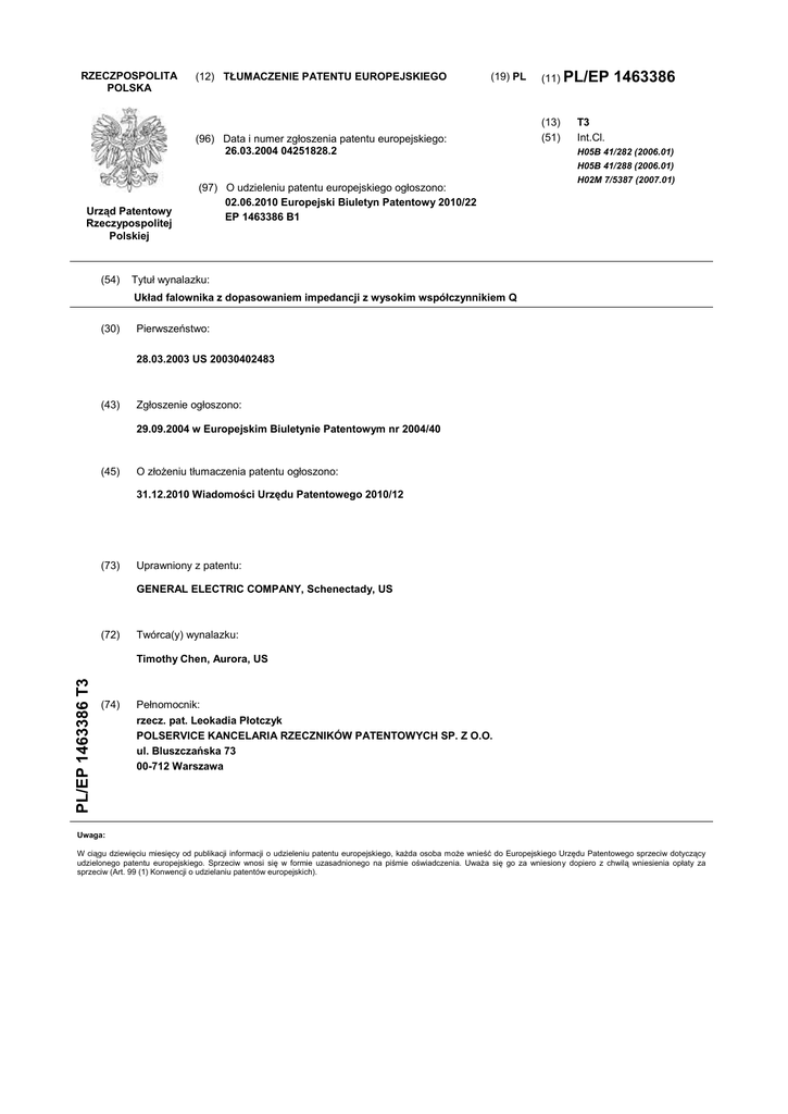 RZECZPOSPOLITA POLSKA (12) TŁUMACZENIE PATENTU EUROPEJSKIEGO (19) PL (96) Data i numer zgłoszenia patentu europejskiego: 26.03.2004 04251828.2 (11) PL/EP (13) (51) 1463386 T3 Int.Cl. H05B 41/282 (2006.01) H05B 41/288 (2006.01) Urząd Patentowy Rzeczypospolitej Polskiej (54) (97) O udzieleniu patentu europejskiego ogłoszono: 02.06.2010 Europejski Biuletyn Patentowy 2010/22 EP 1463386 B1 H02M 7/5387 (2007.01) Tytuł wynalazku: Układ falownika z dopasowaniem impedancji z wysokim współczynnikiem Q (30) Pierwszeństwo: 28.03.2003 US 20030402483 (43) Zgłoszenie ogłoszono: 29.09.2004 w Europejskim Biuletynie Patentowym nr 2004/40 (45) O złożeniu tłumaczenia patentu ogłoszono: 31.12.2010 Wiadomości Urzędu Patentowego 2010/12 (73) Uprawniony z patentu: GENERAL ELECTRIC COMPANY, Schenectady, US (72) Twórca(y) wynalazku: PL/EP 1463386 T3 Timothy Chen, Aurora, US (74) Pełnomocnik: rzecz. pat. Leokadia Płotczyk POLSERVICE KANCELARIA RZECZNIKÓW PATENTOWYCH SP. Z O.O. ul. Bluszczańska 73 00-712 Warszawa Uwaga: W ciągu dziewięciu miesięcy od publikacji informacji o udzieleniu patentu europejskiego, każda osoba może wnieść do Europejskiego Urzędu Patentowego sprzeciw dotyczący udzielonego patentu europejskiego. Sprzeciw wnosi się w formie uzasadnionego na piśmie oświadczenia. Uważa się go za wniesiony dopiero z chwilą wniesienia opłaty za sprzeciw (Art. 99 (1) Konwencji o udzielaniu patentów europejskich). 53/55P26234PL00 2 Opis [0001] Niniejsze zgłoszenie dotyczy układów falownika wykorzystywanych w zasilaniu lamp wyładowczych, zwłaszcza układu falownika z dopasowaniem impedancji z trzeciego rzędu z wysokim współczynnikiem Q z elektronicznym statecznikiem z automatyczną stabilizacją napięciową do wykorzystania z lampami wyładowczymi o dużej mocy działającymi przy niskim napięciu wejściowym. [0002] Na FIGURZE 1, przedstawiono jako znany, o szybkim starcie układ falownika drugiego rzędu wykorzystywanego do zasilania lamp wyładowczych o dużej mocy i małej impedancji. Taki układ będzie miał od 1 do 1.5 sekundy opóźnienia między przyłożeniem sygnału rozruchowego a zapaleniem lampy. Układ 10 zawiera pełnomostkową sekcję wejściową 12, która odbiera napięcie wejściowe ze źródła AC 14. Napięcie wyjściowe pełnomostkowej sekcji 12 doprowadzone jest do półmostkowej sieci 16 układu przełączającego, zawierającego pierwszy przełącznik 18 tranzystorowy, drugi przełącznik 20 tranzystorowy, i sterownik 21. Napięcie wyjściowe z półmostkowego układu przełączającego 16 podaje się do rezonansowej sieci LC 22, zawierającej cewkę rezonansową 24 i kondensator rezonansowy 26. Sygnał wyjściowy z układu LC 22 podaje się do lampy 28, która jest dodatkowo połączona z siecią 30 pojemnościowego dzielnika napięciowego, zawierającego kondensator 32 i kondensator 34. Napięcie rozruchowe w przybliżeniu około 600 woltów może być wykorzystywane jako napięcie zapłonu. W tym typie układu, ponieważ napięcie zapłonowe wynosi zwykle 600 woltów, układ podgrzewający wstępnie (nie pokazany) może znajdować się w celu wstępnego ogrzania lampy przed dostarczeniem napięcia zapłonu. [0003] Wadą układu pokazanego na FIGURZE 1 jest to, że nie jest on przeznaczony do wydajnego działania z lampami o wysokiej impedancji. Dzieje się tak, częściowo, z powodu wykorzystania niższego napięcia wejściowego Na przykład, gdy napięcie wejściowe wynosi standardowo 120 woltów, napięcie szyny zbiorczej układu może wynosić około 150-160 woltów. Napięcie AC jest w przybliżeniu dzielone, z powodu działania sieci przełączającej 18, powodującej to, że napięcie AC na wyjściu półmostkowej sieci przełączającej 18 wynosi w przybliżeniu 75 woltów. Napięcie to wystarcza do wydajnego działania lampy o niskiej impedancji. Jednak, jeżeli lampa 53/55P26234PL00 3 jest lampą o wysokiej impedancji, układ 10 będzie pobierał zwiększony prąd, powodując niewydajną pracę i obciążenia na komponentach wewnątrz układu. [0004] Inna wadą układu z FIGURY 1, jest to, że w celu otrzymania akceptowalnej wartości znamionowej współczynnika Q, podczas zastosowania go do zasilania lampy o wysokiej impedancji, trzeba dostarczyć znacznie większe napięcia do lampy. W tej sytuacji, w celu otrzymania żądanej wartości znamionowej Q, potrzebny jest większy kondensator rezonansowy 26 i większa cewka rezonansowa 24. [0005] Dodatkowo, układ 10 z szybkim zapłonem z FIGURY 1, utrzyma układ ogrzewania wstępnego aktywny nawet po zapaleniu się lampy, skutkujący stratami od około 1 do 1.5 watów mocy. [0006] Jeżeli układ 10 ma działać jako system oświetlenia o zimnym zapłonie, wtedy napięcie rozruchowe lampy będzie wynosiło około 1300 woltów. To wyższe napięcie będzie potrzebować większego prądu rezonansowego, w przybliżeniu 5 amperów. In wyższy prąd, tym większe są obciążenia na cewce 24, wymagające większego komponentu. Zwiększanie rozmiarów elementów magnetycznych (tj. cewki 24) zwiększa koszty elementów magnetycznych i zwiększa rozmiar obudowy w której umieszcza się elementy magnetyczne. Ten sam prąd przełączający również będzie oddziaływał na półmostkową sieć przełączającą 16, która zawiera tranzystory 18 i 20. W celu obsłużenia tych wyższych prądów, potrzebne będą struktury półprzewodnikowe o większych rozmiarach, a zatem wykorzystywane będą większe obudowy dla tranzystorów 18 i 20 (tranzystory mogą być tranzystorami typu FET, CMOS, bipolarne albo innego odpowiedniego typu). Te większe, bardziej solidne tranzystory i kondensatory powodują zwiększone koszty ekonomiczne, wymagają fizycznie większych systemów oświetlenia lampami, oraz skutkują zmniejszeniem wydajności układu. [0007] Zatem, jeżeli układ falownika drugiego rzędu 10 z FIGURY 2 ma być użyty do zasilania lampy o wysokiej impedancji, potrzebny będzie duży prąd ro