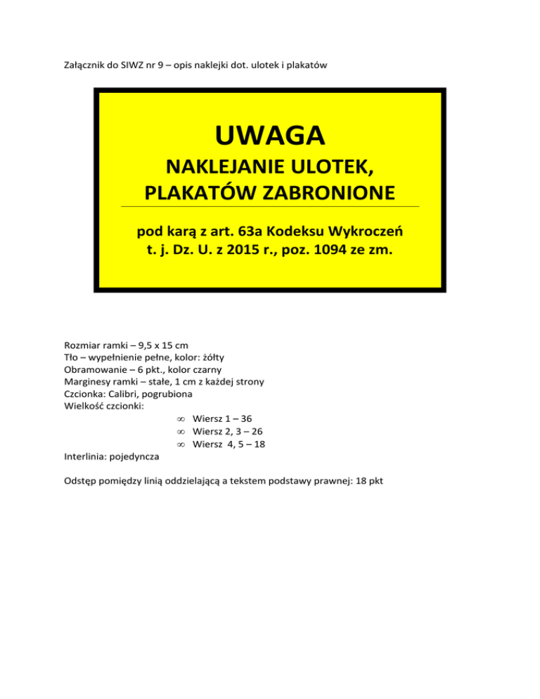 Załącznik do SIWZ nr 9 – opis naklejki dot. ulotek i plakatów UWAGA NAKLEJANIE ULOTEK, PLAKATÓW ZABRONIONE pod karą z art. 63a Kodeksu Wykroczeń t. j. Dz. U. z 2015 r., poz. 1094 ze zm. Rozmiar ramki – 9,5 x 15 cm Tło – wypełnienie pełne, kolor: żółty Obramowanie – 6 pkt., kolor czarny Marginesy ramki – stałe, 1 cm z każdej strony Czcionka: Calibri, pogrubiona Wielkość czcionki: • Wiersz 1 – 36 • Wiersz 2, 3 – 26 • Wiersz 4, 5 – 18 Interlinia: pojedyncza Odstęp pomiędzy linią oddzielającą a tekstem podstawy prawnej: 18 pkt