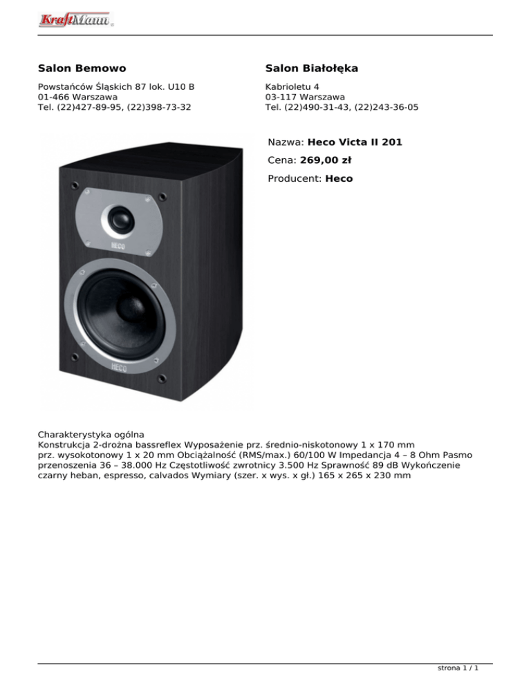 Salon Bemowo Salon Białołęka Powstańców Śląskich 87 lok. U10 B 01-466 Warszawa Tel. (22)427-89-95, (22)398-73-32 Kabrioletu 4 03-117 Warszawa Tel. (22)490-31-43, (22)243-36-05 Nazwa: Heco Victa II 201 Cena: 269,00 zł Producent: Heco Charakterystyka ogólna Konstrukcja 2-drożna bassreflex Wyposażenie prz. średnio-niskotonowy 1 x 170 mm prz. wysokotonowy 1 x 20 mm Obciążalność (RMS/max.) 60/100 W Impedancja 4 – 8 Ohm Pasmo przenoszenia 36 – 38.000 Hz Częstotliwość zwrotnicy 3.500 Hz Sprawność 89 dB Wykończenie czarny heban, espresso, calvados Wymiary (szer. x wys. x gł.) 165 x 265 x 230 mm strona 1 / 1 Powered by TCPDF (www.tcpdf.org)