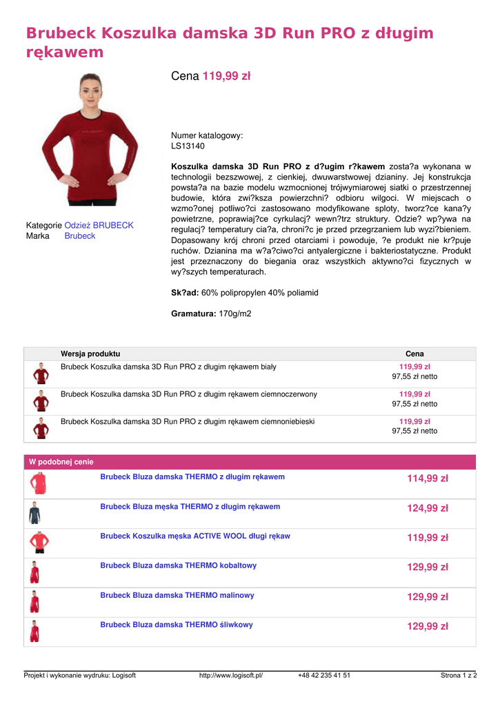 Brubeck Koszulka damska 3D Run PRO z długim rękawem Cena 119,99 zł Numer katalogowy: LS13140 Kategorie Odzież BRUBECK Marka Brubeck Koszulka damska 3D Run PRO z d?ugim r?kawem zosta?a wykonana w technologii bezszwowej, z cienkiej, dwuwarstwowej dzianiny. Jej konstrukcja powsta?a na bazie modelu wzmocnionej trójwymiarowej siatki o przestrzennej budowie, która zwi?ksza powierzchni? odbioru wilgoci. W miejscach o wzmo?onej potliwo?ci zastosowano modyfikowane sploty, tworz?ce kana?y powietrzne, poprawiaj?ce cyrkulacj? wewn?trz struktury. Odzie? wp?ywa na regulacj? temperatury cia?a, chroni?c je przed przegrzaniem lub wyzi?bieniem. Dopasowany krój chroni przed otarciami i powoduje, ?e produkt nie kr?puje ruchów. Dzianina ma w?a?ciwo?ci antyalergiczne i bakteriostatyczne. Produkt jest przeznaczony do biegania oraz wszystkich aktywno?ci fizycznych w wy?szych temperaturach. Sk?ad: 60% polipropylen 40% poliamid Gramatura: 170g/m2 Wersja produktu Cena Brubeck Koszulka damska 3D Run PRO z długim rękawem biały 119,99 zł 97,55 zł netto Brubeck Koszulka damska 3D Run PRO z długim rękawem ciemnoczerwony 119,99 zł 97,55 zł netto Brubeck Koszulka damska 3D Run PRO z długim rękawem ciemnoniebieski 119,99 zł 97,55 zł netto W podobnej cenie Brubeck Bluza damska THERMO z długim rękawem 114,99 zł Brubeck Bluza męska THERMO z długim rękawem 124,99 zł Brubeck Koszulka męska ACTIVE WOOL długi rękaw 119,99 zł Brubeck Bluza damska THERMO kobaltowy 129,99 zł Brubeck Bluza damska THERMO malinowy 129,99 zł Brubeck Bluza damska THERMO śliwkowy 129,99 zł Projekt i wykonanie wydruku: Logisoft http://www.logisoft.pl/ +48 42 235 41 51 Strona 1 z 2 Projekt i wykonanie wydruku: Logisoft Powered by TCPDF (www.tcpdf.org) http://www.logisoft.pl/ +48 42 235 41 51 Strona 2 z 2
