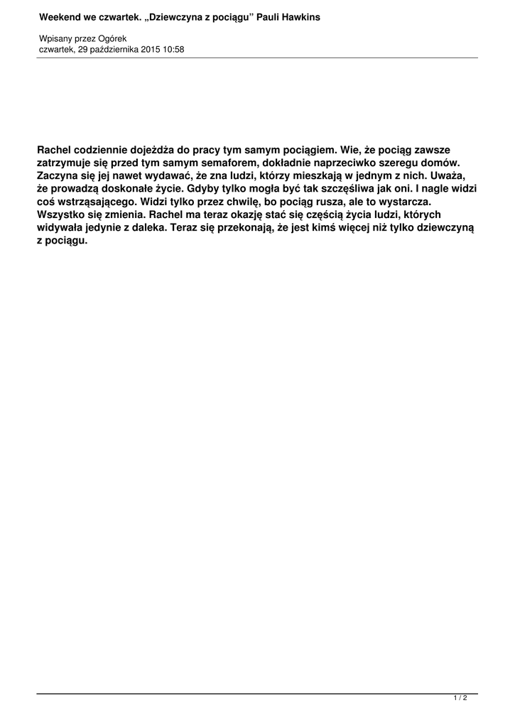 Weekend we czwartek. „Dziewczyna z pociągu” Pauli Hawkins Wpisany przez Ogórek czwartek, 29 października 2015 10:58 Rachel codziennie dojeżdża do pracy tym samym pociągiem. Wie, że pociąg zawsze zatrzymuje się przed tym samym semaforem, dokładnie naprzeciwko szeregu domów. Zaczyna się jej nawet wydawać, że zna ludzi, którzy mieszkają w jednym z nich. Uważa, że prowadzą doskonałe życie. Gdyby tylko mogła być tak szczęśliwa jak oni. I nagle widzi coś wstrząsającego. Widzi tylko przez chwilę, bo pociąg rusza, ale to wystarcza. Wszystko się zmienia. Rachel ma teraz okazję stać się częścią życia ludzi, których widywała jedynie z daleka. Teraz się przekonają, że jest kimś więcej niż tylko dziewczyną z pociągu. 1/2 Weekend we czwartek. „Dziewczyna z pociągu” Pauli Hawkins Wpisany przez Ogórek czwartek, 29 października 2015 10:58 Paula Hawkins psychologicznym. postanowiła wydania króluje na jej listach debiutanckiej zostać –powieści urodziła bestsellerów. pisarką, się powieści przez wpracy, Zimbabwe, Paula piętnaście kupiło Hawkins obecnie lat pracuje pracowała mieszka Wszędzie nad jako kolejnym w Londynie. tam, dziennikarka. gdzie thrillerem Zanim już ją Prawa wydano, do No wiesz, myślisz, kogoś znasz, a tymczasem… Odłóżcie Kinga, została nie scenarzyści wie, który w co na tym jest Hitchcocka, bok skądinąd roku prawdą, Paula przez ade Hawkins, co Cobena Palmy, rojeniami, isię czy ainnych Rachel Finchera. iwyrzucono coraz zteraz swoich pociągu” –47 bardziej głównej ulubionych nie bohaterki się mógł autorów, spać. –identycznym nie jej powstydziliby Nową powieści, wprzyjaciółką tym królową książki alkoholiczki, się thillera Stephena Nie jestem rozumiem potworem siebie. Nie rozumiem tej, którą się stałam. Toboi nie ja, ja taka nie jestem. Nie podlondyńskiego stojącemu zazdrości dalej, niedawno której sama pomieszkuje. ślicznej naprawdę przy była torach szczęśliwa miasteczka –parze! zapewnia Zże jeździła pracy domowi Jeszcze ją z„Dziewczynę do udać się Tomem, przecież numer Rachel, niedawno 15 do bo dopóki ipracy wsiadająca jego sama jej szczęśliwym, tylko… wkrajów. nie city. mieszkała za porzucił codziennie alkoholową Codziennie udaje w pięknym iprzed nie do awanturę. ożenił przygląda swą pociągu lokatorom: się zdomu osię Anną. 8.04, też jakże kawałek by zJeszcze Cathy, okna z która u Lecz opuszcza czuje sąsiadkę postanawia swojego? feralnej może Megan ogrodzie jak się ktoś zwszystkim soboty tu faktem, córeczkę? niepotrzebna zjej cię Wkrótce na domu nie przyjrzeć nią skusić albo… że numer napadł? Megan Chciała Rachel się się nie nikomu mąż, 15 efektownej na widziała, Co znika w poszła porwać? butelkę bo zdarzyło objęciach bezwartościowa, bez nie do przewróciła możesz wina, Megan śladu. Adomu się może… kogoś a wAdokładniej: potem byłego tunelu mu wówczas… obcego, się wcale dać iStephen gdy w jeszcze pod męża pijanym pewnego jest czyim torami? no ichciała? chciała kilka nią właśnie… widzie, życiem Rachel głęboko Jaki puszek dnia porwać związek rozbijając widzi ma mocno Rachel rozczarowana ginu żyć, jego swą zma utyła, skoro widziała tonikiem, sobie śpiącą piękną zniknięcie zbrzydła, nie twarz, ją ma gdy a– i „Dziewczyna przede połączonych początkowo udaje się wydaje. ustalić rozlewają zukochany pociągu” rzecz na Świat pewno: się o to kłamstwach, na nieprzewidywalna Rachel wszystkich pod wpływem fałszu bohaterów historia ina półprawdach, ginu idziecka? morderstwa, żaden znie tonikiem nie które jest jest szantażu niczym taki, straszny, jakim w i naczyniach stalkingu, bo nam niczego się ale nie głowy przychodzą najgorsze rzeczy… jeśli nie pamięta swoich występków, umysł wypełnia luki i do ten rządzą naszych najprawdziwszy, nim czynów. pożądanie, jest zdrada jeszcze i paniczny bardziej strach przerażający, przed nieodwracalnymi bo zamiast alkoholowych Lecz konsekwencjami świat bez zwidów alkoholu, Przed potasowana wami intrygująca w brawurowy układanka, sposób, rozpisana byście, jak trzy damskie King, głosy nie – przespali Rachel, nocy… Megan iiw Anny Paula Hawkins „Dziewczyna ztak pociągu” październik 2015 Świat Książki 2/2