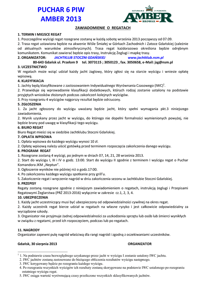 PUCHAR 6 PIW AMBER 2013 ZAWIADOMIENIE O REGATACH 1. TERMIN I MIEJSCE REGAT 1. Poszczególne wyścigi regat rozegrane zostaną w każdą sobotę września 2013 począwszy od 07.09. 2. Trasa regat ustawiona będzie na akwenie Wiśle Śmiałej w Górkach Zachodnich i Zatoce Gdańskiej (zależnie od aktualnych warunków atmosferycznych). Trasa regat każdorazowo określona będzie odrębnym komunikatem. Komunikat zawierać będzie opis trasy, Instrukcję Żeglugi i mapkę trasy. 2. ORGANIZATOR: JACHTKLUB STOCZNI GDAŃSKIEJ www.jachtklub.nsm.pl 80-643 Gdańsk ul. Przełom 9 tel. 3073115 ; 3050123 , fax. 3050658, e-Mail: [email protected] 3. UCZESTNICTWO W regatach może wziąć udział każdy jacht żaglowy, który zgłosi się na starcie wyścigu i wniesie opłatę wpisową. 4. KLASYFIKACJA 1. Jachty będą klasyfikowane z zastosowaniem Indywidualnego Wyrównania Czasowego (IWC)1. 2. Przewiduje się wprowadzenie klasyfikacji dodatkowych, których rodzaj zostanie ustalony na podstawie przyjętych wniosków złożonych podczas zakończeń kolejnych wyścigów. 3. Przy rozegraniu 4 wyścigów najgorszy rezultat będzie odrzucony. 5. ZGŁOSZENIA 1. Za jacht zgłoszony do wyścigu uważany będzie jacht, który spełni wymagania pkt.3 niniejszego zawiadomienia. 2. Wynik uzyskany przez jacht w wyścigu, do którego nie dopełni formalności wymienionych powyżej, nie będzie brany pod uwagę w klasyfikacji tego wyścigu. 6. BIURO REGAT Biuro Regat mieści się w siedzibie Jachtklubu Stoczni Gdańskiej. 7. OPŁATA WPISOWA 1. Opłata wpisowa do każdego wyścigu wynosi 10 zł. 2. Opłatę wpisową należy uiścić gotówką przed terminem rozpoczęcia zakończenia danego wyścigu. 8. PROGRAM REGAT 1. Rozegrane zostaną 4 wyścigi, po jednym w dniach 07, 14, 21, 28 września 2013. 2. Start do wyścigu I, III i IV o godz. 13:00. Start do wyścigu II zgodnie z terminem I wyścigu regat o Puchar Komandora JKM „Neptun”. 3. Ogłoszenie wyników nie później niż o godz.17:00. 4. Po zakończeniu każdego wyścigu spotkanie przy grill’u. 5. Zakończenie regat i wręczenie nagród w dniu zakończenia sezonu w Jachtklubie Stoczni Gdańskiej. 9. PRZEPISY Regaty zostaną rozegrane zgodnie z niniejszym zawiadomieniem o regatach, instrukcją żeglugi i Przepisami Regatowymi Żeglarstwa (PRŻ 2013-2016) wyłącznie w zakresie cz.1, 2, 3, 4. 10. UBEZPIECZENIA 1. Każdy jacht uczestniczący musi być ubezpieczony od odpowiedzialności cywilnej na okres regat. 2. Każdy uczestnik regat bierze udział w regatach na własne ryzyko i jest całkowicie odpowiedzialny za wyrządzone szkody. 3. Organizator nie przyjmuje żadnej odpowiedzialności za uszkodzenia sprzętu lub osób lub śmierci wynikłych w związku z regatami, przed ich rozpoczęciem, podczas lub po regatach. 11. NAGRODY Organizator zapewni pulę nagród właściwą dla rangi nagród i zgodną z oczekiwaniami uczestników. Gdańsk, 30 sierpnia 2013 1 ORGANIZATOR 1. Na podstawie czasu bezwzględnego uzyskanego przez jacht w wyścigu I zostanie ustalony IWC jachtu. 2. IWC jachtów zostaną zastosowane do bieżącego obliczenia rezultatów wyścigu następnego. 3. IWC korygowany będzie po rozegraniu każdego wyścigu. 4. Po rozegraniu wszystkich wyścigów ich rezultaty zostaną skorygowane na podstawie IWC ustalonego po rozegraniu ostatniego wyścigu regat. 5. IWC osiąga wartość wyrównującą czasy przeliczone wszystkich sklasyfikowanych jachtów.