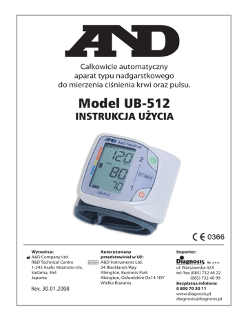 Ca³kowicie automatyczny aparat typu nadgarstkowego do mierzenia ciœnienia krwi oraz pulsu. M o d e l U B 5 1 2 I N S T R U K C J A U Ż Y C I A Wytwórca: A&D Company Ltd. R&D Technical Centre 1-243 Asahi, Kitamoto-shi, Saitama, 364 Japonia R e v . 3 0 . 0 1 . 2 0 0 8 Autoryzowany przedstawiciel w UE: A&D Instruments Ltd. 24 Blacklands Way Abington, Buisness Park Abington, Oxfordshire Ox14 1DY Wielka Brytania Importer: ul. Warszawska 42A tel./fax (085) 732 46 22 (085) 732 40 99 Bezp³atna infolinia: 0 800 70 30 11 www.diagnosis.pl [email protected] Drogi Konsumencie Dziêkujemy za zakup ciœnieniomierza A&D jednego z najbardziej zaawansowanych technologicznie produktów dostêpnych na rynku. Przed u¿yciem urz¹dzenia prosimy uwa¿nie przeczytaæ instrukcjê. Niniejszy ciœnieniomierz zosta³ wyprodukowany zgodnie z dyrektyw¹ EC 93/42/EEC (dyrektywa dotycz¹ca urz¹dzeñ medycznych). Posiada znak CE. Urz¹dzenie to jest przeznaczone do kontrolowania ciœnienia krwi oraz pulsu u osób doros³ych. Œrodki ostro¿noœci ! Do produkcji aparatu u¿yto bardzo precyzyjnych komponentów. Nale¿y unikaæ ekstremalnych temperatur, wilgoci, bezpoœredniego nas³onecznienia, uderzeñ oraz kurzu. ! Przyrz¹d nale¿y czyœciæ miêkk¹, wilgotn¹ szmatk¹. Nigdy nie nale¿y u¿ywaæ rozcieñczalnika, alkoholu, benzyny, mokrej szmaty. ! Nale¿y unikaæ przechowywania urz¹dzenia z ciasno skrêconym mankietem, gdy¿ mo¿e to uszkodziæ jego delikatne czêœci. ! Przyrz¹d oraz mankiet nie s¹ wodoodporne. Nale¿y sprzêt chroniæ przed wod¹. ! Pomiary mog¹ byæ b³êdne je¿eli sprzêt znajduje siê w bliskiej odleg³oœci od telewizora, kuchenki mikrofalowej, telefonu komórkowego lub innych przyrz¹dów, które wytwarzaj¹ silne pole elektromagnetyczne. ! U¿yte w ciœnieniomierzu komponenty oraz baterie nie s¹ zwyk³ymi odpadami i musz¹ byæ sk³adowane w odpowiednich do tego miejscach. Budowa ciœnieniomierza Pokrywa baterii Plastikowe etui Wyœwietlacz Przycisk START 1 Przycisk START 2 Mankiet Baterie alkaliczne (LR03 lub AAA) C z ę ś c i w y ś w i e t l a c z a P a m i ę ć S y s t o l i c z n e c i ś n i e n i e W s k a ź n i k c i ś n i e n i a o r a z w s k a ź n i k k l a s y f i k a c j i Ś w i a t o w e j O r g a n i z a c j i Z d r o w i a D i a s t o l i c z n e c i ś n i e n i e P u l s W s k a ź n i k n i e r e g u l a r n e g o b i c i a s e r c a W s k a ź n i k b a t e r i i W s k a ź n i k p o m i a r u Symbole Symbol Funkcja/znaczenie Zalecane postêpowanie W³¹cza i wy³¹cza urz¹dzenie LR03 AAA Oznaczenie biegunów baterii Pr¹d sta³y SN 2007 Numer seryjny Data produkcji 1 Symbole S y m b o l Funkcja/znaczenie Zalecane postêpowanie Typ BF: urz¹dzenie, mankiet i przewód powietrza zosta³y tak zaprojektowane aby zapewniæ u¿ytkownikowi maksymalne bezpieczeñstwo przy dokonywaniu pomiarów Wskazuje, ¿e urz¹dzenie jest w trakcie pomiaru. Miga w czasie wykrywania pulsu Nale¿y pozostaæ nieruchomo Wskazuje, ¿e puls jest nieregularny lub, ¿e podczas pomiaru nast¹pi³ gwa³towny ruch cia³a Poprzedni wynik pomiaru zachowany w pamiêci WskaŸnik ¿ywotnoœci baterii. Miga, gdy baterie s¹ zbyt s³abe, aby urz¹dzenie mog³o w³aœciwie funkcjonowaæ. Nale¿y wymieniæ wszystkie baterie na nowe Niestabilne ciœnienie spowodowane ruchem podczas pomiaru Skurczowe i rozkurczowe ciœnienie ró¿ni¹ siê od siebie tylko o 10 mmHg. Wartoœæ ciœnienia nie zwiêksza siê podczas pompowania Mankiet nie jest prawid³owo za³o¿ony Puls nie zosta³ prawid³owo wykryty Sprawdziæ pod³¹czenie przewodu powietrza do mankietu i aparatu. Za³o¿yæ mankiet prawid³owo i dokonaæ pomiaru jeszcze raz, pozostaj¹c nieruchomo podczas pomiaru Puls nie zosta³ prawid³owo wykryty Skurczowe ciœnienie krwi w mmHg Rozkurczowe ciœnienie krwi w mmHg Puls. Liczba uderzeñ serca na minutê Nalepka potwierdza zgodnoœæ z dyrektyw¹ Unii Europejskiej dotycz¹c¹ urz¹dzeñ medycznych Producent / Wytwórca Autoryzowany przedstawiciel w Unii Europejskiej Data ostatniej weryfikacji Zu¿yty wyrób oddaæ do punktu zbiórki odpadów. Zawiera sk³adniki niebezpieczne dla œrodowiska. Prawid³owa utylizacja urz¹dzenia umo¿liwia zachowanie cennych zasobów i unikniêcie negatywnego wp³ywu na zdrowie i œrodowisko, które mo¿e byæ zagro¿one przez nieodpowiednie postêpowanie z odpadami. Jeœli masz w¹tpliwoœci, gdzie oddaæ zu¿yty aparat skontaktuj siê z firm¹ Diagnosis - Bezp³atna infolinia 0 800 70 30 11 Dane techniczne Typ Metoda pomiaruo Zakres pomiaru UB 512 Test kliniczny zgodne z ANSI/AAMI SP-10 1992 oscylometryczna EMC IEC 60601-1-2:2001 ciœnienie: 20-280 mmHg puls: 40-180 uderzeñ/min Warunki pracy temp. + 100C ÷ 400C wilgotnoœæ: 30%-85% ciœnienie +/- 3 mmHg lub 2% Puls: +/- 5% Warunki temp. - 100C ÷ 600 przechowywania wilgotnoœæ: 30%-85% •ród³o zasilania Obwód mankietu Bateria: 2x1,5 V (LR03 lub AAA) Wymiary 63 (W) x 56 (H) x 21 (D) mm 13.5 21.5 cm Waga 82 g (wy³¹czaj¹c baterie) Klasyfikacja Typ BF Dok³adnoœæ (w zale¿noœci od tego, która wartoœæ jest wiêksza) 2 Przygotowanie do pomiaru 1. Instalowanie baterii / Wymiana baterii ! ! ! Nale¿y zdj¹æ pokrywê na baterie jak zaprezentowano na rysunku. Nale¿y za³o¿yæ dwie baterie AAA/LR03 w miejscu do tego przeznaczonym, zwracaj¹c szczególn¹ uwagê na polaryzacjê. Nale¿y zamkn¹æ pokrywê na baterie. (!) UWAGA Za³ó¿ baterie jak pokazano na rysunku, w przeciwnym razie urz¹dzenie nie zadzia³a. ! ! ! ! ! Kiedy symbol pojawi siê na wyœwietlaczu, nale¿y wymieniæ obie baterie. Nie nale¿y mieszaæ starych baterii z nowymi, takie postêpowanie mo¿e doprowadziæ do skrócenia ¿ywotnoœci baterii albo do dysfunkcji przyrz¹du. Kiedy symbol przestanie pojawiaæ siê na wyœwietlaczu. Oznacza to ¿e baterie s¹ wyczerpane. ¯ywotnoœæ baterii zmienia siê wraz z temperatur¹ otoczenia np. niskich temperaturach znacznie siê zmniejsza. Nale¿y wyj¹c baterie jeœli ciœnieniomierz nie bê