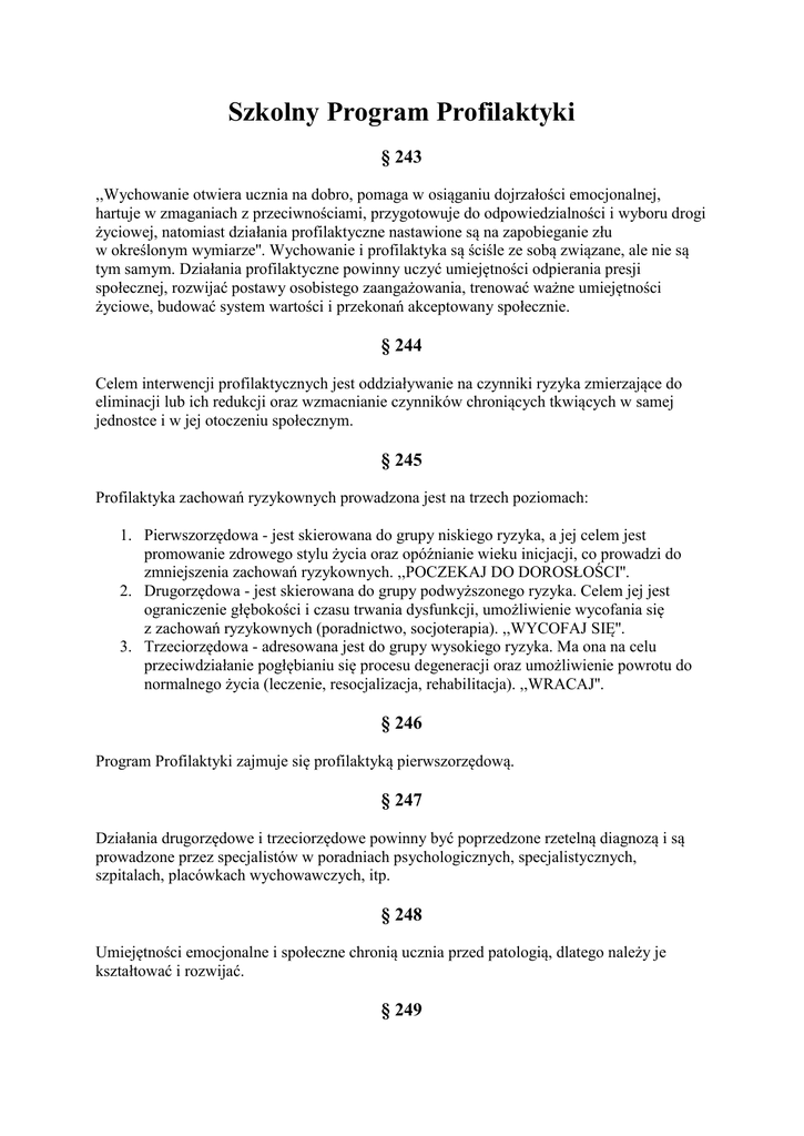 Szkolny Program Profilaktyki § 243 ,,Wychowanie otwiera ucznia na dobro, pomaga w osiąganiu dojrzałości emocjonalnej, hartuje w zmaganiach z przeciwnościami, przygotowuje do odpowiedzialności i wyboru drogi życiowej, natomiast działania profilaktyczne nastawione są na zapobieganie złu w określonym wymiarze''. Wychowanie i profilaktyka są ściśle ze sobą związane, ale nie są tym samym. Działania profilaktyczne powinny uczyć umiejętności odpierania presji społecznej, rozwijać postawy osobistego zaangażowania, trenować ważne umiejętności życiowe, budować system wartości i przekonań akceptowany społecznie. § 244 Celem interwencji profilaktycznych jest oddziaływanie na czynniki ryzyka zmierzające do eliminacji lub ich redukcji oraz wzmacnianie czynników chroniących tkwiących w samej jednostce i w jej otoczeniu społecznym. § 245 Profilaktyka zachowań ryzykownych prowadzona jest na trzech poziomach: 1. Pierwszorzędowa - jest skierowana do grupy niskiego ryzyka, a jej celem jest promowanie zdrowego stylu życia oraz opóźnianie wieku inicjacji, co prowadzi do zmniejszenia zachowań ryzykownych. ,,POCZEKAJ DO DOROSŁOŚCI''. 2. Drugorzędowa - jest skierowana do grupy podwyższonego ryzyka. Celem jej jest ograniczenie głębokości i czasu trwania dysfunkcji, umożliwienie wycofania się z zachowań ryzykownych (poradnictwo, socjoterapia). ,,WYCOFAJ SIĘ''. 3. Trzeciorzędowa - adresowana jest do grupy wysokiego ryzyka. Ma ona na celu przeciwdziałanie pogłębianiu się procesu degeneracji oraz umożliwienie powrotu do normalnego życia (leczenie, resocjalizacja, rehabilitacja). ,,WRACAJ''. § 246 Program Profilaktyki zajmuje się profilaktyką pierwszorzędową. § 247 Działania drugorzędowe i trzeciorzędowe powinny być poprzedzone rzetelną diagnozą i są prowadzone przez specjalistów w poradniach psychologicznych, specjalistycznych, szpitalach, placówkach wychowawczych, itp. § 248 Umiejętności emocjonalne i społeczne chronią ucznia przed patologią, dlatego należy je kształtować i rozwijać. § 249 Do podstawowych umiejętności psychologicznych zaliczamy: 1. 2. 3. 4. umiejętność wyznaczania celów życiowych, umiejętność podejmowania decyzji, umiejętność budowania adekwatnej samooceny, umiejętność radzenia sobie ze stresem. § 250 Do podstawowych umiejętności społecznych zaliczamy: 1. umiejętność rozpoznawania i radzenia sobie z presją mediów i rówieśników (rozumienie nacisku społecznego), 2. asertywność, 3. umiejętność rozwiązywania konfliktów, 4. umiejętność dobrego komunikowania się z innymi, 5. umiejętność tworzenia sojuszy (poszukiwania i udzielania wsparcia i pomocy). § 251 Strategie działań profilaktycznych: 1. działania informacyjne - ich celem jest dostarczenie informacji o prawidłowym rozwoju i zdrowym funkcjonowaniu oraz o czynnikach szkodliwych i ich wpływie na człowieka, umożliwiających dokonywanie racjonalnych wyborów i prezentowanie społecznie akceptowanych zachowań (wykłady, prelekcje, broszury, ulotki, plakaty, seminaria tematyczne), 2. działania edukacyjne - pomagają w rozwijaniu podstawowych umiejętności życiowych, takich jak: podejmowanie decyzji, radzenie sobie ze stresem, rozwiązywanie problemów, komunikacja interpersonalna, wzbudzanie działań umotywowanych (zajęcia warsztatowe, lekcje wychowawcze, szkolenia), 3. działania o charakterze alternatywnym - dostarczają możliwości realizowania się w pozytywnym rozwoju, w którym można doskonalić samodyscyplinę, zaufanie do siebie, świadomość siebie, poczucie własnej siły i niezależności, stwarzają możliwości, które rozszerzają zakres doświadczeń, uczą zaradności, upewniają o własnej wartości oraz pozwalają czerpać satysfakcję z własnego zaangażowania, odpowiedzialności i poczucia zaufania od innych (koła zainteresowań, kluby sportowe, działalność społeczna i charytatywna), 4. działania interwencyjne - zmierzają do pomagania jednostce w identyfikowaniu swoich problemów i poszukiwaniu możliwości ich rozwiązywania, towarzyszenie i wspieranie jej w krytycznych okresach życia, poradnictwo indywidualne i rodzinne, praca grupowa, telefon zaufania. § 252 1. W interwencji profilaktycznej należy redukować lub eliminować czynniki ryzyka i wzmacniać czynniki chroniące tkwiące w samej jednostce i w jej otoczeniu społecznym. 2. Wśród czynników ryzyka są: 1. sytuacja rodzinna, 2. sytuacja szkolna, 3. grupa rówieśnicza, 4. cechy osobowościowe, 5. zaangażowanie religijne. 3. Najważniejszymi czynnikami chroniącymi są: 1. silna więź emocjonalna z rodzicami, 2. zainteresowanie nauką szkolną, 3. regularne praktyki religijne, 4. poszanowanie prawa, norm, wartości i autorytetów społecznych, 5. przynależność do pozytywnej grupy. § 253 Cele Programu Profilaktyki: 1. zapobieganie uzależnieniom od środków psychoaktywnych (alkohol, narkotyki, środki zastępcze tzw. Dopalacze, leki wydawane bez wskazań lekarza, tytoń), 2. przeciwdziałanie agresji i przestępczości, 3. zapobieganie zakażeniu HIV, 4. zapobieganie zbyt wczesnej aktywności seksualnej, 5. zapobieganie zaburzeniom w odżywianiu, 6. przeciwdziałanie wstępowaniu do destruktywnych grup młodzieżowych, 7. przeciwdziałanie uzależnieniom od komputera ( gier komputerowych), Internetu, hazardu. Przeciwdziałanie cyberprzemocy, 8. zapobieganie konfliktom między rodzicami ucznia a szkołą; współpraca z rodzicami. § 254 1. Zapobieganie uzależnieniom od środków psychoaktywnych (alkohol, narkotyki, środki zastępcze tzw. Dopalacze, leki wydawane bez wskazań lekarza, tytoń), 1. Zadania: 1. dostarczenie rzetelnej wiedzy na temat mechanizmów uzależnienia i szkodliwości środków odurzających, 2. uświadomienie uczniom zagrożeń związanych z eksperymentami z narkotykami, zażywaniem alkoholu, paleniem tytoniu, lekomanią, 3. ćwiczenie umiejętności nieulegania naciskowi grupy, wyrażan