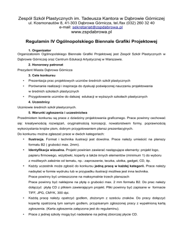 Zespół Szkół Plastycznych im. Tadeusza Kantora w Dąbrowie Górniczej ul. Kosmonautów 8, 41-303 Dąbrowa Górnicza, tel./fax (032) 260 32 40 e-mail: [email protected] www.zspdabrowa.pl Regulamin IV Ogólnopolskiego Biennale Grafiki Projektowej 1. Organizator Organizatorem Ogólnopolskiego Biennale Grafiki Projektowej jest Zespół Szkół Plastycznych w Dąbrowie Górniczej oraz Centrum Edukacji Artystycznej w Warszawie. 2. Honorowy patronat Prezydent Miasta Dąbrowa Górnicza 3. Cele konkursu • Prezentacja prac projektowych uczniów średnich szkół plastycznych • Porównanie realizacji i inspiracja do dyskusji poświęconej nauczaniu projektowania w średnich szkołach plastycznych • Przygotowanie uczniów do dalszej edukacji w wyższych szkołach plastycznych 4. Uczestnicy Uczniowie średnich szkół plastycznych. 5. Warunki zgłoszenia i uczestnictwa Przedmiotem konkursu są prace z dziedziny projektowania graficznego. Prace powinny cechować się: kreatywnością rozwiązań, oryginalnością koncepcji, nowatorstwem formy, poprawnością wykorzystania krojów pism, dobrym przygotowaniem plansz prezentacyjnych. Do konkursu można zgłaszać prace w dwóch kategoriach: • Ilustracja. Format i technika ilustracji jest dowolna. Prace należy umieścić na planszy formatu B2 ( grubości max. 2mm). • Identyfikacja wizualna. Projekt powinien zawierać następujące elementy: projekt logo, papieru firmowego, wizytówki, koperty a także innych elementów (minimum 1) do wyboru z możliwych zależnie od tematu, np.: zaproszenie, teczka, ulotka, gadget, CD, itp. • Każdy uczestnik może zgłosić do konkursu jedną pracę w każdej kategorii. Prace należy nadsyłać w formie wydruku lub w przypadku ilustracji możliwa jest inna technika. Prace powinny być umieszczone na maksymalnie trzech planszach Prace powinny być naklejone na płytę o grubości max. 2 mm formatu B2. Do prac należy dołączyć płytę CD z plikiem zawierającym projekt. Pliki powinny być zapisane w formacie TIFF, JPG, CMYK, 300 dpi. • Każdą pracę należy opatrzyć godłem, złożonym z sześciu znaków. Do pracy dołączyć kopertę opatrzoną tym samym godłem, przypisanym zgłoszonej pracy z wypełnioną kartą zgłoszenia. (Karta zgłoszenia załączona jest do regulaminu). • Prace z jednej szkoły mogą być nadesłane na jednej zbiorczej płycie CD. • Do prac wysyłanych z jednej szkoły należy dołączyć listę zbiorczą prac. 6. Terminy. Prace dostarczyć do 13 maja 2016 roku (decyduje data stempla pocztowego), na adres: Zespół Szkół Plastycznych im. Tadeusza Kantora 41-303 Dąbrowa Górnicza ul. Kosmonautów 8 • Prace nadesłane po terminie nie będą brać udziału w konkursie i zostaną odesłane na koszt nadawcy. • Ogłoszenie wyników nastąpi do 17 czerwca 2016 roku. Informacje o wynikach konkursu umieszczone będą na stronie internetowej szkoły. • Otwarcie wystawy pokonkursowej i wręczenie nagród i wyróżnień nastąpi w październiku 2016 roku. 7. Kwalifikacja prac i nagrody • Oceny prac dokona Jury powołane przez dyrektora Centrum Edukacji Artystycznej. • Jury przyzna regulaminowe nagrody: Grand Prix oraz w każdej kategorii: I Nagrodę II Nagrodę III Nagrodę Wyróżnienia • Jury zastrzega sobie prawo innego podziału nagród. • Autorzy prac zakwalifikowanych na wystawę pokonkursową otrzymają dyplomy uczestnictwa. 8. Postanowienia końcowe • Prace nagrodzone i biorące udział w wystawie pokonkursowej pozostają do dyspozycji organizatora przez dwa lata. Po tym terminie zostaną odesłane na koszt szkół uczestniczących w konkursie • Uczestnicy konkursu przysyłają prace na własny koszt, a organizatorzy nie ponoszą odpowiedzialności za uszkodzenia powstałe w czasie transportu. • Organizatorzy zastrzegają sobie prawo do bezpłatnej reprodukcji prac konkursowych w katalogu i na stronie internetowej szkoły w celu informacji i promocji konkursu. • Po zakończeniu wystawy prace zostaną odesłane na koszt szkół uczestniczących w konkursie. Należy podać decyzję o odesłaniu prac po zakończeniu konkursu • Przesłanie prac na konkurs jest jednoznaczne z wyrażeniem przez autorów zgody na warunki niniejszego regulaminu. Zespół Szkół Plastycznych im. Tadeusza Kantora w Dąbrowie Górniczej ul. Kosmonautów 8, 41-303 Dąbrowa Górnicza, tel./fax (032) 260 32 40 III Ogólnopolskie Biennale Grafiki Projektowej KARTA ZGŁOSZENIA 1 Godło 2 Tytuł pracy 3 Nazwisko i imię autora 4 Wiek autora 5 Klasa 6 Nazwa szkoły 7 Adres szkoły 8 Telefon szkoły, e-mail 9 Nazwisko i imię nauczyciela Oświadczenie Wyrażam zgodę na przetwarzanie przez organizatora konkursu moich danych osobowych w publikacjach dotyczących konkursu. Podpis autora Podpis nauczyciela Wyrażam zgodę na przetwarzanie przez organizatora konkursu danych osobowych dziecka w publikacjach dotyczących konkursu. Podpis rodzica bądź opiekuna prawnego małoletniego uczestnika konkursu Proszę o odesłanie pracy po zakończeniu konkursu na koszt nadawcy TAK / NIE Kartę należy umieścić w zaklejonej kopercie opatrzonej godłem i dołączyć wraz z płytą CD do zgłoszonej pracy