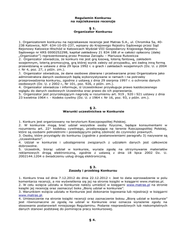 Regulamin Konkursu na najciekawsze recenzje § 1. Organizator Konkursu 1. Organizatorem konkursu na najciekawsze recenzje jest Matras S.A., ul. Chromika 5a, 40238 Katowice, NIP: 634-10-05-237, wpisany do Krajowego Rejestru Sądowego przez Sąd Rejonowy Katowice-Wschód w Katowicach Wydział VIII Gospodarczy Krajowego Rejestru Sądowego nr KRS 0000252298, kapitał zakładowy 21 834 188 zł w całości opłacony (dalej „Organizator”) reprezentowaną przez Prezesa Zarządu – Mariusza Rutowicza 2. Organizator oświadcza, że konkurs nie jest grą losową, loterią fantową, zakładem wzajemnym, loterią promocyjną, grą której wynik zależy od przypadku, ani żadną inną formą przewidzianą w ustawie z dnia 29 lipca 1992 r. o grach i zakładach wzajemnych (Dz. U. z 2004 r. Nr 4, poz. 27, z późn. zm.). 3. Organizator oświadcza, że dane osobowe zbierane i przetwarzane przez Organizatora jako administratora danych osobowych będą wykorzystywane w ramach i na potrzeby przeprowadzenia konkursu, zgodnie z ustawą z dnia 29 sierpnia 1997 r. o ochronie danych osobowych (Dz. U. z 2002 r., Nr 101, poz. 926, z późn. zm.). 4. Organizator oświadcza i informuje, iż Uczestnikowi przysługuje prawo każdoczesnego wglądu do danych osobowych Uczestnika oraz prawo do ich poprawiania. 5. Organizator jest przyrzekającym nagrodę w rozumieniu art. 919 , 920 i 921 ustawy z dnia 23 kwietnia 1964 r. - Kodeks cywilny (Dz. U. z 1964 r. Nr 16, poz. 93, z późn. zm.). § 2. Warunki uczestnictwa w Konkursie 1. Konkurs jest organizowany na terytorium Rzeczpospolitej Polskiej. 2. W konkursie mogą brać udział wszystkie osoby fizyczne, będące konsumentami w rozumieniu art. 22¹ kodeksu cywilnego, przebywające na terenie Rzeczpospolitej Polskiej, które są osobami pełnoletnimi i posiadającymi pełną zdolność do czynności prawnych. 3. Osoby, które przystąpiły do konkursu (zgodnie z postanowieniami paragrafu 3) nazywane są „Uczestnikami”. 4. Udział w konkursie i udostępnienie związanych z udziałem danych jest całkowicie dobrowolne. 5. Uczestnik, biorąc udział w konkursie, wyraża zgodę na otrzymywanie materiałów reklamowych drogą elektroniczną, zgodnie z ustawą z dnia 18 lipca 2002 Dz. U. 2002144.1204 o świadczeniu usług drogą elektroniczną. § 3. Zasady i przebieg Konkursu 1. Konkurs trwa od dnia 7.12.2012 do dnia 22.12.2012 r. Jest to data wprowadzenie w polu komentarza recenzji, a nie wyświetlenia się jej na stronie książki w księgarni www.matras.pl. 2. W celu wzięcia udziału w Konkursie należy umieścić w księgarni www.matras.pl na stronie książki jej recenzję oraz zaznaczyć boks „Biorę udział w konkursie”. 3. Warunkiem wzięcia udziału w Konkursie jest dokonanie logowania lub rejestracji w księgarni www.matras.pl. 4. Umieszczenie na stronie książki recenzji oraz zaznaczenie boksu „Biorę udział w konkursie” jest równoznaczne ze zgodą na udział w Konkursie oraz oznacza wyrażenie zgody na stosowanie postanowień niniejszego Regulaminu. Podanie nieprawdziwych lub niekompletnych danych stanowi podstawę do pominięcia pracy konkursowej. § 4. Wyłonienie zwycięzcy i nagrody 1. Prace konkursowe będą oceniane przez Komisję konkursową złożoną z przedstawicieli Organizatora. 2. Komisja konkursowa, przyznając nagrody i wybierając laureatów, weźmie pod uwagę jakość językową i merytoryczną recenzji. 3. Wyniki Konkursu zostaną ogłoszone na stronach księgarni internetowej www.matras.pl do dnia 24.12.2012 r. do godz. 24.00 4. Decyzja Komisji konkursowej jest ostateczna i nie podlega weryfikacji. 5. Wszyscy uczestnicy konkursu otrzymają kod rabatowy na jednokrotne zakupy o wartości -5% ważny do dnia 31.01.2013 r. Działanie kodów rabatowych polega na tym, że po wpisaniu podczas składania zamówienia kodu, czyli sekwencji znaków, naliczany jest rabat od kwoty wyliczonej do zapłaty; kody rabatowe przesyłane są za pomocą poczty elektronicznej i mogą być użyte jednokrotnie wyłącznie w księgarni internetowej www.matras.pl; kody rabatowe nie dotyczą pozycji dostępnych w www.matras.pl będących w promocji, wyprzedaży, przedsprzedaży oraz podręczników. 6. Nagrody w konkursie: a. zestaw książek Wydawnictwa Czarna Owca (geim, Krąg, Andaluzyjski przyjaciel, Niewierni, Przeznaczona do Gry) b. zestaw książek Wydawnictwa Czarna Owca (Niewierni, Punkt Borkmanna, Zamiast ciebie, Wyrok, Linda, Nagi ambasador, Plac dla dziewczynek, Nieszczelna sieć, 36 tydzień, Śmiertelny chłód) c. zestaw książek Wydawnictwa Replika (Niemy strach, Geniusz, Potomstwo, Kobieta, 13 ran) d. zestaw Wydawnictwa Replika (Życie jest krótkie, a pożądanie nie ma końca, Godzina dzieci, Zaułek szczęścia, Bluszcz prowincjonalny, Dwa tygodnie na miłość) e. trzy zestawy książek Wydawnictwa Znak (Miłość oraz inne dysonanse, Finale, Pewnego dnia, Krok do szczęścia, Kroniki wariata z kraju i ze świata) f. zestaw książek Wydawnictwa Amber (Hobbit. Niezwykła podróż. Kronika 1. Sztuka tworzenia filmu, Hobbit w malarstwie i grafice J. R. R. Tolkiena, Hobbit. Niezwykła podróż. Filmowe postacie i miejsca, Hobbit. Niezwykła podróż. Oficjalny przewodnik po filmie, Hobbit) g. zestaw książek Wydawnictwa Amber (Edukacja Kopciuszka, Osiemdziesiąt Dni Niebieskich, Osiemdziesiąt Dni Żółtych, Spełnione życzenie, Sen i śmierć, W obronie syna, Zaproszenie do Prowansji, Jezioro krwi i łez, Arka zabójców, Zeznanie) h. zestaw książek wydawnictw Bellona, WAB, Rebis, Nasza Księgarnia (Irena, Lilka, Amore i amaretti, Fanaberie, Dubo...Dubon...Dubonnet) i. zestaw książek wydawnictwa PWN (Paryż, Dobre maniery, Ziemiańskie święta i zabawy) j. dwa zestawy wydawnictwa Dobra Literatura (Bejrut jest gdzieś tam, Gdy nie nadejdzie jutro,Każdy zrobił co trzeba) k. dwa zestawy wydawnictwa Dobra Literatura (Pożądanie mieszka w szafie, Podróżnik stulecia,Klub filmowy) l. 3 zestawy Wydawnictwa Rebis (Dar Wilka, Sejf, Ch