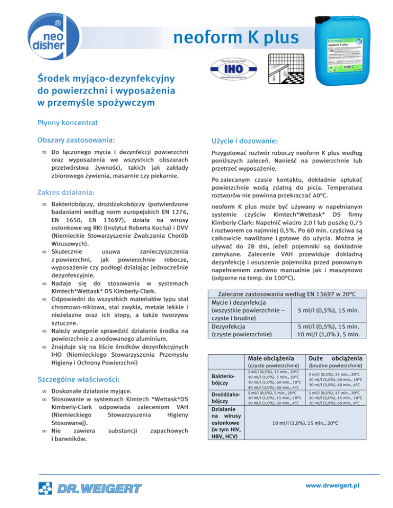 neoform K plus Środek myjąco-dezynfekcyjny do powierzchni i wyposażenia w przemyśle spożywczym Płynny koncentrat Obszary zastosowania: • Do łączonego mycia i dezynfekcji powierzchni oraz wyposażenia we wszystkich obszarach przetwórstwa żywności, takich jak zakłady zbiorowego żywienia, masarnie czy piekarnie. Zakres działania: • Bakteriobójczy, drożdżakobójczy (potwierdzone badaniami według norm europejskich EN 1276, EN 1650, EN 13697), działa na wirusy osłonkowe wg RKI (Instytut Roberta Kocha) i DVV (Niemieckie Stowarzyszenie Zwalczania Chorób Wirusowych). • Skutecznie usuwa zanieczyszczenia z powierzchni, jak powierzchnie robocze, wyposażenie czy podłogi działając jednocześnie dezynfekcyjnie. • Nadaje się do stosowania w systemach Kimtech*Wettask* DS Kimberly-Clark. • Odpowiedni do wszystkich materiałów typu stal chromowo-niklowa, stal zwykła, metale lekkie i nieżelazne oraz ich stopy, a także tworzywa sztuczne. • Należy wstępnie sprawdzić działanie środka na powierzchnie z anodowanego aluminium. • Znajduje się na liście środków dezynfekcyjnych IHO (Niemieckiego Stowarzyszenia Przemysłu Higieny i Ochrony Powierzchni) Szczególne właściwości: • Doskonałe działanie myjące. • Stosowanie w systemach Kimtech *Wettask*DS Kimberly-Clark odpowiada zaleceniom VAH (Niemieckiego Stowarzyszenia Higieny Stosowanej). • Nie zawiera substancji zapachowych i barwników. Użycie i dozowanie: Przygotować roztwór roboczy neoform K plus według poniższych zaleceń. Nanieść na powierzchnie lub przetrzeć wyposażenie. Po zalecanym czasie kontaktu, dokładnie spłukać powierzchnie wodą zdatną do picia. Temperatura roztworów nie powinna przekraczać 40°C. neoform K plus może być używany w napełnianym systemie czyściw Kimtech*Wettask* DS firmy Kimberly-Clark: Napełnić wiadro 2,0 l lub puszkę 0,75 l roztworem co najmniej 0,5%. Po 60 min. czyściwa są całkowicie nawilżone i gotowe do użycia. Można je używać do 28 dni, jeżeli pojemniki są dokładnie zamykane. Zalecenie VAH przewiduje dokładną dezynfekcję i osuszenie pojemnika przed ponownym napełnieniem zarówno manualnie jak i maszynowo (odporne na temp. do 100°C). Zalecane zastosowania według EN 13697 w 20°C Mycie i dezynfekcja (wszystkie powierzchnie – 5 ml/l (0,5%), 15 min. czyste i brudne) Dezynfekcja 5 ml/l (0,5%), 15 min. (czyste powierzchnie) 10 ml/l (1,0% ), 5 min. Bakteriobójczy Drożdżakobójczy Działanie na wirusy osłonkowe (w tym HIV, HBV, HCV) Małe obciążenia Duże (czyste powierzchnie) (brudne powierzchnie) 5 ml/l (0,5%), 15 min., 20°C 10 ml/l (1,0%), 5 min., 20°C 10 ml/l (1,0%), 60 min., 10°C 30 ml/l (3,0%), 60 min., 4°C 5 ml/l (0,5%), 5 min., 20°C 10 ml/l (1,0%), 15 min., 10°C 10 ml/l (1,0%), 60 min., 4°C obciążenia 5 ml/l (0,5%), 15 min., 20°C 20 ml/l (2,0%), 60 min., 10°C 30 ml/l (3,0%), 60 min., 4°C 5 ml/l (0,5%), 15 min., 20°C 20 ml/l (2,0%), 15 min., 10°C 20 ml/l (2,0%), 60 min., 4°C 10 ml/l (1,0%), 15 min., 20°C www.drweigert.pl neoform K plus Magazynowanie: Ważne wskazówki dotyczące użycia: • Wyłącznie do zastosowań profesjonalnych. • Zaleca się użycie rękawic ochronnych podczas ręcznej pracy z środkami dezynfekcyjnymi. • Dla ekonomicznego i bezpiecznego dozowania produktu zaleca się stosowanie akcesoriów pomocniczych, jak urządzenia mieszające czy elementy dozujące. • Aby uniknąć pozostałości na powierzchniach, konieczne jest spłukanie wodą zdatną do picia po każdym czyszczeniu i dezynfekcji. • Nie mieszać z innymi produktami. • Nie przelewać produktu do innych pojemników, butelek itp. • Środki dezynfekcyjne należy stosować w bezpieczny sposób. Przed użyciem należy zawsze zapoznać się z etykietą produktu. Raporty / opinie: Przechowywać w temperaturach od 0° do 30°C. Przy prawidłowym magazynowaniu trwałość produktu wynosi 3 lata od daty produkcji. Data ważności podana jest na etykiecie za symbolem . Rodzaje zagrożeń i środki ostrożności: Informacje dotyczące bezpieczeństwa i ochrony środowiska znajdują się w karcie charakterystyki dostępnej na stronie www.drweigert.pl Jeżeli produkt używany jest zgodnie z zaleceniami, nie stanowi zagrożenia w rozumieniu dyrektywy dot. przetwórstwa spożywczego. Zamknięte opakowania należy usuwać jako odpady tylko po całkowitym opróżnieniu. Usuwanie resztek produktu według zaleceń zamieszczonych w karcie charakterystyki. Skuteczność dezynfekcyjna została potwierdzona odpowiednimi badaniami. Kompatybilność oraz wytrzymałość systemu Kimtech *Wettask*DS Kimberly-Clark zgodnie z zaleceniami VAH, potwierdzone certyfikatem. Raporty z badań dostępne są na życzenie. Dane techniczne: Wartość pH Lepkość Gęstość ok. 9,0 (5,0 – 10,0 ml/l, w wodzie zdemineralizowanej, 20°C) <50 mPa s (koncentrat, 20°C) 1,0 g/cm3 Skład: Zawartość składników według Rozporządzenia WE 648/2004 w sprawie detergentów: 5–15% niejonowe środki powierzchniowo czynne. Zawartość substancji aktywnej w 100 g produktu: 10 g chlorku didecylodimetyloamonu, 2,0 g N-(3aminopropylo)-N-dodecylopropano-1,3-diaminy MB 3223/3-3_06.2014 PL 5.0 / 04.2016 Powyższa informacja, odpowiednia do naszej aktualnej wiedzy, opisuje produkt w zakresie bezpieczeństwa. Odstępstwa od zaleceń stosowania nie gwarantują jakości produktu i nie pociągają za sobą roszczeń prawnych. Dr. Weigert Polska Sp. z o.o. ul. Wybrzeże Gdyńskie 6A • 01-531 Warszawa tel.: +4822 616 02 23 faks:+4822 617 81 21 [email protected] www.drweigert.pl