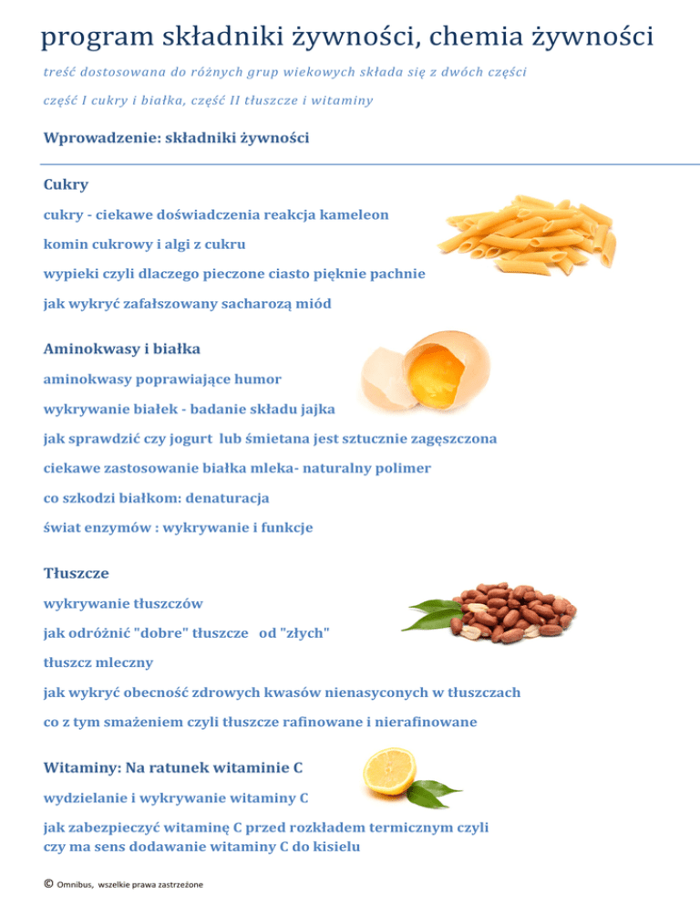 program składniki żywności, chemia żywności treść dostosowana do różnych grup wiekowych składa się z dwóch części część I cukry i białka, część II tłuszcze i witaminy Wprowadzenie: składniki żywności Cukry cukry - ciekawe doświadczenia reakcja kameleon komin cukrowy i algi z cukru wypieki czyli dlaczego pieczone ciasto pięknie pachnie jak wykryć zafałszowany sacharozą miód Aminokwasy i białka aminokwasy poprawiające humor wykrywanie białek - badanie składu jajka jak sprawdzić czy jogurt lub śmietana jest sztucznie zagęszczona ciekawe zastosowanie białka mleka- naturalny polimer co szkodzi białkom: denaturacja świat enzymów : wykrywanie i funkcje Tłuszcze wykrywanie tłuszczów jak odróżnić "dobre" tłuszcze od "złych" tłuszcz mleczny jak wykryć obecność zdrowych kwasów nienasyconych w tłuszczach co z tym smażeniem czyli tłuszcze rafinowane i nierafinowane Witaminy: Na ratunek witaminie C wydzielanie i wykrywanie witaminy C jak zabezpieczyć witaminę C przed rozkładem termicznym czyli czy ma sens dodawanie witaminy C do kisielu © Omnibus, wszelkie prawa zastrzeżone