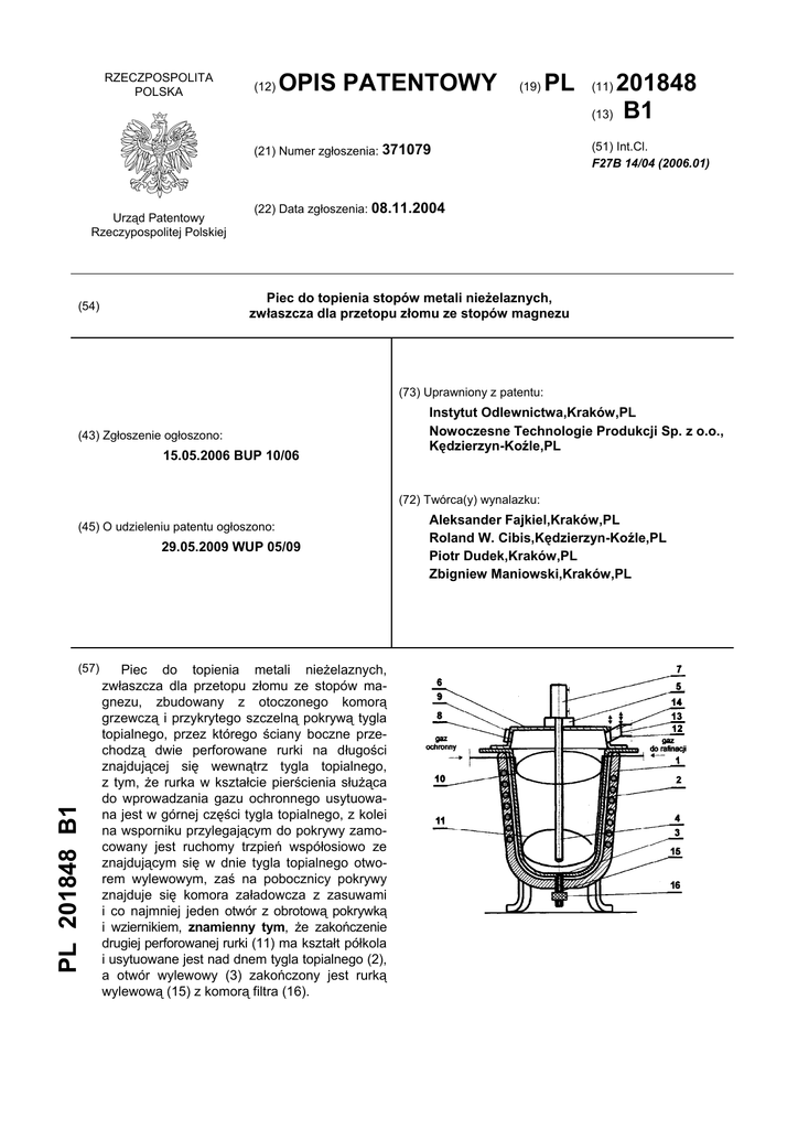 RZECZPOSPOLITA POLSKA (12) OPIS PATENTOWY (19) PL (21) Numer zgłoszenia: 371079 Urząd Patentowy Rzeczypospolitej Polskiej 201848 (13) B1 (11) (51) Int.Cl. F27B 14/04 (2006.01) (22) Data zgłoszenia: 08.11.2004 Piec do topienia stopów metali nieżelaznych, zwłaszcza dla przetopu złomu ze stopów magnezu (54) (73) Uprawniony z patentu: (43) Zgłoszenie ogłoszono: 15.05.2006 BUP 10/06 Instytut Odlewnictwa,Kraków,PL Nowoczesne Technologie Produkcji Sp. z o.o., Kędzierzyn-Koźle,PL (72) Twórca(y) wynalazku: (45) O udzieleniu patentu ogłoszono: 29.05.2009 WUP 05/09 PL 201848 B1 (57) Piec do topienia metali nieżelaznych, zwłaszcza dla przetopu złomu ze stopów magnezu, zbudowany z otoczonego komorą grzewczą i przykrytego szczelną pokrywą tygla topialnego, przez którego ściany boczne przechodzą dwie perforowane rurki na długości znajdującej się wewnątrz tygla topialnego, z tym, że rurka w kształcie pierścienia służąca do wprowadzania gazu ochronnego usytuowana jest w górnej części tygla topialnego, z kolei na wsporniku przylegającym do pokrywy zamocowany jest ruchomy trzpień współosiowo ze znajdującym się w dnie tygla topialnego otworem wylewowym, zaś na pobocznicy pokrywy znajduje się komora załadowcza z zasuwami i co najmniej jeden otwór z obrotową pokrywką i wziernikiem, znamienny tym, że zakończenie drugiej perforowanej rurki (11) ma kształt półkola i usytuowane jest nad dnem tygla topialnego (2), a otwór wylewowy (3) zakończony jest rurką wylewową (15) z komorą filtra (16). Aleksander Fajkiel,Kraków,PL Roland W. Cibis,Kędzierzyn-Koźle,PL Piotr Dudek,Kraków,PL Zbigniew Maniowski,Kraków,PL 2 PL 201 848 B1 Opis wynalazku Przedmiotem wynalazku jest piec do topienia metali nieżelaznych, zwłaszcza dla przetopu złomu ze stopów magnezu. Z czasopisma „Slevarenstvi”, nr 2-3, XLIX 2001, str. 127-132, znane są piece do przetopu złomu metali nieżelaznych, w tym stopów magnezu. Zbudowane są z systemu dwóch lub trzech pieców przechylnych otwartych z żużlową - solną atmosferą ochronną, i zaopatrzone w przenośnik taśmowy do odlewania wlewków. W tym systemie jeden z pieców służy do topienia złomu, w pozostałych piecach przeprowadza się zabiegi korekty składu chemicznego i uszlachetniania ciekłego metalu. Produkowane są też piece tyglowe stacjonarne zamknięte z gazową atmosferą ochronną, połączone rurą syfonową, która służy do rozlewania metalu do pieców podgrzewczych na stanowiskach odlewania. Z polskiego opisu patentowego nr 184 508 znany jest piec grzewczy zbudowany z trzonu, przenośnego korpusu zaopatrzonego w pierścieniowy kołnierz wzmacniający i pokrywy zamykającej. Z opisu patentowego GB 833956 znane jest urządzenie do topienia materiałów w wysokich temperaturach, które charakteryzuje się tym, że posiada ruchomy trzpień zamocowany w pokrywie pieca współosiowo ze znajdującym się w dnie pieca otworem wylewowym. Z opisu patentowego JP 7004867 znany jest indukcyjny piec próżniowy zbudowany z tygla, zamykanego pokrywą połączoną z kontrolerem gazu, który z kolei służy do odciągania lub podawania gazu ochronnego bezpośrednio przez otwór w pokrywie. Domy otwór spustowy posiada uszczelnioną zatyczkę. Piec może być podwieszany lub umieszczony na szynach. W zgłoszeniu nr P-316123 opisane jest urządzenie przeznaczone do ciągłego topienia w atmosferze ochronnej złomu metali nieżelaznych, zbudowane z komory, która połączona jest z krystalizatorem spustem usytuowanym w dolnej części komory. Komora zamknięta jest sklepieniem z szybem zasypowym. W dolnej części zsypu zainstalowana jest okrężnica gazu. W sklepieniu komory usytuowany jest rewizyjny wziernik. Piec do topienia metali nieżelaznych zwłaszcza dla przetopu złomu ze stopów magnezu według wynalazku zbudowany jest z otoczonego komorą grzewczą i przykrytego szczelną pokrywą tygla topialnego, przez którego ściany boczne przechodzą dwie perforowane rurki, z tym, że rurka służąca do doprowadzenia gazu ochronnego w kształcie pierścienia usytuowana jest w górnej części tygla topialnego. Na wsporniku przylegającym do pokrywy zamocowany jest ruchomy trzpień współosiowo ze znajdującym się w dnie tygla topialnego otworem wylewowym. Ponadto, na pobocznicy pokrywy tygla topialnego znajduje się komora załadowcza z zasuwami tworzącymi śluzę oraz co najmniej jeden otwór z obrotową przykrywką z wziernikiem, natomiast zakończenie drugiej perforowanej rurki w kształcie półkola usytuowane jest nad dnem tygla topialnego, a otwór wylewowy zakończony jest rurką wylewową z komora filtra. Zastosowanie trzpienia do otwierania i zamykania otworu wylewowego pozwala na prowadzenie procesu topienia i uszlachetniania ciekłego metalu przy zamkniętym otworze spustowym oraz opróżniania tygla topialnego przy otwartym otworze wylewowym, a przy podwieszeniu pieca na suwnicy pozwala na rozwożenie metalu i jego dozowanie do pieców podgrzewczych na stanowiskach odlewania. Wyposażenie rury wylewowej w komorę umożliwia umieszczenie w niej filtra i jego szybkiej wymiany. Natomiast zastosowanie śluz przy komorze załadowczej, oprócz odcinania atmosfery pieca od atmosfery otoczenia w czasie załadunku wsadu i wprowadzania go do tygla topialnego, pozwala na jego wstępne podgrzewanie ciepłem promieniowania i konwekcji. Dodatkowe wyposażenie pokrywy pieca w otwory z przykrywkami wraz wziernikami, poza możliwością obserwacji procesu topienia, daje także możliwość usuwania zanieczyszczeń stałych gromadzących się na lustrze metalu i służy do wprowadzania składników stopowych i modyfikatorów. Perforowana rurka w kształcie półkola służy do wprowadzania gazu rafinującego, który wypływając z niej wprowadza w ruch wirowy ciekły metal, zwiększając w ten sposób intensywność procesu rafinacji. Piec do topienia stopów metali nieżelaznych, zwłaszcza dla przetopu złomu ze stopów