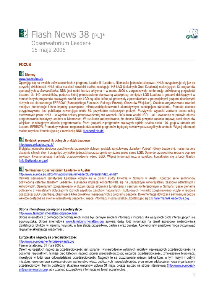 Flash News 38 [PL]* Obserwatorium Leader+ 15 maja 2006 FOCUS Niemcy www.leaderplus.de Opierając się na swoich doświadczeniach z programu Leader II i Leader+, Niemiecka jednostka sieciowa (NNU) przygotowuje się już do przyszłej działalności. NNU, która ma dość niewielki budżet, obsługuje 148 LAG (Lokalnych Grup Działania) realizujących 13 programów operacyjnych w Bundesländer. NNU jest nadal bardzo aktywna – w marcu 2006 r. zorganizowała konferencję poświęconą przyszłości Leadera dla 140 uczestników, podczas której przedstawiono planowaną współpracę pomiędzy LGD Leadera a grupami działającymi w ramach innych programów krajowych; wśród tych LGD są takie, które już pracowały z powodzeniem z potencjalnymi grupami docelowymi różnych osi planowanego EFRROW (Europejskiego Funduszu Rolnego Rozwoju Obszarów Wiejskich). Ostatnio zorganizowano również mniejsze konferencje i inne imprezy poświęcone mikroprzedsiębiorstwom i alternatywnym koncepcjom transportu. Ponadto obecnie przygotowywana jest publikacja zawierająca około 50. przykładów najlepszych praktyk. Pozytywnie wypadła zarówno ocena usług oferowanych przez NNU – w wyniku ankiety przeprowadzonej we wrześniu 2005 roku wśród LGD – jak i ewaluacja w połowie okresu programowania inicjatywy Leader+ w Niemczech. W rezultacie zadecydowano, że obecna NNU przejmie zadania krajowej sieci obszarów wiejskich w następnym okresie programowania. Poza grupami z programów krajowych będzie działać około 170. grup w ramach osi Leadera EFRROW. Procedury wyboru i rozpoczęcia działalności programów będą się różnić w poszczególnych landach. Więcej informacji można uzyskać, kontaktując się z niemiecką NNU ([email protected]). Brytyjski przewodnik dobrych praktyk Leadera+ http://www.ukleader.org.uk/ Brytyjska jednostka sieciowa opublikowała przewodnik dobrych praktyk zatytułowany „Leader+ Voices” (Głosy Leadera+), mając na celu ukazanie silnych stron i osiągnięć brytyjskiej jednostki poprzez opinie wyrażane przez same LGD. Dane do przewodnika zebrano poprzez wywiady, kwestionariusze i ankiety przeprowadzone wśród LGD. Więcej informacji można uzyskać, kontaktując się z Lucy Gaskin ([email protected]) Seminarium Obserwatorium Leadera+ w Austrii http://www.europa.eu.int/comm/agriculture/rur/leaderplus/events/index_en.htm Czwarte seminarium tematyczne Leadera+ odbyło się w dniach 25-29 kwietnia w Schruns w Austrii. Kończąc serię seminariów poświęconą czterem tematom Leadera+, austriacka impreza koncentrowała się na „najlepszym wykorzystaniu zasobów naturalnych i kulturowych”. Seminarium zorganizowano w dużym biurze informacji turystycznej i centrum konferencyjnym w Schruns. Sesje plenarne połączono z warsztatami dotyczącymi różnych aspektów zasobów naturalnych i kulturowych. Ponadto zorganizowano wizytę w regionie goszczącej LGD Vorarlberg, obejmującą kilka projektów finansowanych z programu Leader+. Dokumentacja dotycząca seminarium będzie wkrótce dostępna na stronie internetowej Leadera+. Więcej informacji można uzyskać, kontaktując się z [email protected]. Strona internetowa poświęcona agroturystyce http://www.farmtourism-matters.org/index.htm Strona internetowa z północno-zachodniej Anglii może być cennym źródłem informacji i inspiracji dla wszystkich osób interesujących się agroturystyką. Strona internetowa www.farmtourism-matters.org zawiera dużą ilość informacji na temat sposobów zróżnicowania działalności rolników w kierunku turystyki, w tym studia przypadków, badania oraz biuletyn. Abonenci listy emailowej mogą otrzymywać regularnie aktualizacje wiadomości. Europejskie nagrody za przedsiębiorczość http://www.european-enterprise-awards.org Termin ostateczny: 31 maja 2006 r. Celem europejskich nagród za przedsiębiorczość jest uznanie i wynagrodzenie wybitnych inicjatyw wspierających przedsiębiorczość na poziomie regionalnym. Istnieje pięć kategorii nagród: pionier przedsiębiorczości; wsparcie przedsiębiorczości, zmniejszenie biurokracji, inwestycje w ludzi oraz odpowiedzialna przedsiębiorczość. Nagrody te są przyznawane różnym jednostkom, w tym małym i dużym miastom, regionom oraz społecznościom, partnerstwu władz publicznych i przedsiębiorców, programom edukacyjnym oraz organizacjom przedsiębiorców. Termin ostateczny składania wniosków upływa 31 maja; proszę zajrzeć na stronę internetową (http://www.europeanenterprise-awards.org), aby uzyskać szczegółowe informacje na temat uczestnictwa. 1 Raport o oddziaływaniu brytyjskiego programu Leader+ na środowisko http://www.lupg.org.uk/projects/detail.asp?id=31 Instytut Europejskiej Polityki Środowiska (IEEP) oraz Uniwersytet Gloucestershire zakończyły niedawno raport badający oddziaływanie Leadera+ na środowisko w Wielkiej Brytanii. Prace te wykonano dla Grupy ds. Polityki Użytkowania Gruntów działającej przy brytyjskich państwowych agencjach ochrony środowiska. Wnioski raportu, które mogą być istotne dla innych państw członkowskich UE pokazują, że bezpośrednie oddziaływanie Leadera+ jest często ograniczone ze względu na małą skalę projektów. Jednakże w swym podejściu do obszarów wiejskich Leader ma wiele do zaoferowania, łącząc działania poszczególnych osób, organizacji oraz społeczności dla osiągnięcia celów środowiskowych. Raport przedstawia również wnioski na temat sposobu wykorzystania Leadera dla osiągnięcia celów środowiskowych. Będzie to szczególnie ważne w nowym okresie programowania, gdy podejście Leader stanie się czwartą osią EFRROW. Więcej informacji można uzyskać, kontaktując się z Martinem Farmerem ([email protected]) z IEEP. Rozszerzenie +2: jaka będzie przyszłość gospodarki wiejskiej w nowej Europie? http://www.elo.org/index.php?page=pages/conferences/princeoverview.php 23-24 maja 2006 r. Bruksela, Belgia Zwieńczeniem serii 