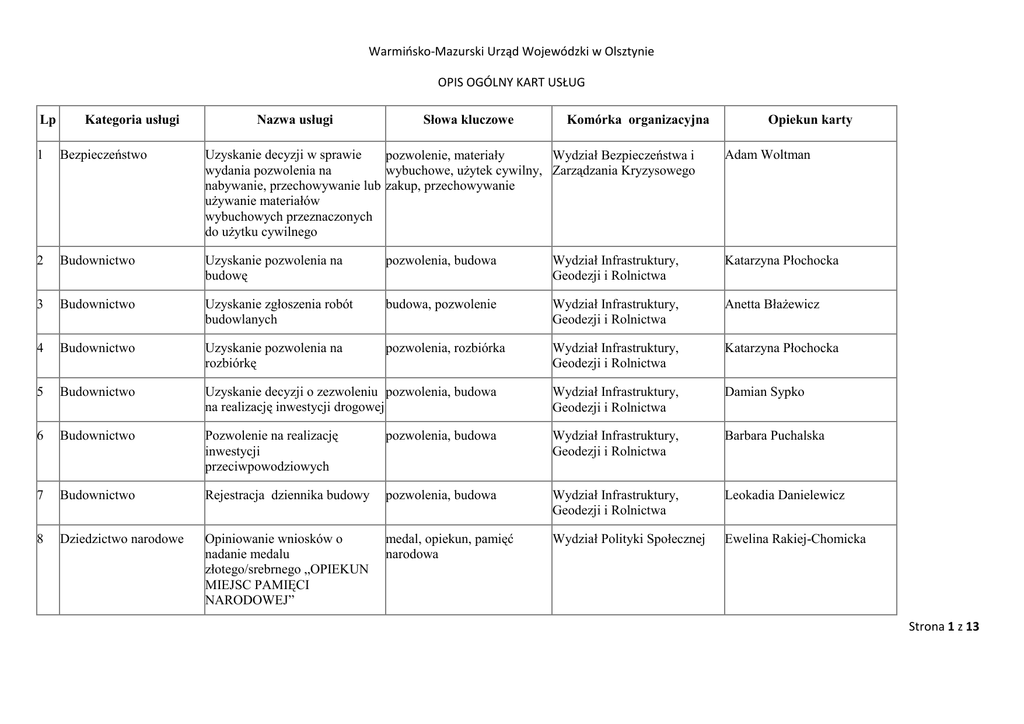 Warmińsko-Mazurski Urząd Wojewódzki w Olsztynie OPIS OGÓLNY KART USŁUG Lp Kategoria usługi Nazwa usługi Słowa kluczowe Komórka organizacyjna Opiekun karty 1 Bezpieczeństwo Uzyskanie decyzji w sprawie pozwolenie, materiały Wydział Bezpieczeństwa i wydania pozwolenia na wybuchowe, uŜytek cywilny, Zarządzania Kryzysowego nabywanie, przechowywanie lub zakup, przechowywanie uŜywanie materiałów wybuchowych przeznaczonych do uŜytku cywilnego Adam Woltman 2 Budownictwo Uzyskanie pozwolenia na budowę pozwolenia, budowa Wydział Infrastruktury, Geodezji i Rolnictwa Katarzyna Płochocka 3 Budownictwo Uzyskanie zgłoszenia robót budowlanych budowa, pozwolenie Wydział Infrastruktury, Geodezji i Rolnictwa Anetta BłaŜewicz 4 Budownictwo Uzyskanie pozwolenia na rozbiórkę pozwolenia, rozbiórka Wydział Infrastruktury, Geodezji i Rolnictwa Katarzyna Płochocka 5 Budownictwo Uzyskanie decyzji o zezwoleniu pozwolenia, budowa na realizację inwestycji drogowej Wydział Infrastruktury, Geodezji i Rolnictwa Damian Sypko 6 Budownictwo Pozwolenie na realizację inwestycji przeciwpowodziowych pozwolenia, budowa Wydział Infrastruktury, Geodezji i Rolnictwa Barbara Puchalska 7 Budownictwo Rejestracja dziennika budowy pozwolenia, budowa Wydział Infrastruktury, Geodezji i Rolnictwa Leokadia Danielewicz 8 Dziedzictwo narodowe Opiniowanie wniosków o nadanie medalu złotego/srebrnego „OPIEKUN MIEJSC PAMIĘCI NARODOWEJ” medal, opiekun, pamięć narodowa Wydział Polityki Społecznej Ewelina Rakiej-Chomicka Strona 1 z 13 Warmińsko-Mazurski Urząd Wojewódzki w Olsztynie OPIS OGÓLNY KART USŁUG 9 Dziedzictwo narodowe Uzyskanie opinii w sprawie upamiętnienia miejsca pamięci narodowej. upamiętnienie, pamięć narodowa, opinia, komitet, pomnik Wydział Polityki Społecznej Ewelina Rakiej-Chomicka 10 Dziedzictwo narodowe Wydawanie zezwolenia na ekshumację szczątków z grobu wojennego Wydział Polityki Społecznej Zezwolenie, grób wojenny, ekshumacja, Ŝołnierz, poległy Ewelina Rakiej-Chomicka 11 Geodezja Rozpatrywanie wniosków w sprawie zbadania zasadności odmowy włączenia dokumentacji do Powiatowego/Wojewódzkiego Zasobu Geodezyjnego i Kartograficznego Dokumentacja geodezyjna, geodezja, państwowy zasób geodezyjny i kartograficzny. Wydział Infrastruktury, Geodezji i Rolnictwa Monika Barcikowska 12 Geodezja Stwierdzenie niewaŜności decyzji, postanowienia w przedmiocie- ewidencji gruntów i budynków, klasyfikacji gruntów. Wydział Infrastruktury, Ewidencja gruntów i budynków, geodezja, Geodezji i Rolnictwa klasyfikacja gruntów, decyzja, postanowienie Monika Barcikowska 13 Geodezja Wznowienie postępowania Ewidencja gruntów i administracyjnego w budynków, geodezja, przedmiocie- ewidencji gruntów klasyfikacja gruntów. i budynków, klasyfikacji gruntów. Wydział Infrastruktury, Geodezji i Rolnictwa Monika Barcikowska 14 Geodezja Rozpatrywanie odwołań od decyzji Starosty (Prezydenta Miasta) wydanej w I instancji w sprawach z zakresu- geodezji i kartografii, ewidencji gruntów i Wydział Infrastruktury, Geodezji i Rolnictwa Monika Barcikowska Ewidencja gruntów i budynków, geodezja, klasyfikacja gruntów, odwołanie. Strona 2 z 13 Warmińsko-Mazurski Urząd Wojewódzki w Olsztynie OPIS OGÓLNY KART USŁUG budynków, klasyfikacji gruntów. 15 Gospodarka przestrzenna Uzyskanie decyzji o ustaleniu lokalizacji inwestycji celu publicznego na terenie zamkniętym. Cel publiczny, lokalizacja, Wydział Infrastruktury, inwestycja , teren zamknięty. Geodezji i Rolnictwa Krzysztof Klimek 16 Gospodarka przestrzenna Uzyskanie decyzji o warunkach Zabudowa, warunki teren zabudowy na terenie zamknięty. zamkniętym. Wydział Infrastruktury, Geodezji i Rolnictwa Krzysztof Klimek 17 Gospodarka przestrzenna Uzyskanie decyzji o ustaleniu lokalizacji linii kolejowej. Cel publiczny, lokalizacja, transport kolejowy , linia kolejowa . Wydział Infrastruktury, Geodezji i Rolnictwa Krzysztof Klimek 18 Gospodarka przestrzenna Uzyskanie decyzji o ustaleniu lokalizacji regionalnej sieci szerokopasmowej. Cel publiczny, lokalizacja ,internet,, sieć szerokopasmowa. Wydział Infrastruktury, Geodezji i Rolnictwa Krzysztof Klimek Biuro Wojewody Edyta Wrotek 19 Informacja publiczna Udostępnianie informacji informacja publiczna, publicznej na pisemny wniosek ujawnienie, udostępnienie 20 Inne Wydanie kopii dokumentów osobowo-płacowych z zasobu archiwum zakładowego. likwidacja, przedsiębiorstwo, Wydział Organizacji i Kadr, wojewoda, zaświadczenie Archiwum Zakładowe 21 Inne Wstrzymanie egzekucji administracyjnej dotyczącej czynności kaŜdego organu prowadzącego egzekucję administracyjną Egzekucja, wstrzymanie egzekucji Wydział Finansów i Kontroli Marta Tumińska Katarzyna Szeligowska Strona 3 z 13 Warmińsko-Mazurski Urząd Wojewódzki w Olsztynie OPIS OGÓLNY KART USŁUG 22 Kary Uzyskanie umorzenia w całości Kara, Prawo budowlane, nadzór budowlany, ulgi albo w części, odroczenia lub rozłoŜenia na raty naleŜności z tytułu kar nałoŜonych na podstawie ustawy Prawo budowlane Wydział Finansów i Kontroli Katarzyna Szeligowska 23 Kary Uzyskanie umorzenia w całości Kara, kłusownictwo, ulgi albo w części, odroczenia lub rozłoŜenia na raty naleŜności z tytułu kar za nielegalnie pozyskana zwierzynę Wydział Finansów i Kontroli Katarzyna Szeligowska 24 Komunikacja Uzyskanie wpisu do ewidencji instruktorów techniki jazdy ewidencja, instruktor, prawo jazdy Wydział Infrastruktury, Geodezji i Rolnictwa Nestor Zubalski 25 Komunikacja Uzyskanie wpisu do rejestru rejestr ośrodków szkoleń, ośrodków szkolenia kierowców technika jazdy, prawo jazdy wykonujących przewóz drogowy Wydział Infrastruktury, Geodezji i Rolnictwa Nestor Zubalski 26 Komunikacja Wpis do rejestru ośrodków doskonalenia techniki jazdy ośrodki doskonalenia techniki Wydział Infrastruktury, jazdy, rejestr ośrodków Geodezji i Rolnictwa doskonalenie techniki jazdy, prawo jazdy Nestor Zubalski 27 Mandaty Uz