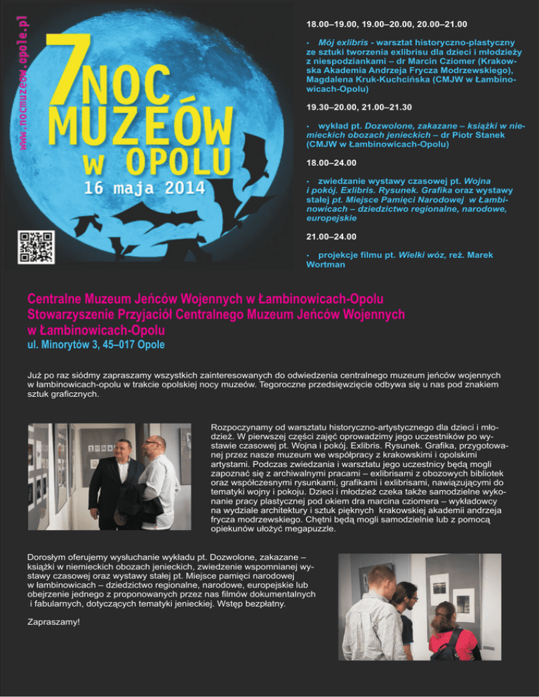 18.00–19.00, 19.00–20.00, 20.00–21.00 Mój ? exlibris - warsztat historyczno-plastyczny ze sztuki tworzenia exlibrisu dla dzieci i m³odzie¿y z niespodziankami – dr Marcin Cziomer (Krakowska Akademia Andrzeja Frycza Modrzewskiego), Magdalena Kruk-Kuchciñska (CMJW w £ambinowicach-Opolu) 19.30–20.00, 21.00–21.30 pt. Dozwolone, zakazane – ksi¹¿ki w niemieckich obozach jenieckich – dr Piotr Stanek (CMJW w £ambinowicach-Opolu) ? wyk³ad 18.00–24.00 ? zwiedzanie wystawy czasowej pt. Wojna i pokój. Exlibris. Rysunek. Grafika oraz wystawy sta³ej pt. Miejsce Pamiêci Narodowej w £ambinowicach – dziedzictwo regionalne, narodowe, europejskie 21.00–24.00 ? projekcje filmu pt. Wielki wóz, re¿. Marek Wortman Centralne Muzeum Jeñców Wojennych w £ambinowicach-Opolu Stowarzyszenie Przyjació³ Centralnego Muzeum Jeñców Wojennych w £ambinowicach-Opolu ul. Minorytów 3, 45–017 Opole Ju¿ po raz siódmy zapraszamy wszystkich zainteresowanych do odwiedzenia centralnego muzeum jeñców wojennych w ³ambinowicach-opolu w trakcie opolskiej nocy muzeów. Tegoroczne przedsiêwziêcie odbywa siê u nas pod znakiem sztuk graficznych. Rozpoczynamy od warsztatu historyczno-artystycznego dla dzieci i m³odzie¿. W pierwszej czêœci zajêæ oprowadzimy jego uczestników po wystawie czasowej pt. Wojna i pokój. Exlibris. Rysunek. Grafika, przygotowanej przez nasze muzeum we wspó³pracy z krakowskimi i opolskimi artystami. Podczas zwiedzania i warsztatu jego uczestnicy bêd¹ mogli zapoznaæ siê z archiwalnymi pracami – exlibrisami z obozowych bibliotek oraz wspó³czesnymi rysunkami, grafikami i exlibrisami, nawi¹zuj¹cymi do tematyki wojny i pokoju. Dzieci i m³odzie¿ czeka tak¿e samodzielne wykonanie pracy plastycznej pod okiem dra marcina cziomera – wyk³adowcy na wydziale architektury i sztuk piêknych krakowskiej akademii andrzeja frycza modrzewskiego. Chêtni bêd¹ mogli samodzielnie lub z pomoc¹ opiekunów u³o¿yæ megapuzzle. Doros³ym oferujemy wys³uchanie wyk³adu pt. Dozwolone, zakazane – ksi¹¿ki w niemieckich obozach jenieckich, zwiedzenie wspomnianej wystawy czasowej oraz wystawy sta³ej pt. Miejsce pamiêci narodowej w ³ambinowicach – dziedzictwo regionalne, narodowe, europejskie lub obejrzenie jednego z proponowanych przez nas filmów dokumentalnych i fabularnych, dotycz¹cych tematyki jenieckiej. Wstêp bezp³atny. Zapraszamy!