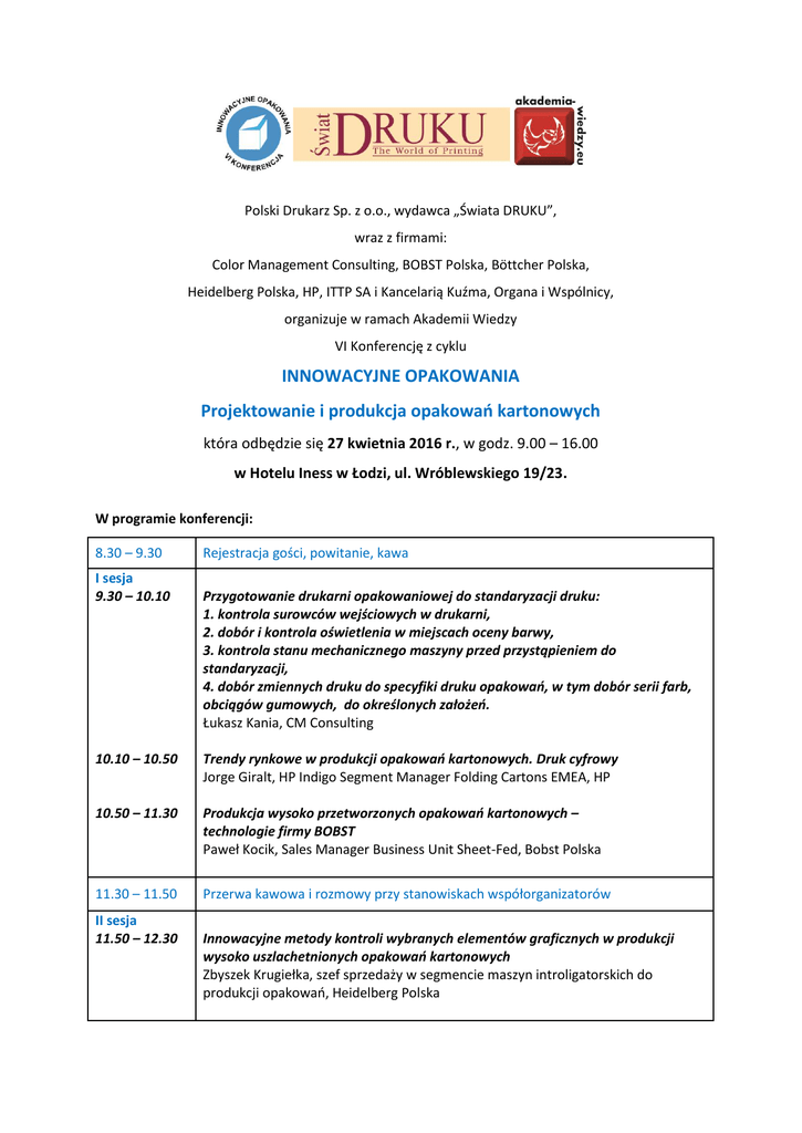 Polski Drukarz Sp. z o.o., wydawca „Świata DRUKU”, wraz z firmami: Color Management Consulting, BOBST Polska, Böttcher Polska, Heidelberg Polska, HP, ITTP SA i Kancelarią Kuźma, Organa i Wspólnicy, organizuje w ramach Akademii Wiedzy VI Konferencję z cyklu INNOWACYJNE OPAKOWANIA Projektowanie i produkcja opakowań kartonowych która odbędzie się 27 kwietnia 2016 r., w godz. 9.00 – 16.00 w Hotelu Iness w Łodzi, ul. Wróblewskiego 19/23. W programie konferencji: 8.30 – 9.30 I sesja 9.30 – 10.10 Rejestracja gości, powitanie, kawa Przygotowanie drukarni opakowaniowej do standaryzacji druku: 1. kontrola surowców wejściowych w drukarni, 2. dobór i kontrola oświetlenia w miejscach oceny barwy, 3. kontrola stanu mechanicznego maszyny przed przystąpieniem do standaryzacji, 4. dobór zmiennych druku do specyfiki druku opakowań, w tym dobór serii farb, obciągów gumowych, do określonych założeń. Łukasz Kania, CM Consulting 10.10 – 10.50 Trendy rynkowe w produkcji opakowań kartonowych. Druk cyfrowy Jorge Giralt, HP Indigo Segment Manager Folding Cartons EMEA, HP 10.50 – 11.30 Produkcja wysoko przetworzonych opakowań kartonowych – technologie firmy BOBST Paweł Kocik, Sales Manager Business Unit Sheet-Fed, Bobst Polska 11.30 – 11.50 Przerwa kawowa i rozmowy przy stanowiskach współorganizatorów II sesja 11.50 – 12.30 Innowacyjne metody kontroli wybranych elementów graficznych w produkcji wysoko uszlachetnionych opakowań kartonowych Zbyszek Krugiełka, szef sprzedaży w segmencie maszyn introligatorskich do produkcji opakowań, Heidelberg Polska 12.30 – 13.10 Lakierować – ale czym? Możliwości i ograniczenia w stosowaniu płyt lakierujących Robert Szarkowski, Sales Manager, Böttcher Polska 13.10 – 13.30 Przerwa kawowa i rozmowy przy stanowiskach współorganizatorów III sesja 13.30 – 14.10 Nowa jakość w rozwiązaniach dla postpressu – ITTP SA Marek Migdalski, wiceprezes zarządu, ITTP SA 14.10 – 14.50 Jak chronić własne wzory opakowań – zagadnienia praktyczne Maurycy Organa, radca prawny, wspólnik kancelarii Kuźma, Organa i Wspólnicy Spółka Partnerska Radców Prawnych 14.50 – 16.00 Lunch. Rozmowy indywidualne z ekspertami Patronat nad konferencją objęły: Polska Izba Druku, Polska Izba Opakowań i Polskie Bractwo Kawalerów Gutenberga. Koszt udziału w konferencji: – dla producentów opakowań kartonowych: 300 zł brutto, – dla dostawców dla branży: 600 zł brutto. Cena obejmuje: udział w konferencji, materiały konferencyjne, przerwy kawowe, lunch, parking (ograniczona liczba miejsc postojowych). Rejestracja do dnia 15 kwietnia 2016 r.: http://www.akademia-wiedzy.eu/Konferencje/Poligrafia/Innowacyjne-opakowania-2016/Regulamini-formularze W razie wszelkich pytań prosimy o kontakt: tel. 42 687 12 92 [email protected] W imieniu organizatorów serdecznie zapraszamy Państwa do udziału w konferencji!