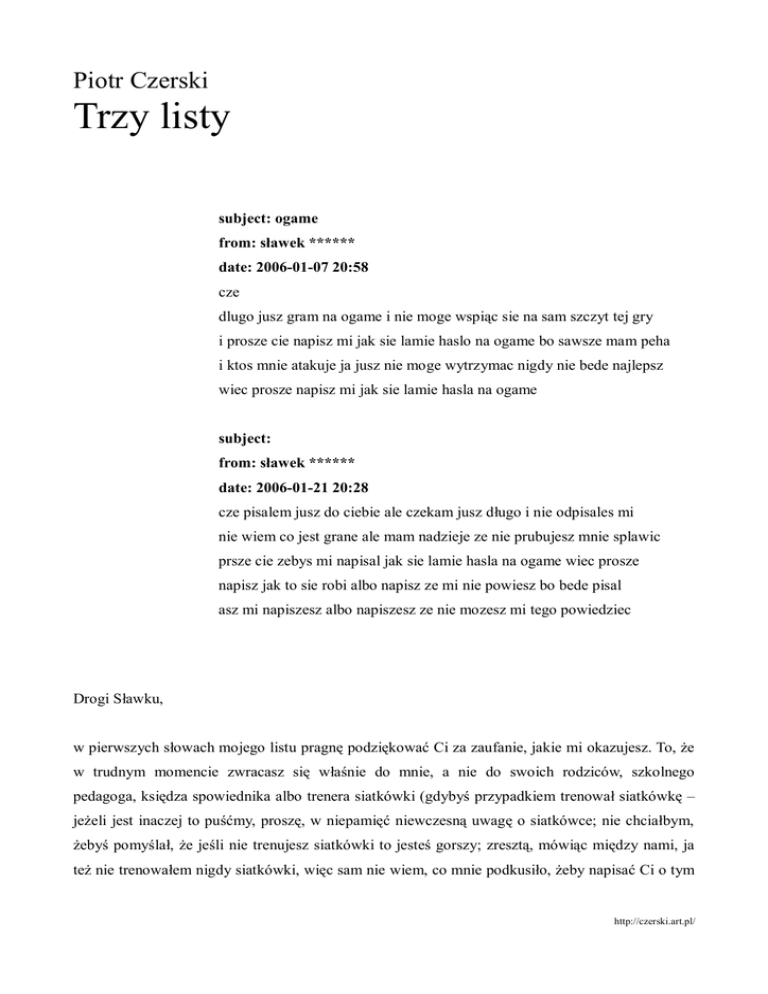 Piotr Czerski Trzy listy subject: ogame from: sławek ****** date: 2006-01-07 20:58 cze dlugo jusz gram na ogame i nie moge wspiąc sie na sam szczyt tej gry i prosze cie napisz mi jak sie lamie haslo na ogame bo sawsze mam peha i ktos mnie atakuje ja jusz nie moge wytrzymac nigdy nie bede najlepsz wiec prosze napisz mi jak sie lamie hasla na ogame subject: from: sławek ****** date: 2006-01-21 20:28 cze pisalem jusz do ciebie ale czekam jusz długo i nie odpisales mi nie wiem co jest grane ale mam nadzieje ze nie prubujesz mnie splawic prsze cie zebys mi napisal jak sie lamie hasla na ogame wiec prosze napisz jak to sie robi albo napisz ze mi nie powiesz bo bede pisal asz mi napiszesz albo napiszesz ze nie mozesz mi tego powiedziec Drogi Sławku, w pierwszych słowach mojego listu pragnę podziękować Ci za zaufanie, jakie mi okazujesz. To, że w trudnym momencie zwracasz się właśnie do mnie, a nie do swoich rodziców, szkolnego pedagoga, księdza spowiednika albo trenera siatkówki (gdybyś przypadkiem trenował siatkówkę – jeżeli jest inaczej to puśćmy, proszę, w niepamięć niewczesną uwagę o siatkówce; nie chciałbym, żebyś pomyślał, że jeśli nie trenujesz siatkówki to jesteś gorszy; zresztą, mówiąc między nami, ja też nie trenowałem nigdy siatkówki, więc sam nie wiem, co mnie podkusiło, żeby napisać Ci o tym http://czerski.art.pl/ trenerze – ale ze mną to tak zawsze jest, że najpierw coś powiem, a później muszę odkręcać: co w sercu, to na języku, jak to mówią, chociaż na przykład jedna moja była narzeczona mówiła po prostu, że mógłbym czasem zamknąć mordę, zwłaszcza w towarzystwie), że więc zwracasz się do mnie – to i wyróżnienie, i odpowiedzialność. Szczerze mówiąc: nie zrozum mnie źle, ale wolałbym, abyś w przyszłości ze swoimi problemami zwracał się do kogoś innego. A jeżeli jesteś przypadkiem podwójnym sierotą skazanym na ostracyzm w grupie rówieśniczej i prześladowania ze strony dyrekcji domu dziecka – spróbuj sobie może wyhodować fasolkę na wilgotnej lignince i do tej fasolki mów, i z fasolką dziel się swoimi małymi radościami i troskami powszednimi. Tylko pamiętaj, żeby podlewać regularnie i nie nazbyt obficie. I że to zielone od północy, to mech, a nie fasolka. Skoro jednak zwróciłeś się do mnie, Sławku – odpowiadam. Przyznaję, że nie wszystko w Twoim liście było dla mnie zupełnie zrozumiałe: właściwie na początku pomyślałem, że masz – jak mówi młodzież – spruty berecik, i dopiero po dłuższej chwili zrozumiałem o co mnie pytasz, i że stosujesz metafory. Poetę prędzej czy później zawsze wyczuję, a już neolingwistę to jak zły szeląg we własnej kieszeni. Tak więc, Sławku – wiedz, że rozumiem Cię dobrze. Zresztą któż z nas, ludzi wrażliwych i ambitnych, nie zna tego dojmującego smutku, który pojawia się niespodziewanie, a najczęściej w jesienne popołudnia, tej rzewnej melancholii, która każe nam stanąć przy oknie i obserwować swoją twarz w lustrzanym odbiciu, swoją twarz rozkołysaną strugami deszczu spływającymi po szybie, twarz wilgotną tym deszczem i – powiedzmy to sobie szczerze – nie tylko deszczem wilgotną. To żaden wstyd; nieprawda, że mężczyzna może płakać tylko po śmierci ojca, pierworodnego syna i ulubionego psa (pod warunkiem, że nie był pudlem ani pekińczykiem). Łez nie trzeba się wstydzić. Nawet Marek Hłasko w Pięknych dwudziestoletnich pisze: tak więc Hania odeszła, a ja zostałem (...). Wracałem z knajpy o piątej nad ranem, zalany łzami. Ba! – podobno płakał też Hemingway, chociaż tylko przy zapaleniu spojówek. Co do Bukowskiego zdania są podzielone. Rozumiem Cię więc, Sławku – bo któż z nas, pytam, nie zna tego smutku, który chwyta za kark niespodziewanie swoją szorstką, zimną dłonią; smutku, który każe stanąć przy oknie i wyszeptać cicho: tak długo już gram, od tylu trudzę się lat, a wciąż nie mogę wspiąć się na szczyt? Sławku – pozwól, że coś Ci powiem. Tak, jak starszy brat mówi czasem młodszemu. W każdym razie na filmach, bo w życiu to nie wiem: mam tylko siostrę (a Ty, Sławku? Czy masz siostrę? A ile http://czerski.art.pl/ ma lat? A tak między nami mówiąc – myślałeś czasem o tym, jakby to było, co? Tak z siostrą, co? Przyznaj się, mały świntuszku!). Powiem Ci, chociaż wiem, że będziesz się przeciwko temu buntował – bo wszyscy się buntują. W każdym razie lewicowcy. Czyli młodzież, bo kto za młodu nie jest socjalistą, ten na starość trąci – ja na przykład już zaczynam, a mam przecież zaledwie dwadzieścia pięć lat. Zaledwie? Jim Morrison w moim wieku żył życie żywej legendy. Aleksander Macedoński w ćwierćwieczu żywota władał połową ówczesnego świata. A mój ojciec, kiedy miał lat dwadzieścia pięć, był już moim ojcem. Pozwól to sobie powiedzieć, Sławku. Wiem, jak się czujesz i wiem, co myślisz. Wydaje Ci się, że ktoś ciągle Cię atakuje, bo masz pecha – tak napisałeś; czujesz więc, że ilekroć staniesz na nogach, ilekroć poczujesz się nieco pewniej i pełniej odetchniesz – tylekroć ktoś rzuci się na Ciebie, spróbuje przewrócić, kopnie w kostkę. A Ty podnosisz się wciąż i wciąż, a oni wciąż i wciąż Cię atakują – aż wreszcie nadchodzi ten poranek, w którym czujesz, że dłużej już nie możesz, że dalsza walka nie ma sensu, że nigdy nie będziesz najlepszy, ba – nigdy nie będziesz nawet dobry; więcej jeszcze – nigdy nie będziesz nawet przeciętny. I w takiej chwili wyciągasz rękę właśnie do mnie – i to mnie pytasz: jak żyć? Sławku. Będę z Tobą szczery, jak brat z bratem. Tu nie chodzi o pecha. Tu chodzi o ludzi, o społeczeństwo, o innych. Bo inni to piekło, jak pisał Sartre. Kimże jest człowiek? Człowiek, Sławku, jest wilkiem – dla drugiego człowieka. Bestią, kierowaną przez chciwość i str