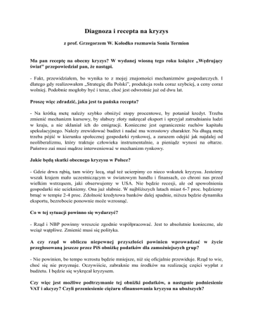 Diagnoza i recepta na kryzys z prof. Grzegorzem W. Kołodko rozmawia Sonia Termion Ma pan receptę na obecny kryzys? W wydanej wiosną tego roku książce „Wędrujący świat” przepowiedział pan, że nastąpi. - Fakt, przewidziałem, bo wynika to z mojej znajomości mechanizmów gospodarczych. I dlatego gdy realizowałem „Strategię dla Polski”, produkcja rosła coraz szybciej, a ceny coraz wolniej. Podobnie mogłoby być i teraz, choć jest odwrotnie już od dwu lat. Proszę więc zdradzić, jaka jest ta pańska recepta? - Na krótką metę należy szybko obniżyć stopy procentowe, by potaniał kredyt. Trzeba zmienić mechanizm kursowy, by słabszy złoty nakręcał eksport i sprzyjał zatrudnianiu ludzi w kraju, a nie skłaniał ich do emigracji. Konieczne jest ograniczenie ruchów kapitału spekulacyjnego. Należy zrewidować budżet i nadać mu wzrostowy charakter. Na długą metę trzeba pójść w kierunku społecznej gospodarki rynkowej, a zarazem odejść jak najdalej od neoliberalizmu, który traktuje człowieka instrumentalnie, a pieniądz wynosi na ołtarze. Państwo zaś musi mądrze interweniować w mechanizm rynkowy. Jakie będą skutki obecnego kryzysu w Polsce? - Gdzie drwa rąbią, tam wióry lecą, stąd też ucierpimy co nieco wskutek kryzysu. Jesteśmy wszak krajem mało uczestniczącym w światowym handlu i finansach, co chroni nas przed wielkim wstrząsem, jaki obserwujemy w USA. Nie będzie recesji, ale od spowolnienia gospodarki nie uciekniemy. Ona już słabnie. W najbliższych latach miast 6-7 proc. będziemy brnąć w tempie 2-4 proc. Zdolność kredytowa banków dalej spadnie, niższa będzie dynamika eksportu, bezrobocie ponownie może wzrosnąć. Co w tej sytuacji powinno się wydarzyć? - Rząd i NBP powinny wreszcie zgodnie współpracować. Jest to absolutnie konieczne, ale wciąż wątpliwe. Zmienić musi się polityka. A czy rząd w obliczu niepewnej przyszłości powinien wprowadzać w życie przegłosowaną jeszcze przez PiS obniżkę podatków dla zamożniejszych grup? - Nie powinien, bo tempo wzrostu będzie mniejsze, niż się oficjalnie przewiduje. Rząd to wie, choć się nie przyznaje. Oczywiście, zabraknie mu środków na realizację części wypłat z budżetu. I będzie się wykręcał kryzysem. Czy więc jest możliwe podtrzymanie tej obniżki podatków, a następnie podniesienie VAT i akcyzy? Czyli przeniesienie ciężaru sfinansowania kryzysu na uboższych? - Do tego właśnie zmierza rząd. To typowe rozwiązanie neoliberalne. Ale obraca się ono także przeciw wzrostowi i równowadze. Rząd chce teraz obniżać podatki po to, by potem wymuszać cięcie wydatków, zwłaszcza socjalnych. Obecną ekipę uważa pan za przedstawicieli neoliberalizmu? - Po części. Obecna ekipa jest mieszaniną, taką koalicją kota z psem. Jej wadą jest brak wizji, zajmowanie się sprawami drugo- i trzeciorzędnymi. Ale nie jestem rozczarowany, gdyż nie miałem wielkich oczekiwań co do tej ekipy. Przyznam wszak, że fundamentalnych błędów jeszcze nie popełniła. Pewnie z lenistwa. Czyli w Polsce nie mamy systemu neoliberalnego. Czy to za daleko posunięty wniosek? - System gospodarczy Polski jest bliższy neoliberalizmowi niż społecznej gospodarce rynkowej. Ale na pewno nie jest to czysty neoliberalizm, bo inne siły polityczne – i w rządzie, i poza nim – do tego nie dopuściły. I chwała im za to. W swojej książce pisze pan, że w sytuacji kryzysowej dojdzie do przewartościowania w myśleniu, które może ostatecznie pogrzebać neoliberalizm. Czy reakcja władz USA na kryzys systemu finansowego jest właściwa? - Nie tędy droga. Nie mogą nas z kryzysu wyciągnąć ci, którzy do niego doprowadzili. To tak jakby podpalaczy zatrudniać w straży pożarnej. To głęboki kryzys, a tzw. plan Paulsona jest klajstrowaniem dziur, by zmniejszyć zamęt przed wyborami prezydenckimi. To tak jakby panienka, której wyskoczył pryszcz, przed randką przykryła go sobie pudrem i uznała, że znowu jest piękna. To co robić? Aby poradzić sobie z tym, co jest „pod spodem” – z prawdziwą przyczyną kryzysu – należy przebudować sposób funkcjonowania gospodarki: wartości, instytucje, politykę. W książce „Wędrujący świat” proponuję pójść w kierunku nowego pragmatyzmu, który nie myli środków z celami rozwoju. Polega on na przesuwaniu akcentów z „mieć” na „być”, na trosce o zrównoważony rozwój (nie tylko finansowy i handlowy, ale też społeczny i ekologiczny), na twórczym kojarzeniu potęg rynku i państwa. Wierzy pan, że ten tak nielubiany przez pana neoliberalizm upadnie? - Już upada. Ale i próbuje się przefarbować. To są liski chytruski. Widać to również w Polsce. Jak ktoś chce zobaczyć, jak wyglądają, niech włączy telewizor i posłucha tych wszystkich "ekonomistów", analityków, dziennikarzy, którzy niedawno mówili coś dokładnie odwrotnego niż teraz! 2 A łączy pan jakieś nadzieje na pogrzebanie tego systemu z ewentualnym zwycięstwem Obamy? - To zwycięstwo jest pewne i można w nim pokładać nadzieje. Barack Obama ma lepsze rozpoznanie mechanizmów gospodarczych i o klasę lepszą ekipę niż jego konkurent. A czy nowa administracja sprosta wyzwaniom? Zobaczymy. Jeśli oprze się na nowym pragmatyzmie, to tak. Chciałam też pana zapytać o wypowiedź dla „Przeglądu”, że najważniejsze to mieć rację. A ja się zastanawiam, czy nie ważniejsze jest bycie skutecznym. - Dla mnie ważne jest posiadanie racji, bo zajmuję się nauką, nie polityką. Ale w polityce rzeczywiście najważniejsza jest skuteczność. Najlepiej, gdy posiadanie racji i skuteczność idą w parze. Jak to robić, pokazuję w "Wędrującym świecie". Rozumiem, że do polityki nie zamierza pan wracać. - W polityce już swoje zrobiłem i to z niezłym skutkiem. Prasa donosi, że doradza pan SLD i podobno będzie jeździć po kraju, by objaśniać działaczom przyczyny kryzysu. - Gdy klub poselski 